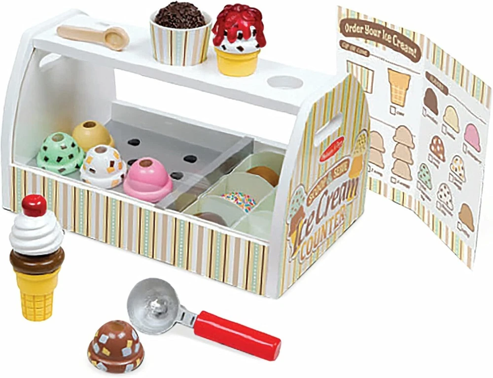 Style: Scoop & Serve Ice Cream Counter ALL-INCLUSIVE ICE CREAM PLAY SET: The Melissa & Doug Wooden Scoop & Serve Ice Cream Counter includes wooden ice cream counter, eight ice cream scoops, six toppings, two cones, cup, scooper, tongs, wooden spoon, and six pretend dollar 1 bills. 28-PIECE ICE CREAM STATION: This 28-piece wooden ice cream play set features a scooper that fits into a hole on top of the scoops to lift, stack, and release the scoops. REPLICATES THE ENTIRE EXPERIENCE: Our ice cream play set with toppings also includes a reusable menu, so children can take orders, pay with play money and serve up deliciousness, just like their favorite ice cream shop. GREAT GIFT FOR AGES 3 AND UP: The Wooden Scoop & Serve Ice Cream Counter makes a great gift for ages 3 and up. For even more screen-free fun, consider adding the Melissa & Doug Wooden Make-a-Cake mixer set. “THE GOLD STANDARD IN CHILDHOOD PLAY”: For more than 30 years, Melissa & Doug has created beautifully designed imagination- and creativity-sparking products that NBC News called “the gold standard in early childhood play.” Product information Product Dimensions 7.7 x 8.6 x 13.6 inches Item Weight 4.69 pounds Country of Origin China Item model number 9286 Manufacturer recommended age 36 months - 6 years