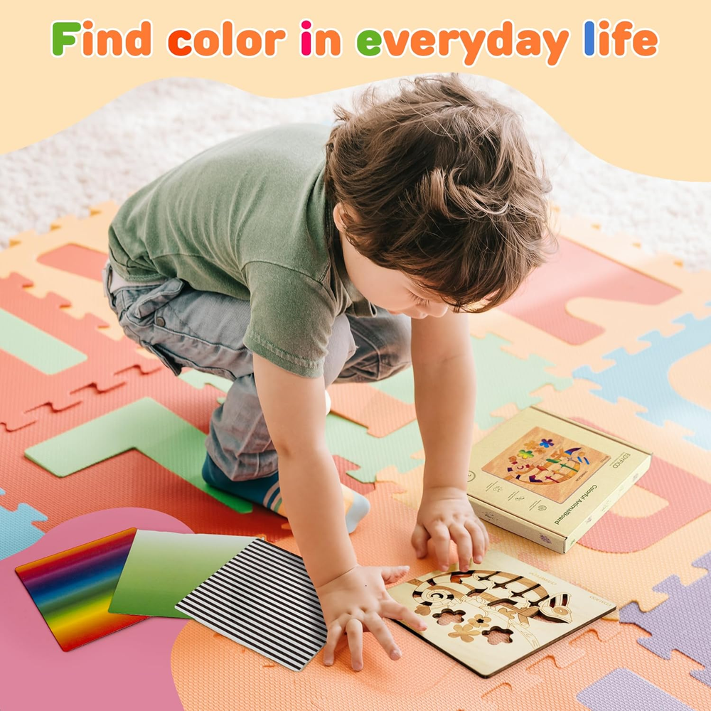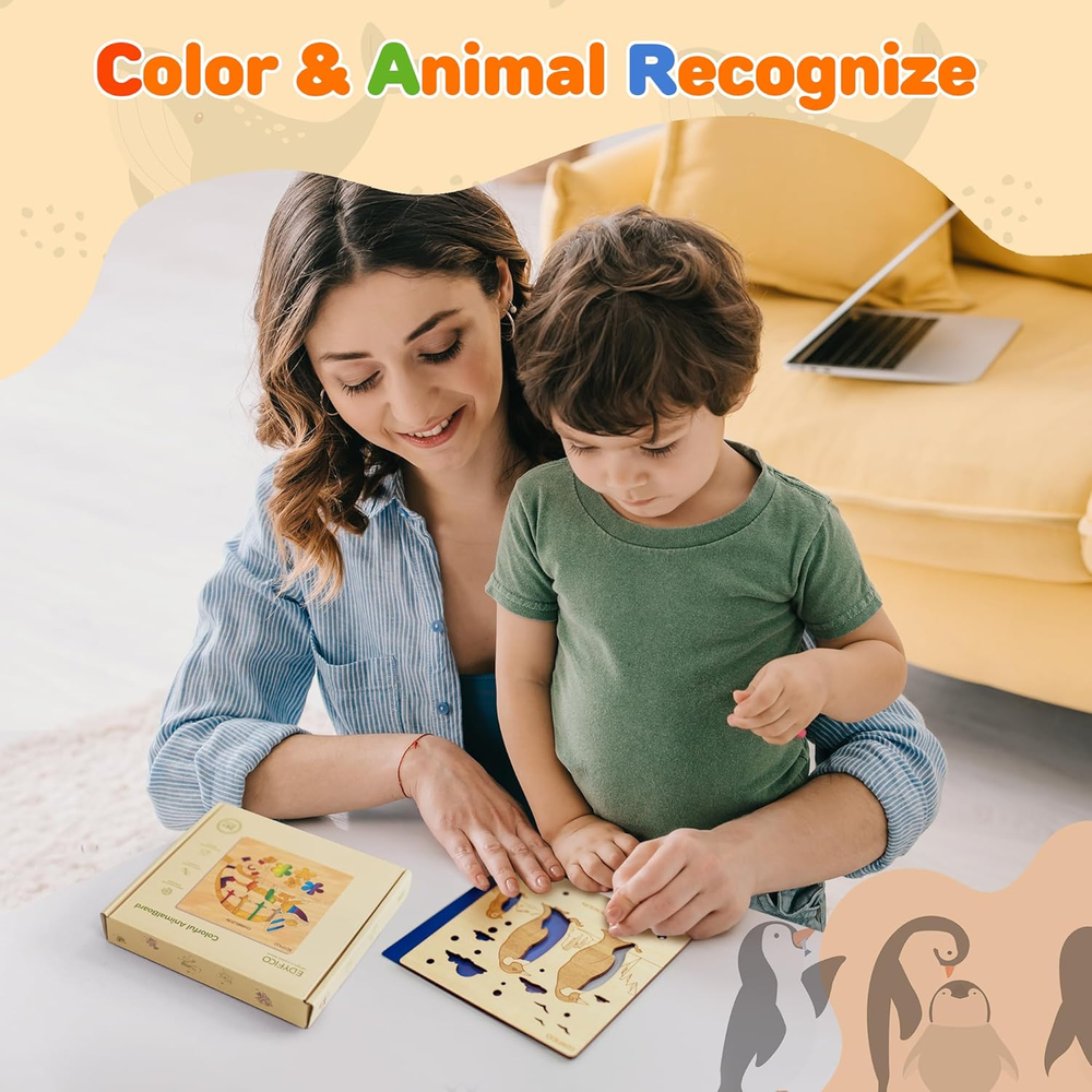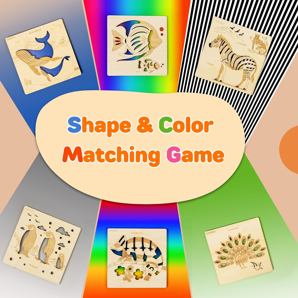 2 IN 1 MONTESSORI EDUCATIONAL TOY -This learning toys for toddlers 1-3 set includes 6 polished, smooth wooden boards (12*12mm) featuring detailed animal prints, along with 3 brightly colored cards. This educational toy helps children learn about animals and experience vivid visual changes while matching the animal-patterned wooden boards with the colourful cards DELIGHTFUL FUN BEYOND JUST MATCHING GAMES -Our montessori toys for 2 year old provide more than just animal pattern matching. Kids can explore the fun of light and shadow using the unique openwork design of the wooden pieces. They can trace the shadows and even draw their favourite animals, stimulating creativity and imagination OUTDOOR PARENT-CHILD INTERACTIVE TOY -Suitable for children aged 1 to 3 years, this wooden shape color sorter is small, lightweight, and portable, making it perfect for home, school, parks, or on-the-go. Children can decorate the peacock's tail with flowers or leaves in the park, while parents can join in to enhance the parent-child bond NATURAL OUTDOOR TOYS -This set features animal-themed educational toys, including penguins, whales, chameleons, tropical fish, zebras, and peacocks, all crafted from natural wood. The delicate and cute animal designs capture children's attention, and these sensory toys outdoor exploration, promoting a healthy, screen-free experience BUY WITH CONFIDENCE -EDYFICO wooden stem toys are non-toxic, durable, and feature a rounded corner design for safe play. These high-quality toys are perfect for toddlers' early education. The accompanying instruction booklet provides matching ideas and game suggestions, accessible via a QR code for added convenience Product Description