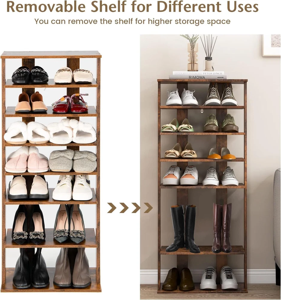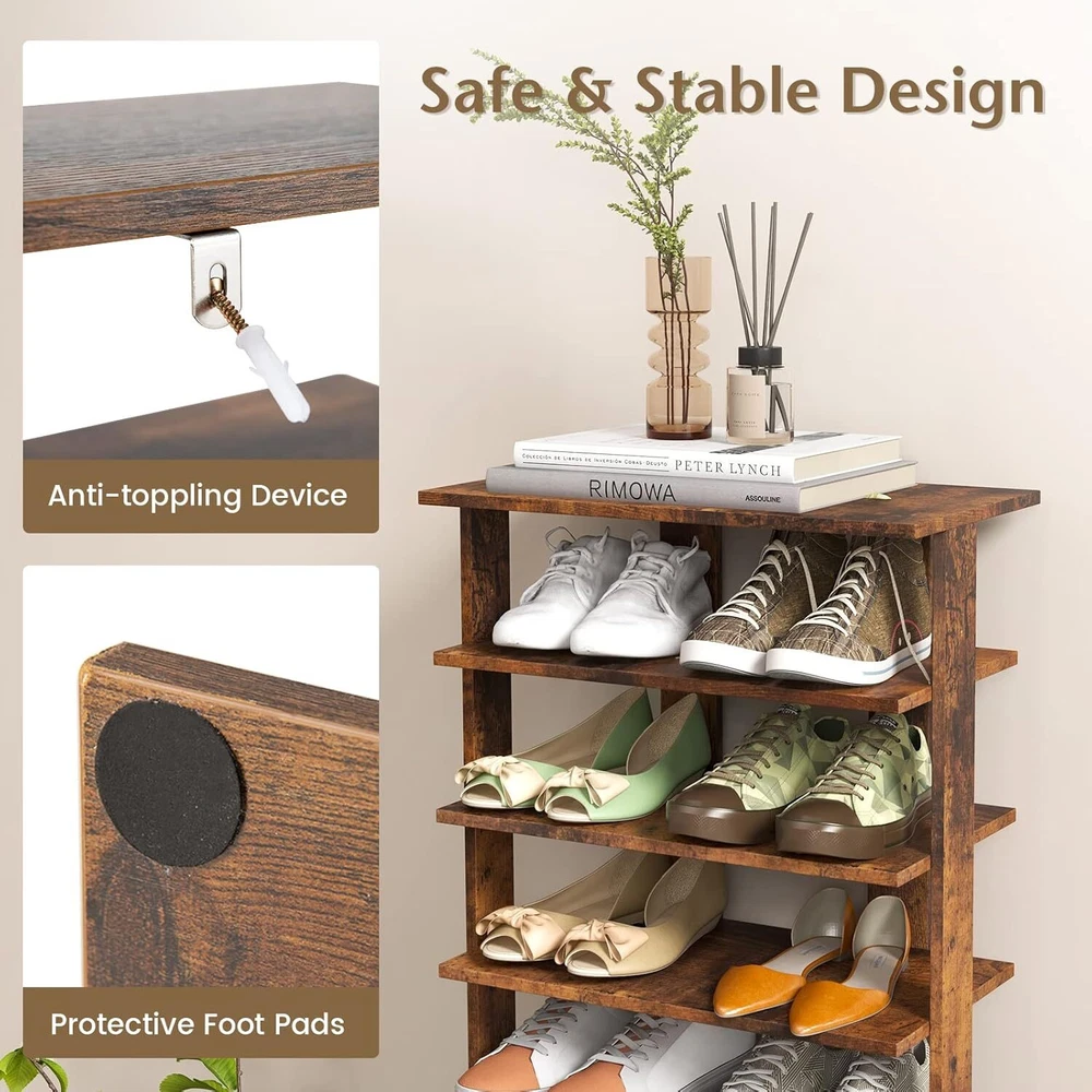 Maximize the Vertical Storage Space: Measuring 10" x 18.5" x 43.5" (L x W x H), this shoe rack is perfect for small spaces like front doors, walk-in closets, or entryways. Customize the shelves to store shoes, boots, and more with ease. Elegantly Designed and Durable: Built from high-quality particleboard, this shoe organizer is sturdy and long-lasting. Each shelf supports up to 11 lbs, while the reinforced bottom ensures stability on any surface. Adjustable Height Shoe Shelf: Features shelves of varying heights: the bottom two layers are 7.5" tall for heels, while the top five shelves are 5" high, ideal for flats, slippers, or sneakers. Total weight: 25 lbs. Versatile Shelf for Multi-Purpose Use: Beyond shoes, this rack is perfect for organizing bathroom essentials like towels, shampoo, and bathrobes. It also works as a plant stand or bookshelf for your balcony or living room. Easy Assembly with Clear Instructions: Comes with pre-labeled parts and a simple instruction manual for hassle-free setup. No tools or expertise required—ready to use in minutes. Product Description
