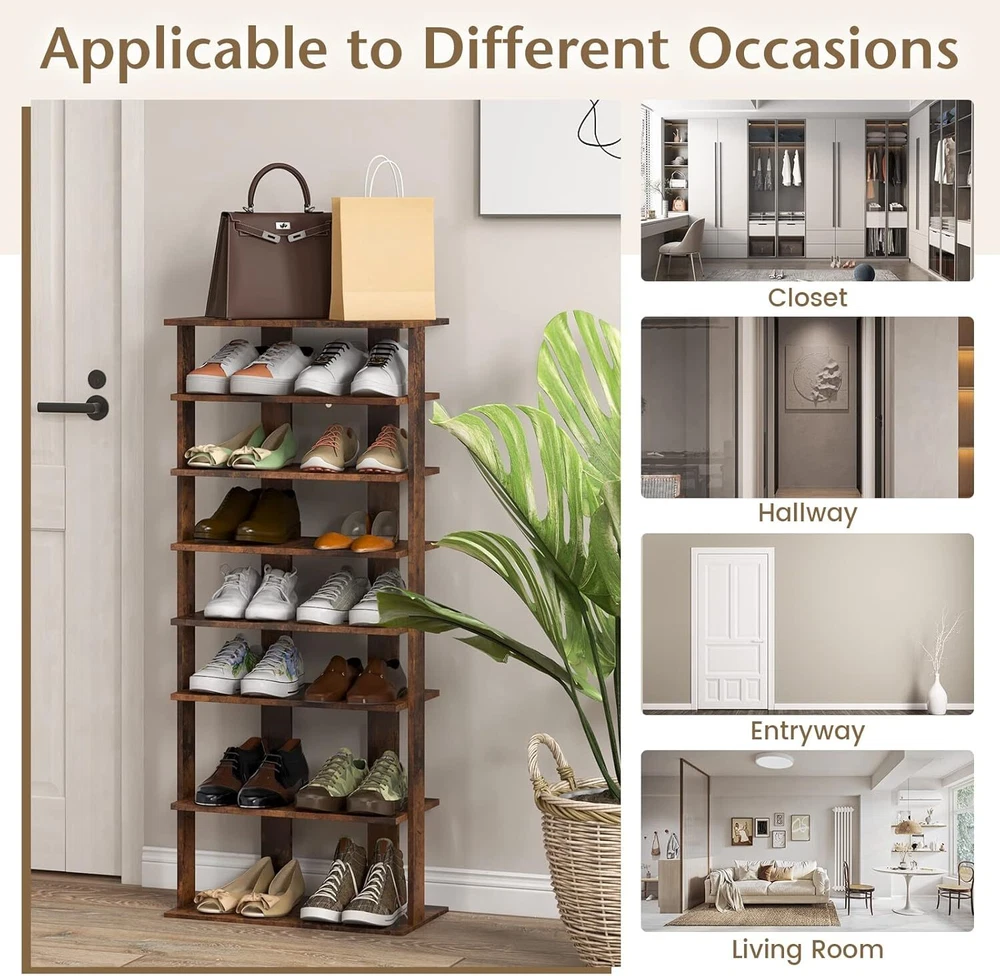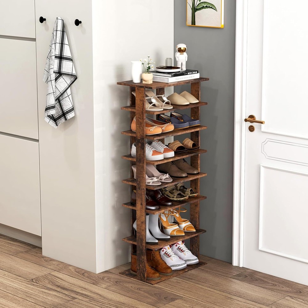 UPC: 711181696035 Item Length: Does not apply Assembly Required: Yes Specific Uses For Product: Shoes Included Components: Instruction Manual Weight capacity: Maximum weight: 11 Pounds Finish Type: Coated Number of Items: 1 Furniture Finish: Brown Back Style: Backless Type: Does not apply Product Name: Vertical Shoe Rack Color: Rustic Brown Item Height: Does not apply Finish types: Coated Size: 10" x 18.5" x 43.5" Room Type: Bathroom, Living Room Recommended Uses For Product: Shoe gtin13: 711181696035 Min Required Door Width: 18.5 Inches Installation Type: Freestanding Material Engineered Wood: Mounting Type Floor Mount Shelf Thickness: 0.75 Inches Product Care Instructions: Wipe with Dry Cloth Item Width: Does not apply Style: Modern,Rustic,Versatile Maximum recommended load: 11 Pounds Brand: Does not apply Weight Limit: 11 Pounds Number of Shelves: 8 Shelf Type Tiered Shelf: Shape Rectangular Product Dimensions: 10"D x 18.5"W x 43.5"H Special Feature: Large Capacity Item Weight: 25 pounds