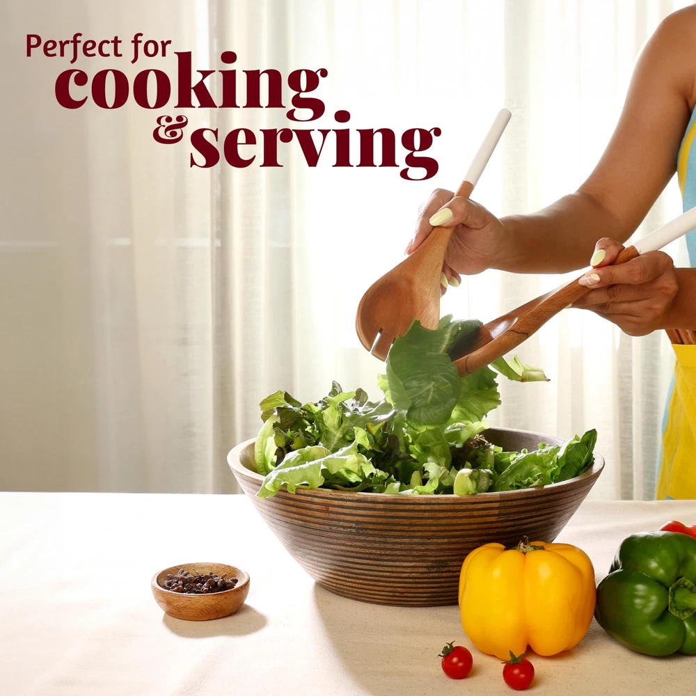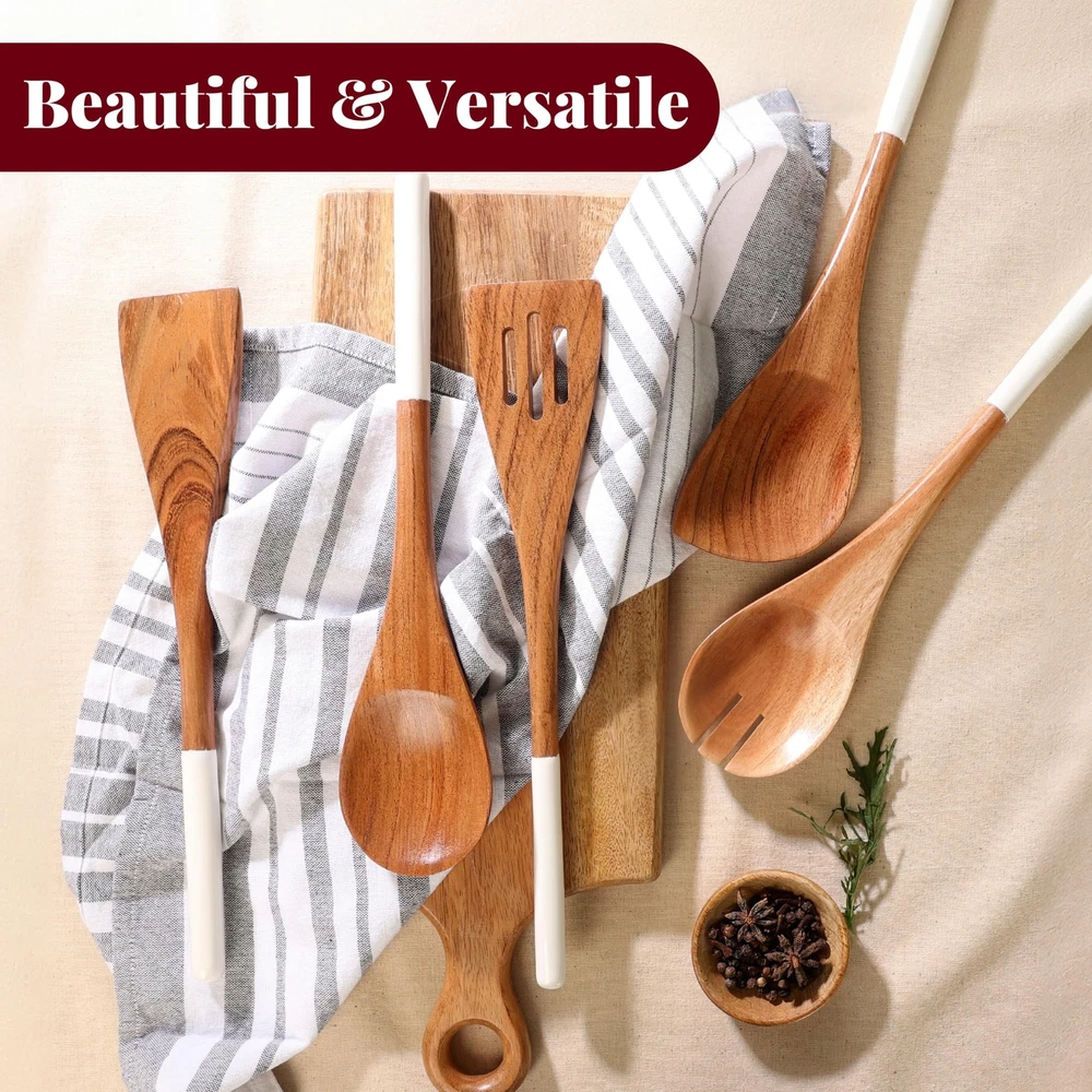 Enjoy cooking with passion and love with the homely touch of our 5 piece white wooden kitchen utensils set for cooking which add value to any dish you cook and the mango wood gives it a vintage yet stylish look. The set includes wooden spoons, spatula, corner spoon, serving fork and slotted spatula or turner. The attractive, smooth and comfortable to hold handles synchronizes well with the entire look and make it easier to stir, toss, serve and cook. These heat and water resistant wooden cooking spoons are highly durable and are made with the intention to last long to help you cook and serve your favorite cuisines. This cookware set is so eye-catching that they not only accessorize your kitchen but also creates great convenience while cooking and brings a stylish touch to even the most boring recipe. Good quality and great price compliment this wooden spoons for cooking that there is no need for you to put a second thought before buying it. Wooden salad servers negates all other materials like melting plastic, rusting metal or toxic silicone which are very hazardous for health. We also provide you with lifetime guarantee for our product to ensure 100% satisfaction. Upgrade the way of cooking with our non-stick, ecological, recyclable, premium quality and durable cooking utensils at the earliest. KITCHENWARE SET- Add elegance to your kitchen with this cooking spoons server or wooden spoons cooking utensils set of 5 that includes serving spoon, spatula or turner, slotted spatula, fork and corner sraper spoon for better reach in pans and pots. The kitchenware set is an excellent idea for christmas gifts for her. MODERN DESIGN- A new way to upgrade your kitchen with these nonstick and eco friendly wooden spoons or wooden spatula for cooking which are the perfect christmas kitchen essentials, and is just the right way to cook your favourite delicacies. The long handles of wood cooking utensils set are perfect for stirring, serving, mixing, tossing and tasting. HEALTHY AND SAFE COOKING- Our cooking utensils set or wooden utensil set are very essential tools to have and will not react with food or beverages. BPA free! HIGH QUALITY- Made of mango wood that is durable, water resistant and long lasting making these beautiful utensils or serving spoons useful for food preparation, serving and for gifts as well. Saves your cookware from any kind of scratch or damage while cooking and it is completely heat resistant. The cooking utensils also make for the perfect christmas gifts for women. CARE- Easy to clean and we recommend hand washing these kitchen utensils set or wood spoons for cooking as its handmade with great care. Avoid Dishwasher.