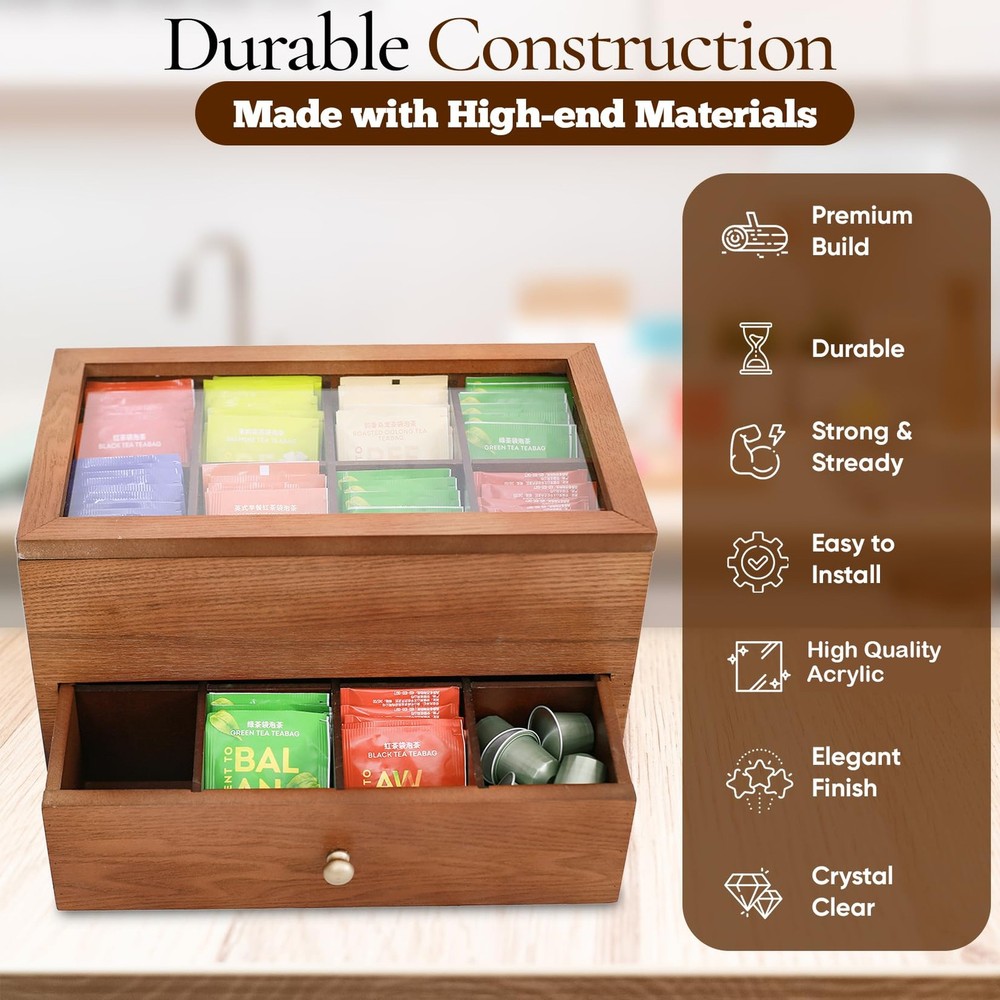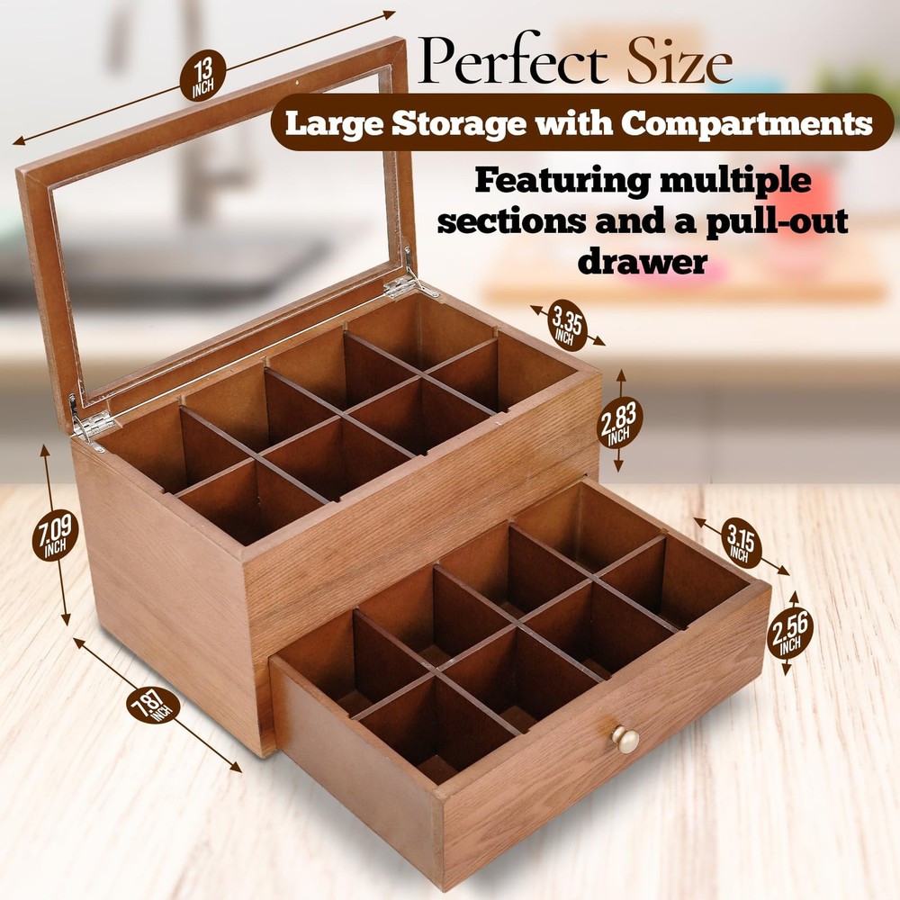 Keep your tea collection beautifully organized with this Wooden Tea Organizer Box with Drawer. Designed with multiple compartments and a pull-out drawer, this versatile tea storage chest is perfect for teabags, loose tea leaves, coffee, matcha, and small accessories. Whether displayed on your kitchen counter, tucked inside a cabinet, or placed on a shelf, this tea caddy doubles as both a practical storage solution and a stylish piece of decor. Made from durable wood with a clear top lid, this tea box allows you to easily view your selection while keeping your teabags fresh and tidy. The pull-out drawer provides extra space for spoons, matcha whisks, accessories, or even small jars, tins, and canisters. Its large yet compact design makes it ideal for small kitchens, tea stations, or office counters. Perfect as a tea organizer for daily use or as a thoughtful gift, this tea chest combines functionality with aesthetic charm. Whether you enjoy Japanese tea ceremonies, a cozy coffee station, or gothic-inspired kitchen decor, this wooden organizer brings order and elegance to your home. Elegant Wooden Tea Organizer Box – Crafted from rustic wood with a clear lid, this tea bag organizer adds a warm, decorative touch to your kitchen, countertop or cabinet. Perfect for storing tea bags, loose leaf tea, coffee or matcha in one stylish box. Large Storage with Drawer & Compartments – Featuring 16 divided sections on top and an extra pull-out drawer, this tea chest provides plenty of room for teabags, sugar packets, honey sticks, stirrers or small jars and tins, keeping your tea station neat and easy to browse. Versatile Tea & Coffee Station – Use this wooden tea box on the countertop, coffee bar, office break room or pantry shelf. Ideal as a tea bag holder, coffee pod organizer or matcha storage caddy, suitable for both tea and coffee lovers. Durable & Decorative Design – Made from strong wood with smooth finishes and a transparent lid, this tea storage box is built to last. The classic, rustic look blends easily with farmhouse, modern or traditional kitchen decor. Perfect Gift for Tea Lovers – A thoughtful gift for friends, couples or family who enjoy tea time. This tea chest organizer is a practical and beautiful present for housewarming, Christmas, Mother’s Day or birthdays, and doubles as an elegant Organizador de Té.