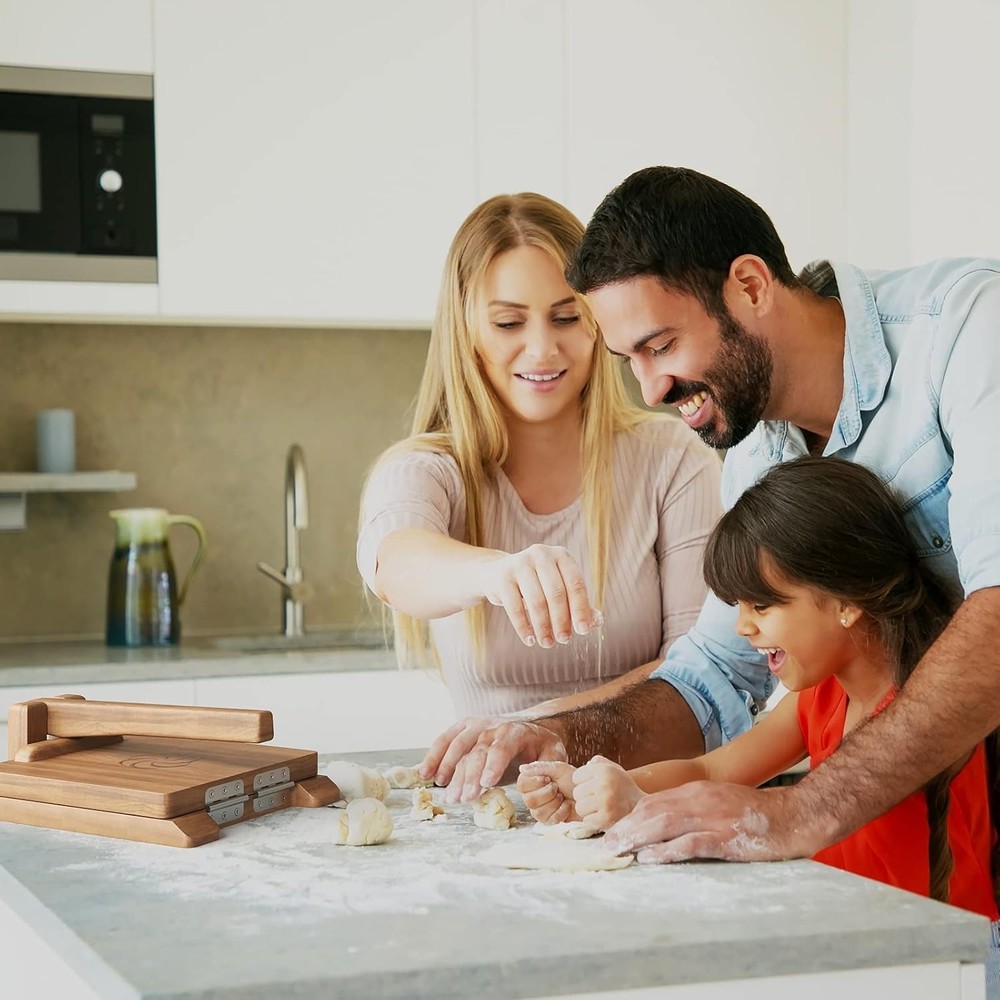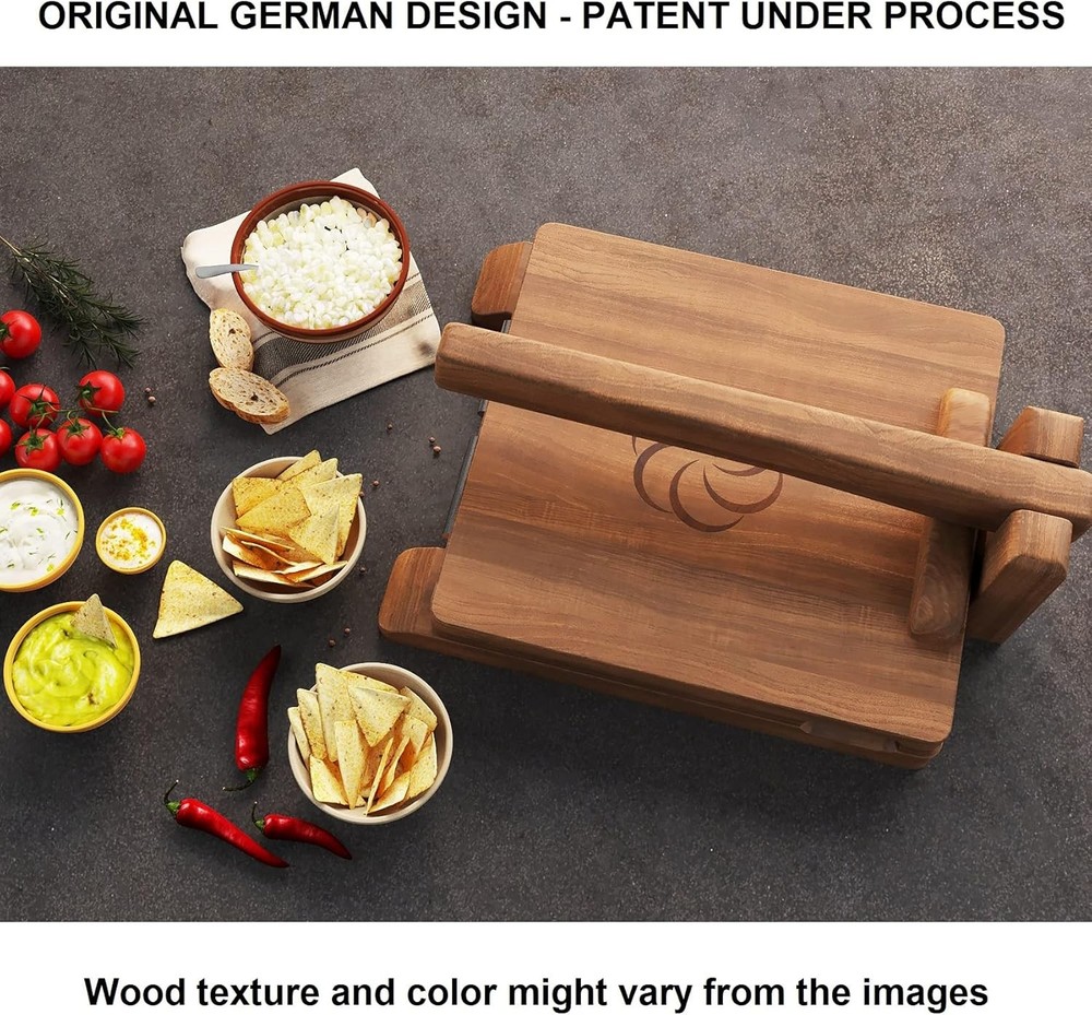 Beautifully-Crafted Tortilla Maker - Our wood tortilla press is stained and finished to highlight the natural grains of the premium acacia wood. It also has non-rust stainless steel hinges and joints. Sturdy & Functional Design - Aside from being a charming kitchen tool, this wooden tortilla press is expertly engineered so that it requires less force to flatten the dough to its final shape. Easy & Comfortable to Use - Our corn tortilla press has an ergonomic handle with rounded edges for optimal comfort during use. It also has 2 hand grips allowing for left- and right-handed operation. Complete Tortilla-Making Set - Comes ready to use out of the box; no tools needed with 50 parchment papers, plastic dough cutter, an E-book, and non-slip pads. It's large enough to replace the 6 and 8 inch tortilla press. 100% Satisfaction Guaranteed - We're committed to the happiness of our customers. This is the perfect maker for non-gluten dough, corn flour, and masa harina.
