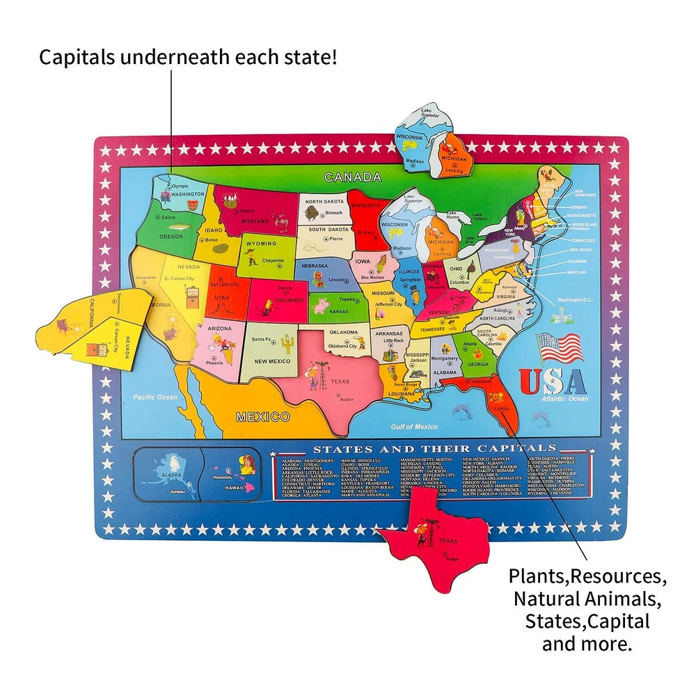 USA MAP PUZZLE: map puzzle consists of 1 wooden frame and 45 pieces puzzles, made of sturdy wood, smooth wood pieces fit nicely, the raised textures make it easy to grab for little hands. The wood board measures about 15.6 x 11.7 x 0.39 inches. EDUCATIONAL GEOGRAPHY PUZZLE: All 45 pieces have customized details, including the state name and capital, and some interesting fun facts, such as the statue of liberty for New York. Your will be interested in who lives where. Encourage children to explore the geography, and Promotes research, tactile and motor development, and thinking and learning. LEARN THROUGH PLAY: United States Puzzle is great for classroom learning or home play time. Teach your about the entire United States and encourage an early interest in history! A handy play set that promotes problem solving and memorization skills. PERFECT GIFT CHOICE: US map puzzle have beautiful illustrated, improves geographical knowledge, encourages problem solving, interaction and creative storytelling. Builds confidence and boosts self-esteem by providing a sense of achievement. A great gift for birthday party, Halloween, Thanksgiving Day, Christmas and New year. SAFE MATERIALS: The Puzzle for is made of natural wood with non-water-based paint. Sturdy wooden construction and smooth edges. Approved ASTM and CPSIA test, BPA-free. No phthalates or heavy metals, safe for children.