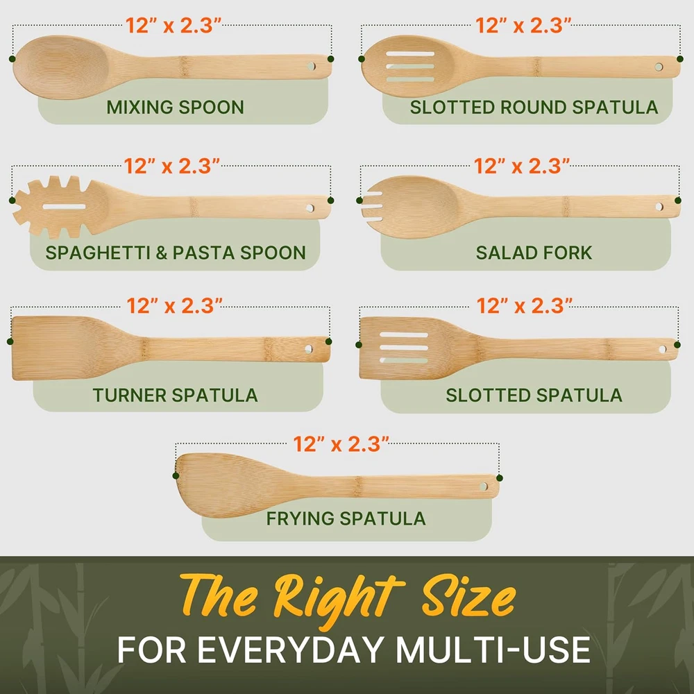 Wooden Utensil Set, Bamboo Cooking Utensils – 7 PCs Easy to 7 Product Details Material: Bamboo Brand: WOODENHOUSE LIFELONG QUALITY Size: 7 PCs Item Weight: 0.41 Kilograms Is Dishwasher Safe: No Material Type Free: Plastic Free Package Dimensions: 12.48 x 12.24 x 0.67 inches Item Weight: 14.4 ounces Country of Origin: China BAMBOO WOODEN UTENSIL SET: Includes 7 essential bamboo cooking utensils for all your cooking needs: slotted round spatula, mixing spoon, slotted wooden spatula, turner spatula, spaghetti spoon, frying spatula, and salad fork. LIFELONG QUALITY: Hand-crafted from bamboo, WoodenHouse bamboo utensils are sturdy, smooth, and well-designed. Built to last a lifetime, they will not crack, melt, or absorb odors. MULTIPURPOSE: Ideal for stirring, flipping, and serving, this wooden kitchen utensil set is perfect for everyday use. Safe for non-stick pans, they prevent scratches and are essential for any kitchen. EASY TO CLEAN & ECO-FRIENDLY: Non-stick and easy to clean with warm or soapy water. These bamboo cooking utensils are free from plastics, safe for non-stick cookware, and prevent scratches. Hand wash, rinse, dry, and maintain with mineral oil for best results. A GREAT GIFT and 100% Lifetime Satisfaction: A stylish and practical gift for any occasion. Impress your loved ones with a set of bamboo spoons and enjoy 100% lifetime satisfaction. Contact us for prompt replacement or reimbursement if needed.