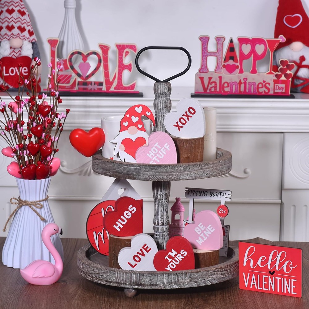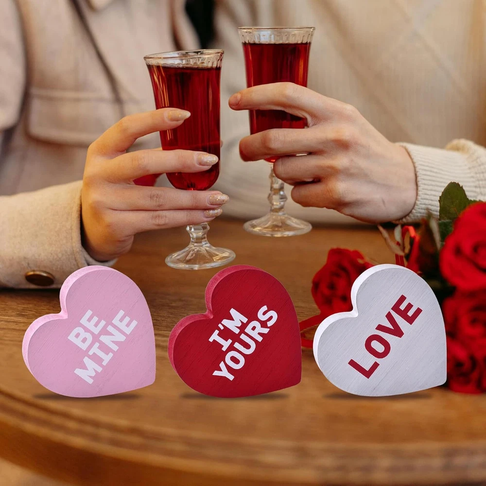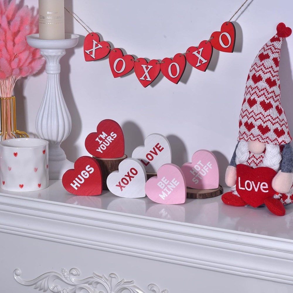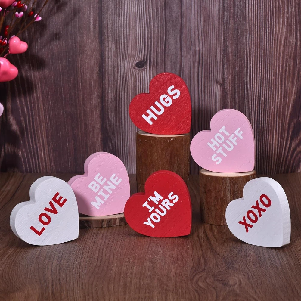 Wooden Valentines Day Decor Heart Blocks, 6PCs Freestanding Wood 6pcs Product Details Color: 6pcs Brand: IDATOO Theme: Love Material: Wood Style: Contemporary Occasion: Valentines Day Recommended Uses For Product: Home Mounting Type: Tabletop Cartoon Character: Love Finish Type: Polished Special Feature: Handmade Product Care Instructions: Light Dusting, Spot Clean Seasons: All Seasons Number of Items: 6 Product Dimensions: 3 x 0.6 x 0.1 inches Item Weight: 11.3 ounces Manufacturer: hedian Country of Origin: China Item model number: hedian-v-01 BRIGHTEN UP YOUR SPACE WITH FESTIVE HEARTS: This 6-piece set of wooden heart decor brings a festive touch to your Valentine’s Day decor. With hearts in vibrant shades of red, pink, and white, each block stands freely and creates a delightful centerpiece for Valentine decorations on tables, shelves, or tiered trays. Add these to your home or office to instantly brighten up your space with a warm, romantic vibe PERFECTLY SIZED AND FREESTANDING DESIGN: Crafted with attention to detail, these Valentine decor heart blocks feature a smooth finish and are perfectly sized at 3 inches in height and 0.6 inches thick. Their freestanding design makes them ideal as Valentine decorations for home, effortlessly displayed on tables, desks, or mantles to spread love in any room SWEET MESSAGES THAT SAY IT ALL: Each piece in this Wooden Valentines Day Decor set is printed with classic, heartfelt phrases like “LOVE,” “HUGS,” and “BE MINE,” adding a meaningful touch to your Valentine decorations. These conversation hearts are sure to bring smiles and warmth to anyone who sees them, making them a charming addition to Valentine decor for any setting ADORABLE DISPLAY OR GIFT IDEA: These heart shape table blocks are an adorable addition to a Valentine’s tiered tray or shelf display. With their charming phrases and inviting colors, they’re also a thoughtful gift for loved ones on Valentine’s Day, anniversaries, or weddings. Friends and family will adore these freestanding wood heart signs, perfect for celebrating love in any form DECOR FOR EVERY ROOM, ALL YEAR LONG: These delightful wood hearts add a festive touch to any room—from kitchen counters and bookshelves to bedrooms or office spaces. Whether for a cozy Valentine’s gathering or as year-round heart decor, this set elevates your space with a warm, romantic aesthetic. Add these wooden blocks to your Valentine decor collection for a touch of love anywhere you need it At IDATOO, we are dedicated to creating charming decor pieces that add warmth and personality to your home throughout the seasons. IDATOO 6Pcs Wooden Valentines Day Heart Blocks bring a delightful and romantic touch to your Valentine’s Day decor, perfect for making your home cozy and inviting. KEY FEATURES: Colorful Valentines Day Decor – This set includes six vibrant heart-shaped blocks in red, pink, and white, making it an eye-catching addition to your Valentine decorations for home. Freestanding Wood Heart Signs – Each wooden heart block is 3 inches high and 0.6 inches thick, allowing them to stand freely on tables, mantles, or shelves without any support. Unique Heart Shape Table Blocks – Each heart features a classic Valentine’s Day message such as "LOVE" and "BE MINE," making them the perfect Valentine decor to spread love throughout your space. High-Quality Wooden Valentines Day Decor – Crafted from sturdy wood with smooth edges, these hearts are well-made and perfect for creating a lasting Valentine’s Day display. Perfect Valentines Tiered Tray Decor – These small heart blocks fit easily onto tiered trays, enhancing your table decor with an adorable Valentine’s theme. Versatile Home Decor – Suitable for any room, these hearts are great as Valentine decorations for home, including the kitchen, living room, or bedroom, bringing love to every corner. Thoughtful Gift Choice – These charming heart blocks make an ideal Valentine’s gift for friends, family, or that special someone, spreading joy with a touch of romance. SPECIFICATIONS: Colors: Red, Pink, White Size: 3’’/7.8cm H, 0.59’’/1.5cm Thickness Material: Wood Messages: "LOVE," "BE MINE," "HUGS," "HOT STUFF," "XOXO," "I'M YOURS"