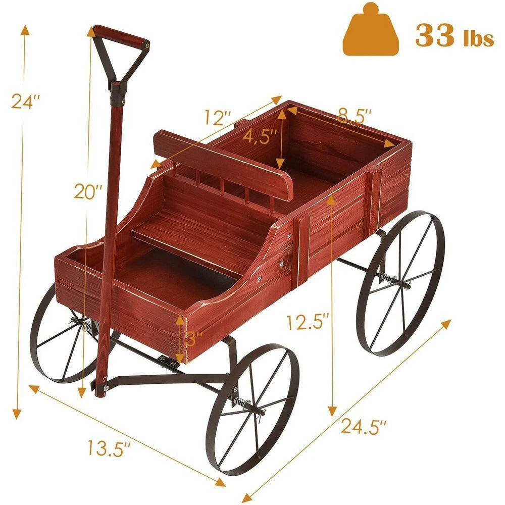 Add spring and summer floral to add color to your front porch Features a country rustic design with an antique look Constructed from wood and iron Brand Alpulon Type Elevated Garden Beds UPC 749877981738 Model ZMWV540-R Richguysbrh7 Your dream home is here Wooden Wagon Plant Bed in Red with Metal Wheels Add spring and summer floral to add color to your front porch Features a country rustic design with an antique look Constructed from wood and iron Showcase your flowers, plants and seasonal decorations all year round. This country Amish styled wagon is sure to impress with its rustic, weathered charm and beautiful bold color. Constructed of premium fir wood, the wagon garden planter features high strength and good toughness for long service life. Natural and sustainable material is suitable for outdoor use. Equipped with anti-rust and solid screws, the parts of this planter are tightly connected with each other. With its rustic style and antique appearance, the flower planter matches well with different outdoor spaces or gives it to friends who enjoy adding a perfect decoration to their landscaping. Thanks to this flower planter, your lovely plants will breathe freely and grow better in various occasions like garden, backyard, etc. Including 2 planting sections to grow plants and flowers Weighs only 5.5 lbs. the wagon is easy to be picked up Equipped with 4 metal wheels for easy movement Premium fir wood ensures sturdiness and durability Can be used as a toy cart and wagon garden planter Convenient handle changes directions flexibly Add highlight to your patio, garden, balcony, etc. Overall dimension: 24.5" x 13.5" x 24" (L x W x H) Package includes: 1 x garden planter wagon, 1 x user guide Color Family:Red|Color Family:Red|Color/Finish:Red|Color/Finish:Red|Container Depth (in.):4.5 in|Container Depth (in.):4.5 in|Material:Wood|Material:Wood|Number of Tiers:No Tiers|Number of Tiers:No Tiers|Pots & Planters Type:Raised Beds|Pots & Planters Type:Raised Beds|Product Weight (lb.):5.5 lb|Product Weight (lb.):5.5 lb|Raised Bed Features:No Addional Features|Raised Bed Features:No Addional Features|Returnable:90-Day|Returnable:90-Day|Shape:Rectangular|Shape:Rectangular|Container Height (in.):24 in|Container Height (in.):24 in|Container Length (in.):24.5|Container Length (in.):24.5|Container Width (in.):13.5 in|Container Width (in.):13.5 in Item Specifics Brand Alpulon Type Elevated Garden Beds UPC 749877981738 Model ZMWV540-R Payment Returns Richguysbrh7 Your dream home is here DESCRIPTION PAYMENT SHIPPING RETURN POLICY CONTACT US Wooden Wagon Plant Bed in Red with Metal Wheels Add spring and summer floral to add color to your front porch Features a country rustic design with an antique look Constructed from wood and iron Showcase your flowers, plants and seasonal decorations all year round. This country Amish styled wagon is sure to impress with its rustic, weathered charm and beautiful bold color. Constructed of premium fir wood, the wagon garden planter features high strength and good toughness for long service life. Natural and sustainable material is suitable for outdoor use. Equipped with anti-rust and solid screws, the parts of this planter are tightly connected with each other. With its rustic style and antique appearance, the flower planter matches well with different outdoor spaces or gives it to friends who enjoy adding a perfect decoration to their landscaping. Thanks to this flower planter, your lovely plants will breathe freely and grow better in various occasions like garden, backyard, etc. Including 2 planting sections to grow plants and flowers Weighs only 5.5 lbs. the wagon is easy to be picked up Equipped with 4 metal wheels for easy movement Premium fir wood ensures sturdiness and durability Can be used as a toy cart and wagon garden planter Convenient handle changes directions flexibly Add highlight to your patio, garden, balcony, etc. Overall dimension: 24.5" x 13.5" x 24" (L x W x H) Package includes: 1 x garden planter wagon, 1 x user guide Color Family:Red|Color Family:Red|Color/Finish:Red|Color/Finish:Red|Container Depth (in.):4.5 in|Container Depth (in.):4.5 in|Material:Wood|Material:Wood|Number of Tiers:No Tiers|Number of Tiers:No Tiers|Pots & Planters Type:Raised Beds|Pots & Planters Type:Raised Beds|Product Weight (lb.):5.5 lb|Product Weight (lb.):5.5 lb|Raised Bed Features:No Addional Features|Raised Bed Features:No Addional Features|Returnable:90-Day|Returnable:90-Day|Shape:Rectangular|Shape:Rectangular|Container Height (in.):24 in|Container Height (in.):24 in|Container Length (in.):24.5|Container Length (in.):24.5|Container Width (in.):13.5 in|Container Width (in.):13.5 in Item Specifics Brand : Alpulon Type : Elevated Garden Beds UPC : 749877981738 Model : ZMWV540-R Payment Returns All rights reserved. Hot Item New List Item Help & Info Payment Policy Shipping Policy Return Policy FAQ About Us