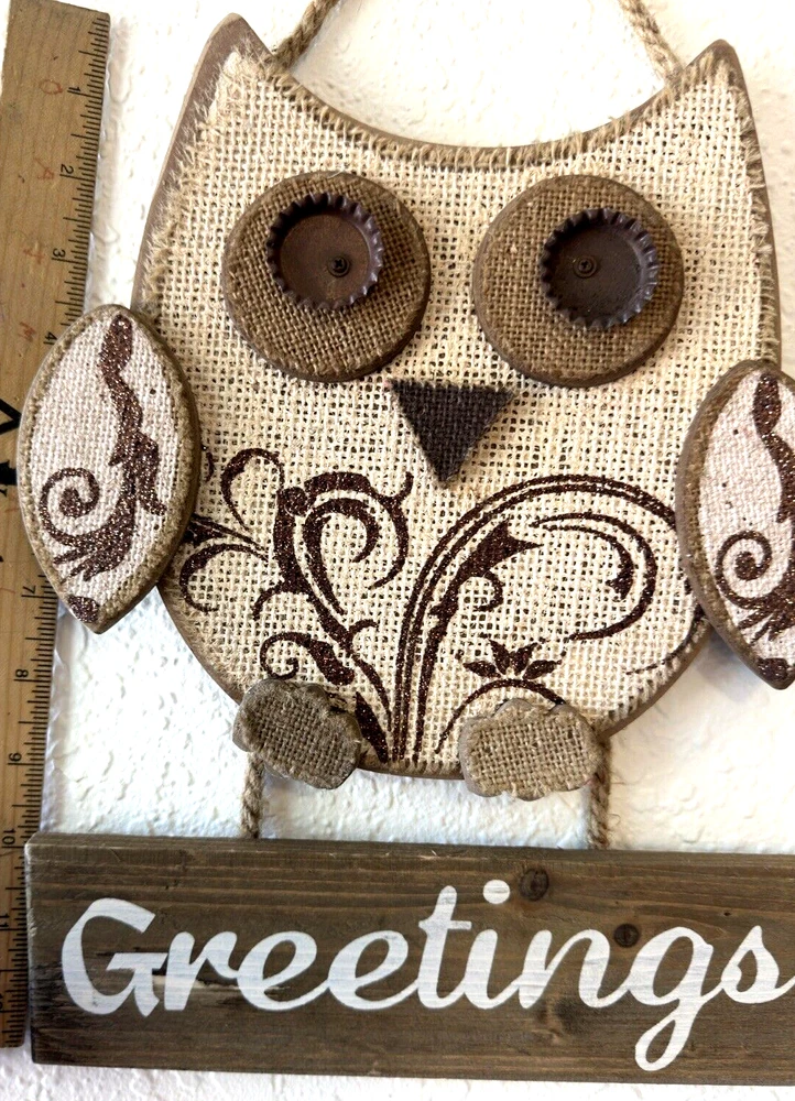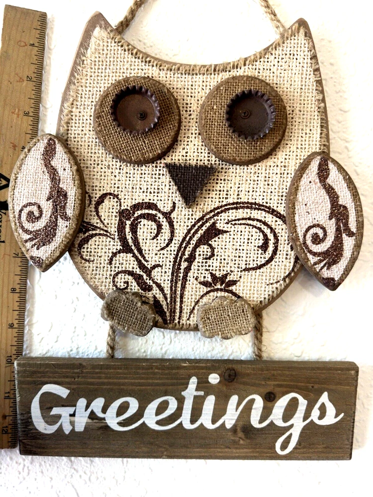 Wooden Whimsical Owl "Greetings" Welcome Wall Sign Hanging Decor NWOT