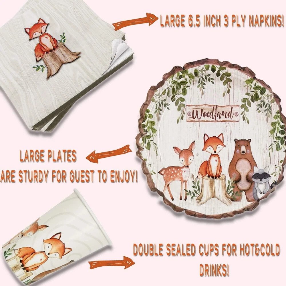 SERVE 32: This woodland creatures party decorations includes : 32 9"dinner plates + 32 7" dessert plates + 32 9oz paper cups + 32 napkins, can serves 32 guests. BIODEGRADABLE & DURABLE: Woodland creatures party supplies made of 100% food grade material BPA-free, no-toxic, biodegradable, eco-friendly, recyclable, heavy duty (350g white paperboard, thick and sturdy) won't folded, teared or broken easily, assuring paper plates party supplies set. HOLO PARTIES: The woodland creatures party decorations perfect for baby shower and animal theme birthday party. You can count on our decorative plate napkins and cup to add more elegance to your dinner table. DISPOSABLE EASY TO CLEAN: You can simply throw these out when making cleaning up after party and won't cause a environmental pollution. Save time and effortless. Let's spend more time with our family or friends. (NOTE: Do not microwave plates please.) SPLENDID SIZE FOR DINING:The woodland party supplies dinner plates measure 9” round and dessert plates measure 7" round with animal design. Paper cups hold approximately 9 oz of liquid. Napkins are 3-layer and measure 13 x 13 inches when unfolded and 6.5 x 6.5 inches folded.