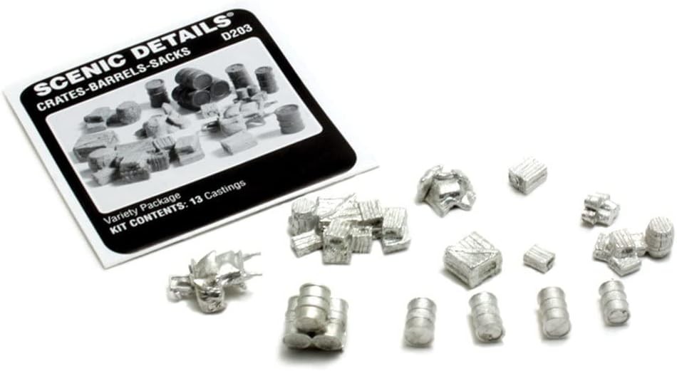 Further Details Title: Woodland Scenics HO Scale Scenic Details Crates, Barrels, and Sacks Condition: New Description: Ho Scale. Woodland Scenics Scenic Details are thoroughly researched and finely crafted HO Scale reproductions. Each kit contains highly detailed white metal castings and easy to follow instructions. Colorful dry transfer signs and accessories are included where necessary. Woodland Scenics Scenic Details are economical, easy to assemble, and fun to paint. Use Scenic Details to add color, interest, and authenticity to your layout. Use Mini-Scene Paint Set (M125) or Pewter Patina Finish (M126) to paint details. Skill level 2 Language: English Item Height: 50mm Item Width: 50mm Item Weight: 58g Age Level: 14 years and up Assembly Status: No Brand: Woodland Scenics Color: Blanco Item Length: 50mm Material: Metal Type: Scenery MPN: 785-D203 Model Railroading Supplies Missing Information? Please contact us if any details are missing and where possible we will add the information to our listing.