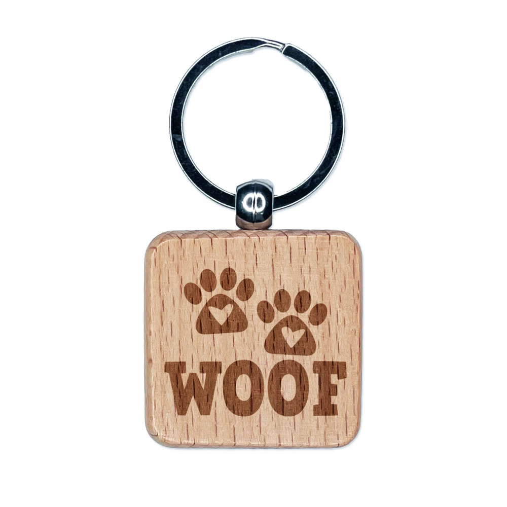 Woof Dog Paw Prints Hearts Love Fun Text Engraved Wood Square Keychain Tag Charm