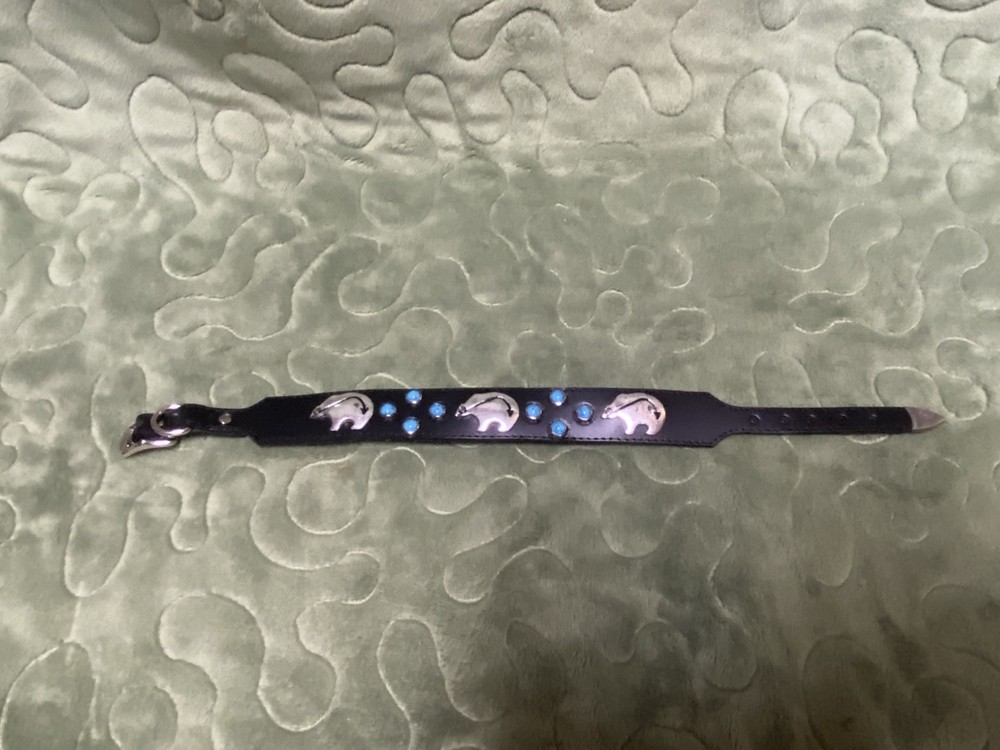 Woof Wear Dog Collar ——- 1” wide 14” long ——- Black Leather Turquoise Silver Tone Bear Design ——- Southwest style, New Mexico ——- Gently used, no signs of wear.