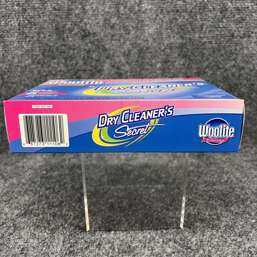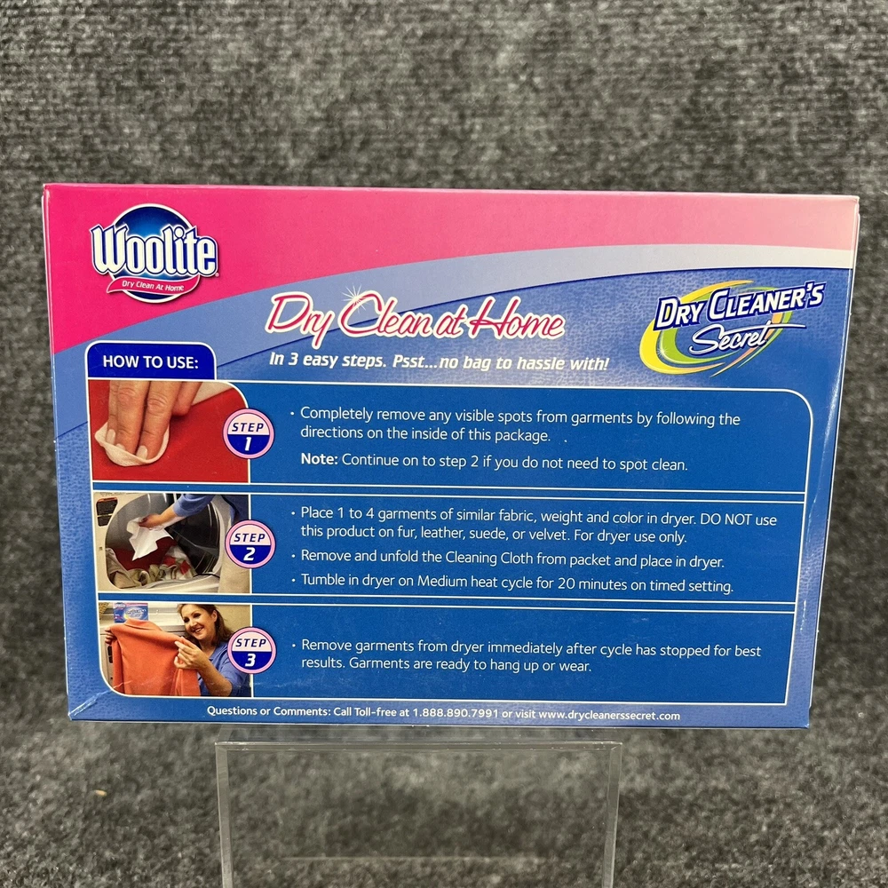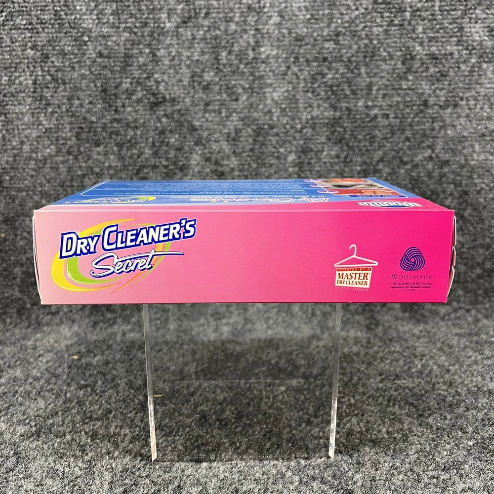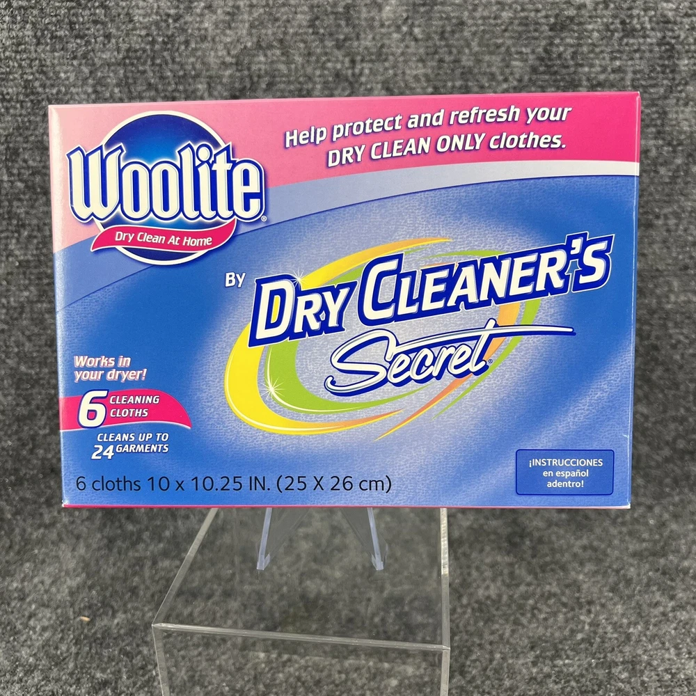 New in Box, Woolite Dry Clean at Home Dry Cleaner's Secret the box contains 6 Cleaning Cloths which it says is good for cleaning up to 24 garments at home in your dryer. (NOT for use on fur, leather, suede or velvet). Please refer to the pictures for further.