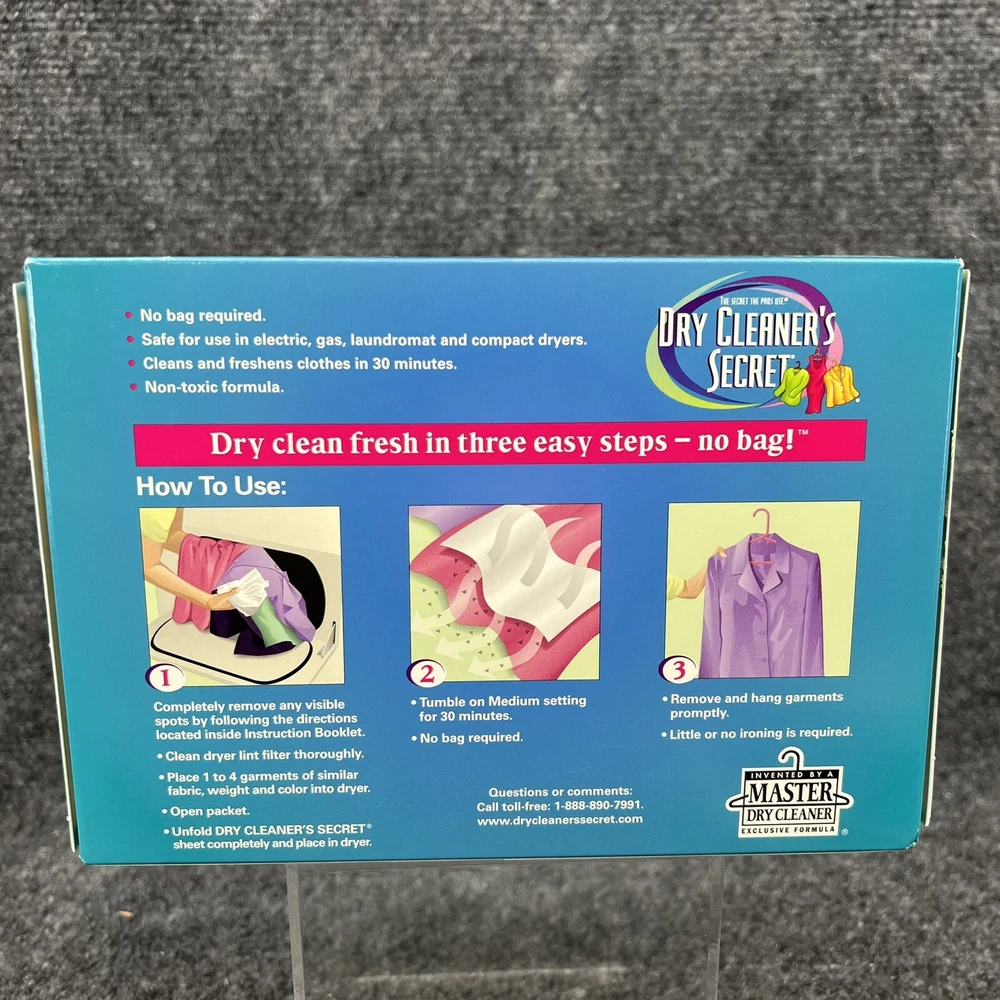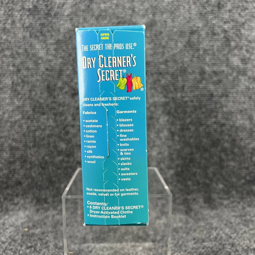 New in Box, Woolmark Dry Cleaner's Secret at Home Dry Cleaning - contains 6 Sheets which the box says is good for cleaning up to 24 garments at home in your dryer. (NOT recomended for use on fur, leather, suede or velvet). Please refer to the pictures for further.