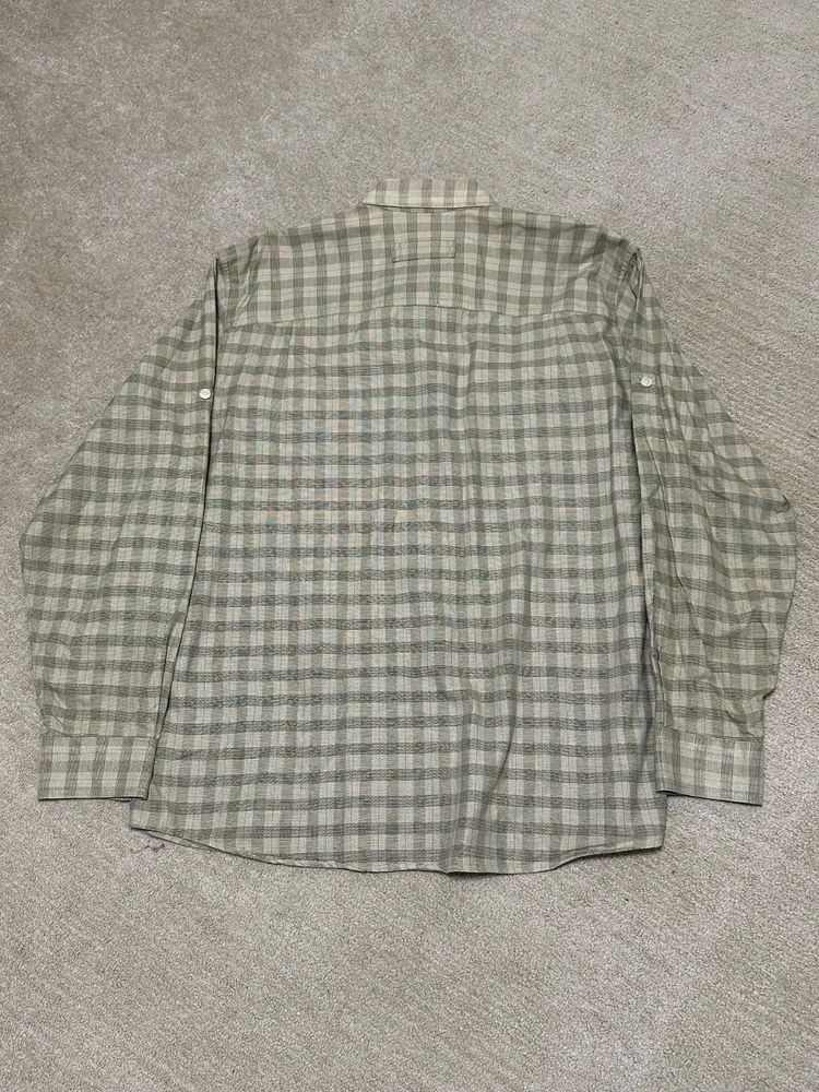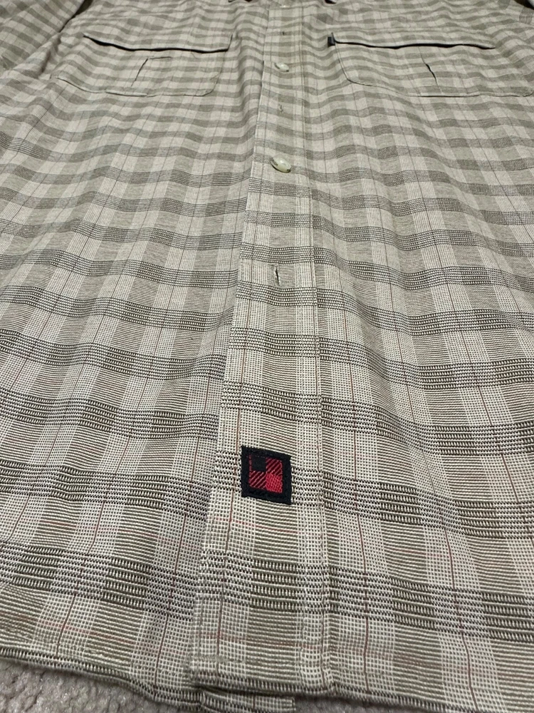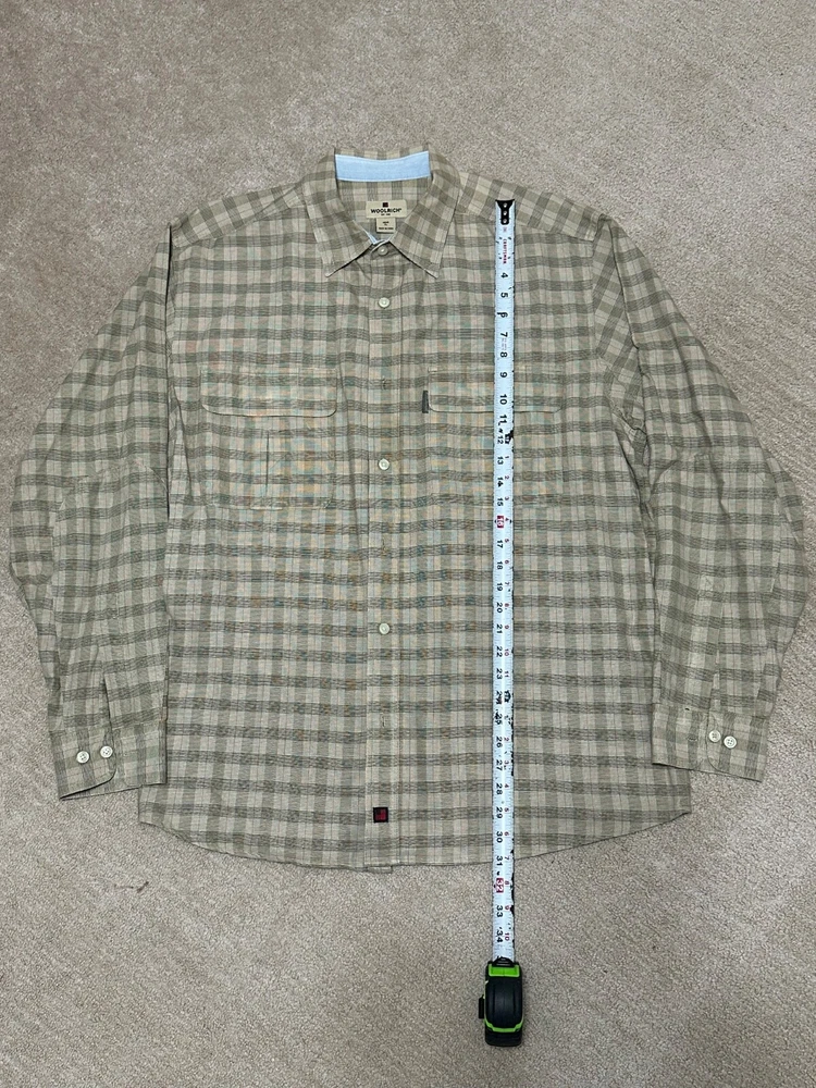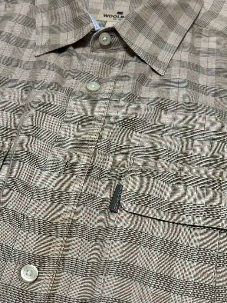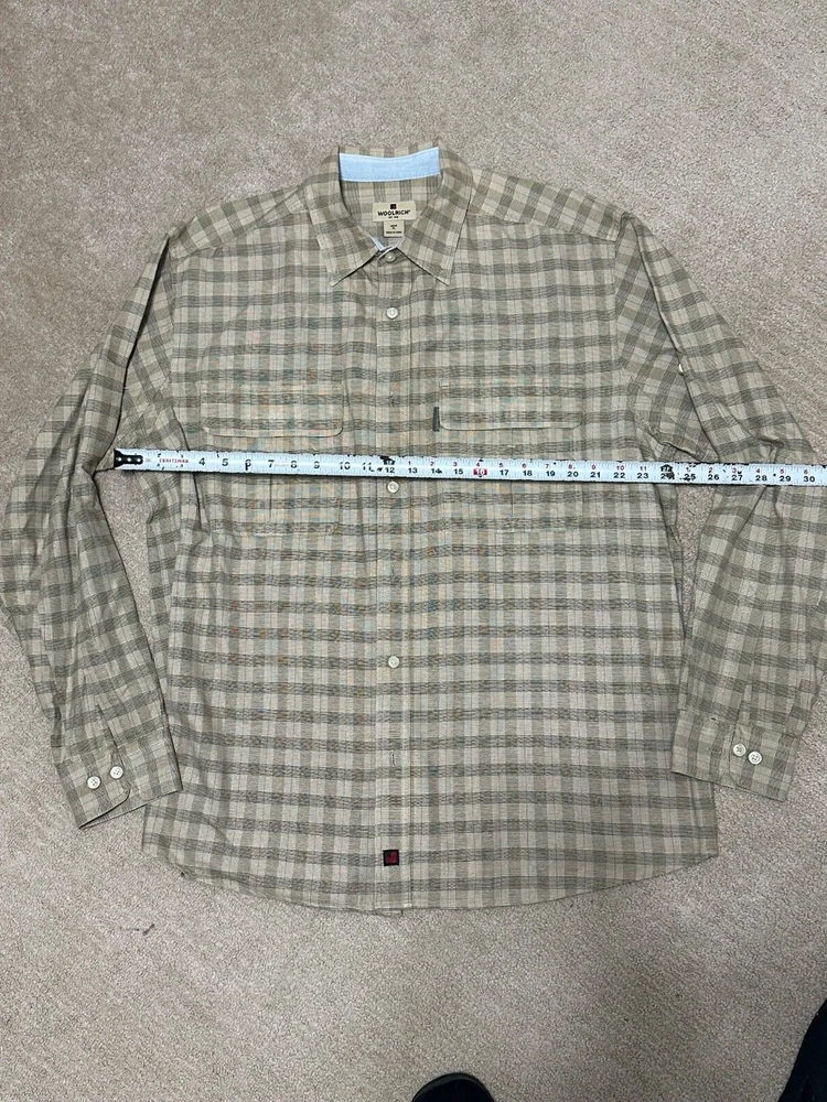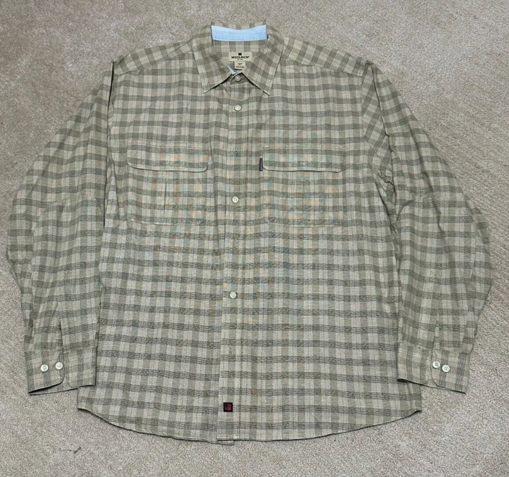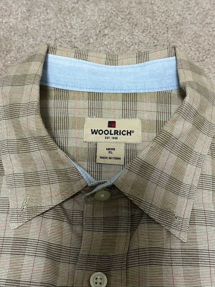 A shirt feels very new. This Woolrich shirt for men in size XL features a light brown checkered pattern with a button-up closure and long sleeves. Made of heavyweight cotton canvas material, this casual shirt is machine washable and designed for a regular fit. The collared neckline and button accents add a classic and preppy touch, while the shirt also includes convenient pockets and an extra button. Perfect for winter, summer, fall, and spring seasons, this versatile shirt is a timeless addition to any wardrobe.