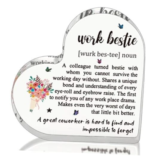 30 Days Return Policy Fast Delivery Trusted seller Work Bestie Gifts for Coworker Friends Work Partner, Work Bestie Definition Work Bestie Birthday Gifts, Friend Gifts for Work Bestie Friend at Work Decorative Signs Product Description 【Funny Work Bestie Gifts】: Our special gift for your work bestie to express everything you want to say for work bestie. This lovely work bestie presents is a good choice, it can make her remember your time together. Work Bestie Gifts For Women Coworker, Funny Work Bestie Gifts, bosses day gifts for Work Bestie, Work Bestie Definition Gift For Women Coworker, Best women Coworker Gifts Friend Gift Work Friendship Gift Birthday Gift for Work Bestie work wife, work bestea, work Friends, friend at work, bestie coworker. 【Friend Gift for Work Bestie】: Perfect friends at work plaques for work bestie, great for adding fun to various occasions. Work bestie gift ideas for birthday, friendship gift for Work Bestie, Work Bestie moving away, Work Bestie leaving, Work Bestie farewell, Work Bestie going away, going away present for a friend at work, gift for office work friend, friend leaving work gift, wedding gift for work friends, thank you Work Bestie, Christmas wedding anniversary gift for Work Bestie, bridal shower gift for Work Bestie, Work Bestie retiremen etc.. 【Office Gifts for Work Bestie】: A colleague tured bestie with whom you cannot survive the working day without. Shares a unique bond and understanding of every eye-roll and eyebrow raise. The first to notify you of any work place drama. Makes even the very worst of days that little bit better. Work made us coworkers but the fun and laughter made us friends, a great Work Bestie is hard to find and impossible to forget. 【Unique & Thoughtful Design for Work Bestie】: This acrylic heart shaped sign is printed with meaningful text and unique design. It reminds your work bestie how important your friendship is to you. The printing is bold and clear, not easy to fad, lasts longer than flowers and chocolates. Suitable for various occasions and favorite places, such as desks, bookcases, coffee tables, wall cabinets and nightstands etc. It will bring a good mood and memories to your work bestie day and night. 【Material and Size】: This Work Bestie plaque is made of highly transparent acrylic, crystal clear, eye-catching, carefully polished, smooth surface, durable, not easy to break. It measures approximately: 4.7 x 4.7 x 0.6 inches, and is a perfect size for placing on any tabletop etc.. Shipping Returns Payment Shipping Shipping is FREE to all addresses other than APO/PO boxes in the lower 48 states. All our stock ships from US-based warehouses. Shipped via USPS or UPS (depending on location and package weight) Unless stated otherwise, all orders will ship within 24-72 hours of your payment being processed. Check our feedback to see the great reviews of FAST shipping we offer. Returns As our valued customer, we will do our best to make sure the product you receive arrives to you on time and as expected. If you are not satisfied with your purchase, please contact us within 30 days of receiving your order to process a return. Payment We currently accept payment via eBay managed payments only. Once payment is cleared, we will dispatch your shipment within 1-3 business days. Please refer to the "Shipping" tab for more information regarding shipping speed to your destination.