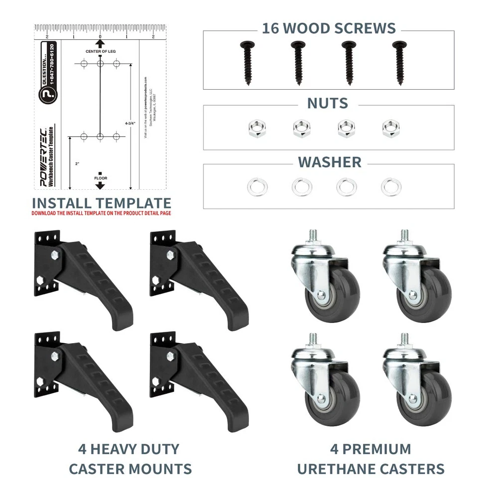 Store New Arrivals Add to Favorite View Feedback Contact Workbench Caster Kit Set of 4 with Side Mounting Options & 400 Lbs Loads, 2-1/2 Inch Retractable Stepdown Caster Wheels for Workbenches, Tables, Stands and Equipments (17001) Description Item model number 17001 Unit Count 4.0 Count Style Side Mounting, Retractable Color Black Product Dimensions 10 x 5 x 4.5 inches; 8.3 Pounds Material Stainless Steel Country of Origin Taiwan Item Weight 8.3 Pounds Is Discontinued By Manufacturer No Size 2-1/2", 400lbs, 4PK CONTENTS: Workbench caster kit includes (4) swivel casters with 2-3/8” polyurethane wheels, pedal brackets and easy install mounting hardware HEAVY DUTY: Casters flaunt an extra-thick housing and durable stainless steel construction that supports up to an impressive 400lb lifting weight capacity per set STEPDOWN CASTERS: Features an innovative design with a non-slip foot activated pedal mechanism that allows you to elevate and move your workbench for fast and easy mobility VERSATILE: Our universal workbench mobile base kit is perfect for at-home and automotive garages, professional workshops, and anywhere mobilized workstations are required. 16 sets of mounting screws included for two installation styles FREE PIVOTING: Swivel casters flaunt 360 degree pivoting action - offering functional versatility for an assortment of projects that require maneuverability and workstation flexibility Introducing the Workbench Caster Kit (4 Pack) by POWERTEC. This caster wheel set was designed to help maximize your workspace by adding mobility to your workbench, allowing you to conveniently position it anywhere in your workshop – without a hassle. PREMIUM FEATURES TO TAKE ADVANTAGE OF: A free-pivoting swivel mechanism that ensures a proper 360 rotation, providing optimal control and maneuverability to turn tight corners. An impressive 100 lb loading capacity per caster – perfect for an assortment of heavy lifting jobs. Polyurethane (PU) caster wheels, which are non-marring and designed to protect your floor while offering a smooth rolling experience. A foot pedal mechanism that’s foot-activated and features a rugged steel construction with a matte black finish. Pre-drilled holes and installation hardware, offering a simplistic approach to mounting. 16 sets of mounting screws included for multiple installation options. Casters engineered with high precision ball bearings, offering exceptional noise reduction, decreased resistance and consistent hauling. POWERTEC is a leading manufacturer of high quality wood work accessories, sanding discs and an assortment of OEM parts. We are committed to exceeding expectations, while bringing the latest innovations, technology, and product development to the industry. ABOUT US We offer the best prices around on high quality products. Our E-store includes media such as books, movies, music and games while offering electronics, toys, sporting apparel, clothing, tools, general home, garden items and more. SHIPPING We are always working hard to ensure your package arrives as soon as possible. Please understand that some factors like weather, high postal traffic, and the performance of shipping companies are outside of our control. We offer free shipping to the lower 48 states and ship within 2 business days of payment, usually sooner. We do not accept P.O. Boxes. Please provide a physical address. For shipping outside of the continental USA, we only use eBay's Global Shipping Program.The item is shipped to KY and then sent to the rest of the world. International customers are responsible for all duties and taxes. Continue to check out in order to calculate costs for shipping the item to your country. Messages regarding eBay's Global Shipping Program MUST be directed at eBay EXCLUSIVELY. RETURNS We offer a 30-Day Return Policy on items which you are not completely satisfied with. You have the option for a full-refund or an exchange of the item. No returns are available on items shipped outside of the USA. PAYMENT We accept PayPal. CONTACT US This page content is yet to come Please ad us to your favorite seller and visit again later Thank You CUSTOMER SATISFACTION We try our very best to make sure every customer is completely satisfied. If there's a problem, message us! We're happy to help. WE ACCEPT Copyright © 2021 AutoDS. | All Rights Reserved