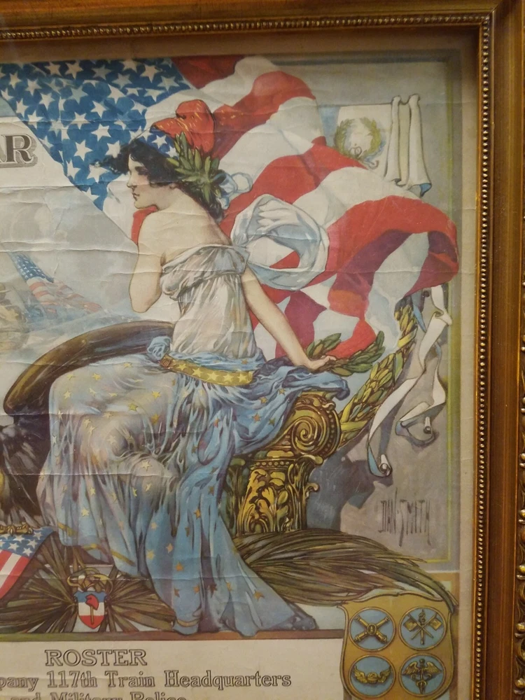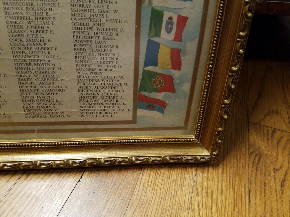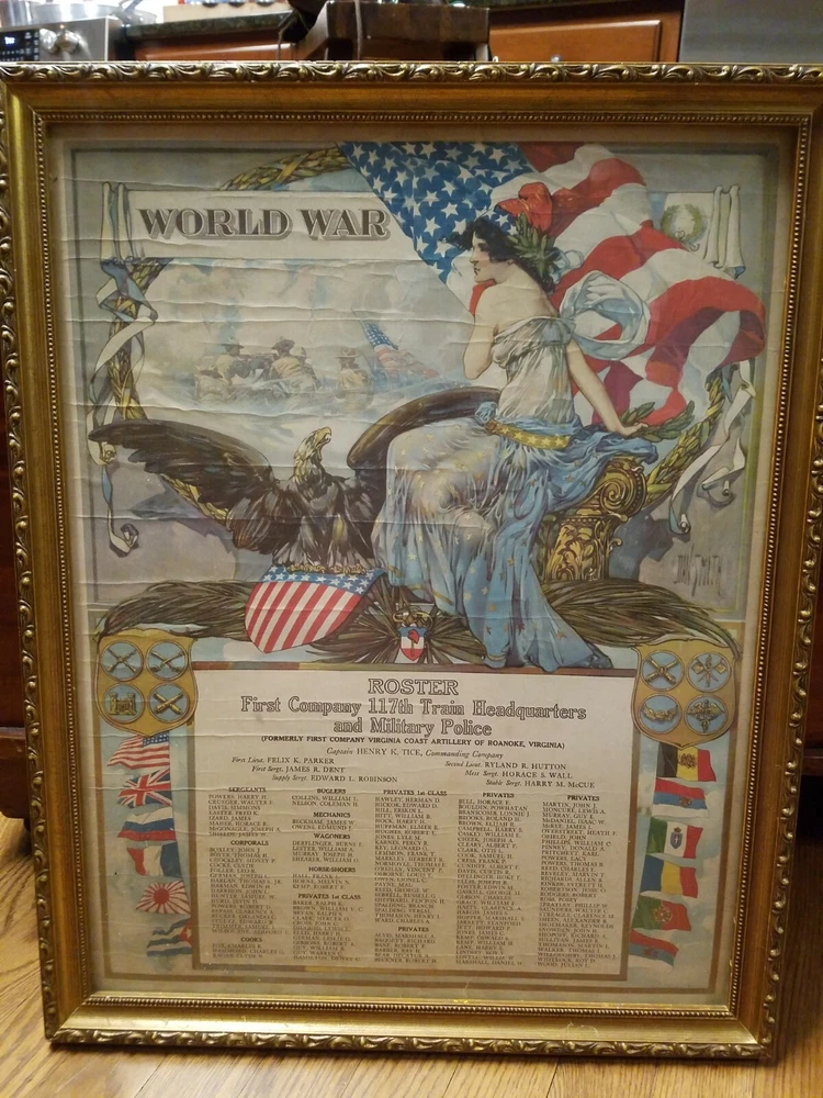 Up for sale is a professionally frame World War I Roster Poster. Poster measures approx. 16"x21" Frame measures approx. 18.5"x 23.5" First Company 117th Train Headquarters and Military Police (Formerly First Company Virginia Coast Artillery of Roanoke, Virginia) Wonderful color. Illustrated Postal Card Co. NY Plexiglass cover, not glass. Please see pictures. Please note that lately USPS's shipping transit times have been severely delayed. If this is a potential issue please do not purchase. eBay determines shipping cost based on actual dimensions input for item.