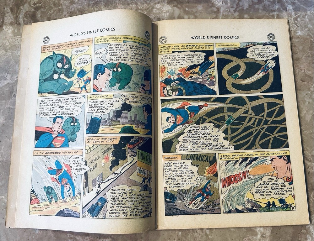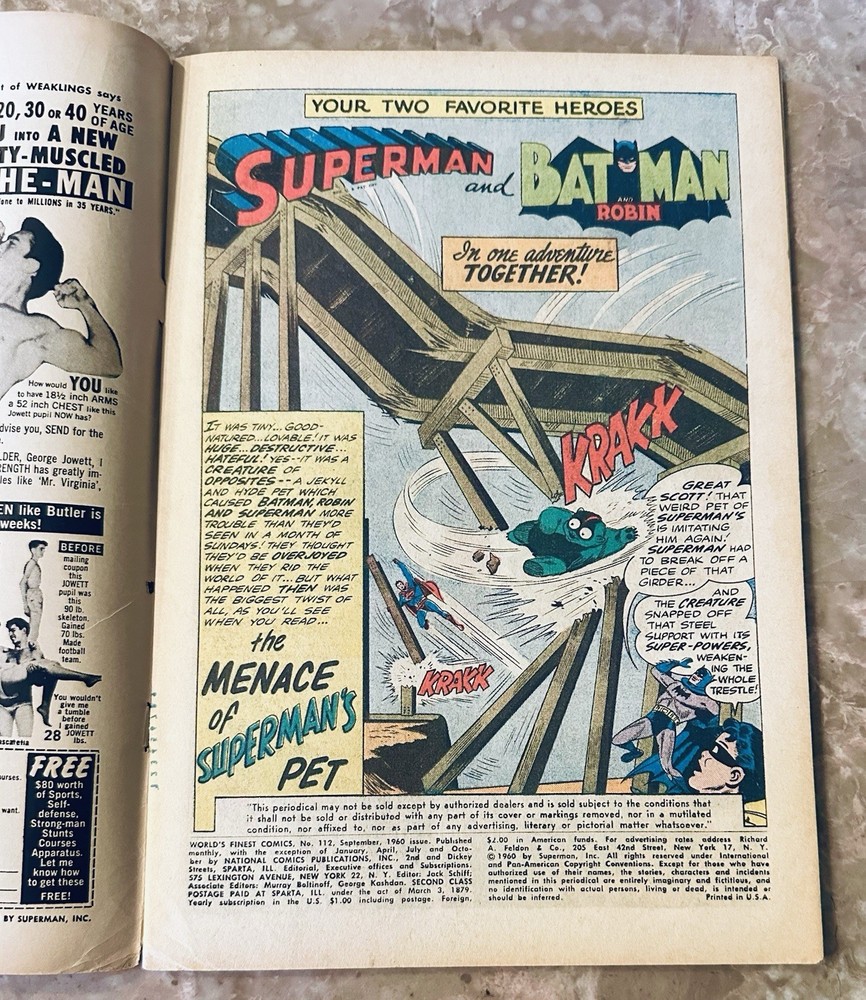 The product is a vintage comic book titled "World's Finest #112" from DC Comics, published in 1960 during the Silver Age era. This issue features iconic characters such as Superman (Clark Kent) and Batman (Bruce Wayne) within the DC Universe. The cover art by Curt Swan showcases the classic style of the era, with colorful illustrations and a focus on superheroes. This first printing comic book is a collectible item for fans of US Comics and comic book memorabilia. Ships from Denver, Colorado.