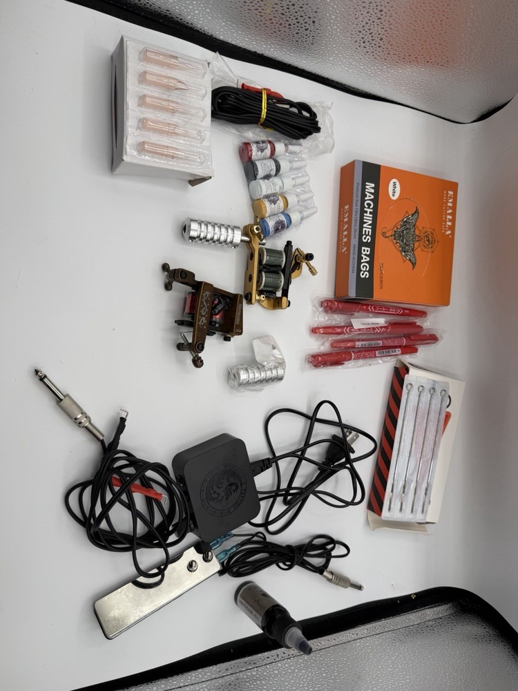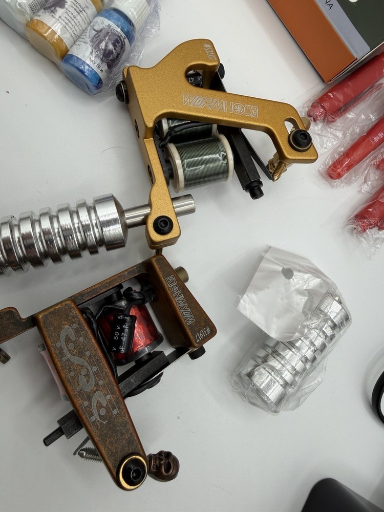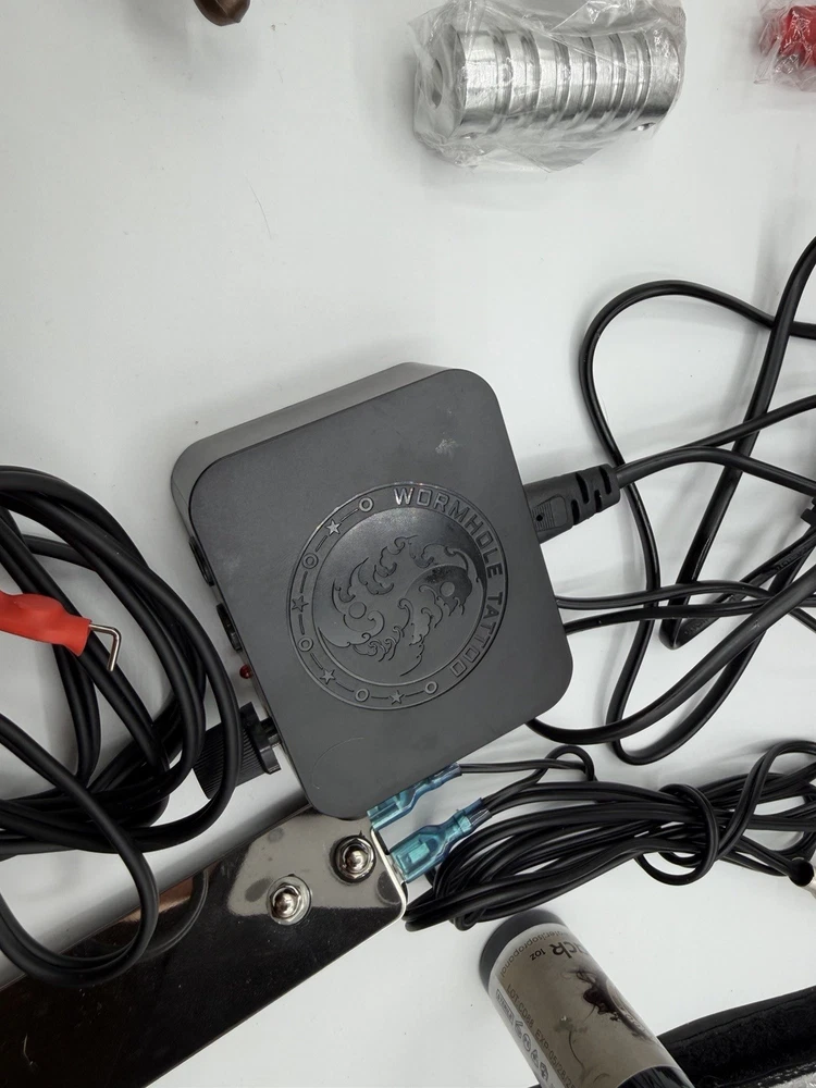 Wormhole Tattoo Machine Kit 2 Machines Power Supply Needles Ink Complete Set. Complete tattoo machine kit by Wormhole, great for beginners or backup setup. Includes: • 2 Wormhole tattoo machines • Power supply & foot pedal • Clip cord • Multiple metal grips • Tattoo needles (sealed) • Tattoo inks/pigments • Practice skin • Machine bags & accessories • Original box (if shown in photos) Items are in good pre-owned condition. Normal signs of use. Please review all photos for exact contents and condition. ⚠️ Sold as shown in photos. Great value bundle.