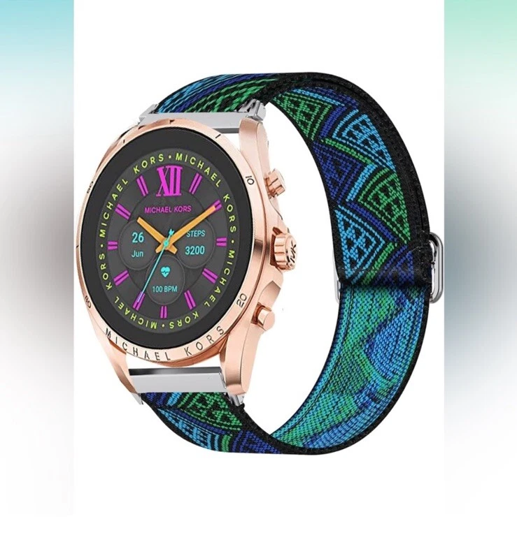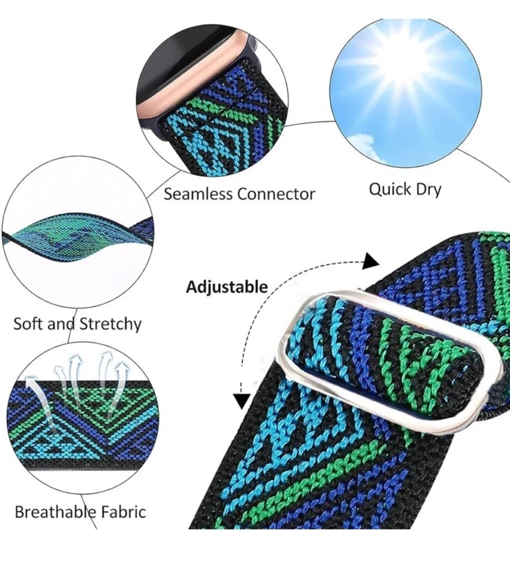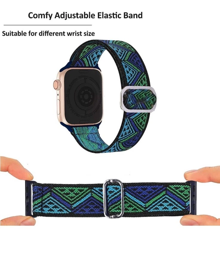 This Worryfree Gadgets nylon loop sports wristband for Apple Watch is the perfect accessory for your active lifestyle. The adjustable strap ensures a comfortable fit for most men and women, while the blue-green triangles color pattern adds a stylish touch. The wristband features a unique stretchy design that prevents it from falling off or getting loose as you engage in your favorite sports or daily activities. It is also water-resistant and sold as one item at a time. With its lightweight and breathable material, this wristband is an excellent choice for running and jogging or any other sports activity. Fits 44MM