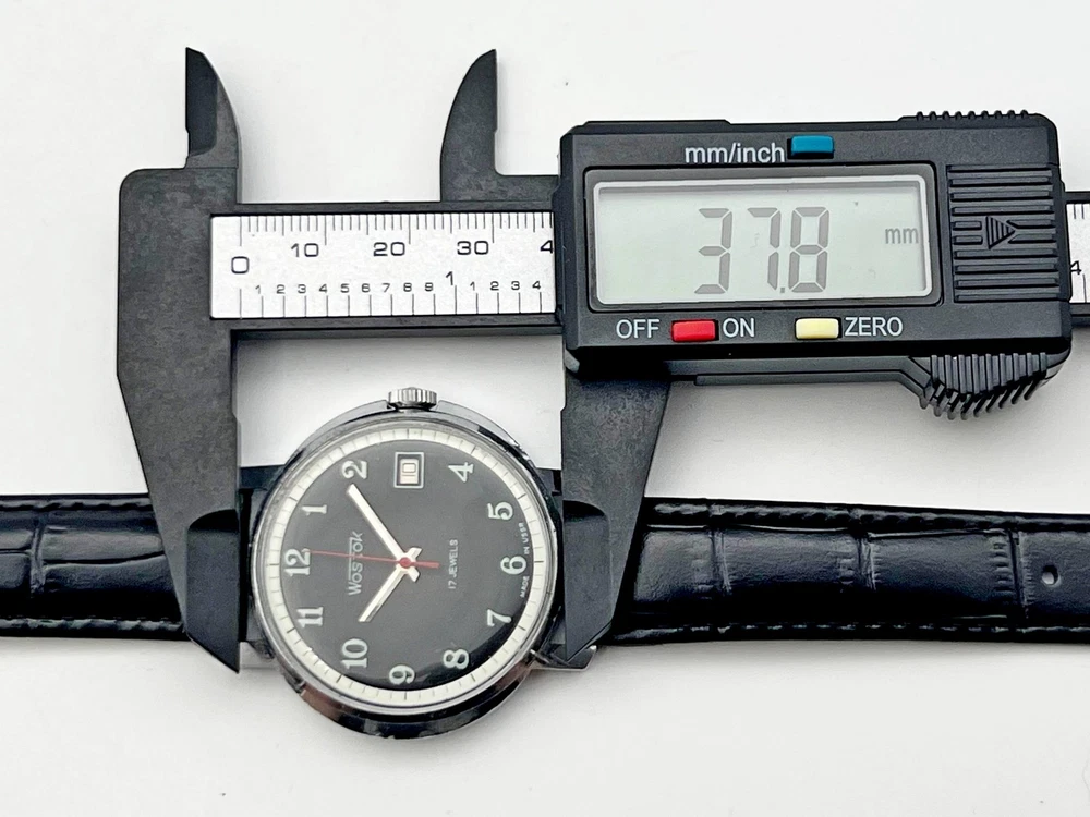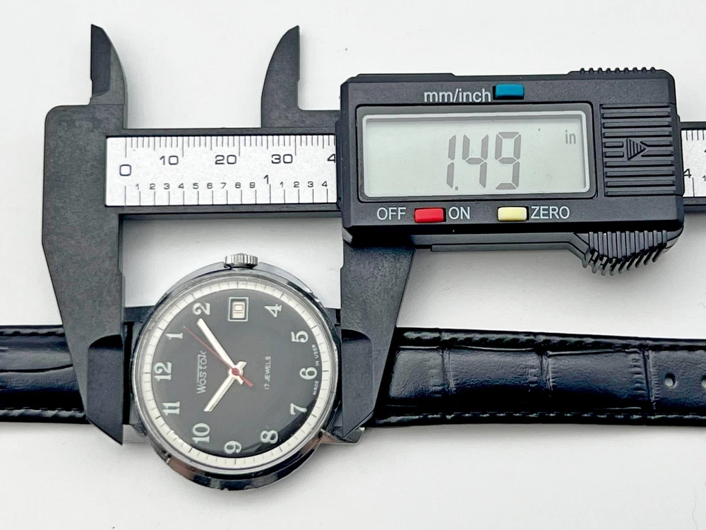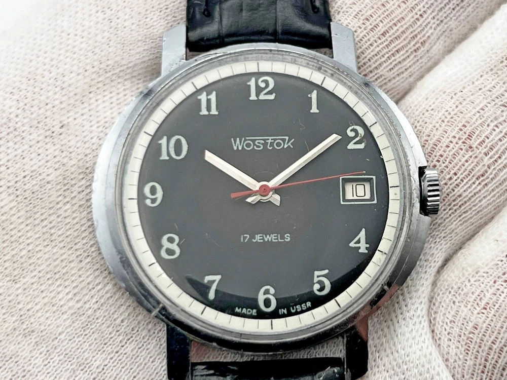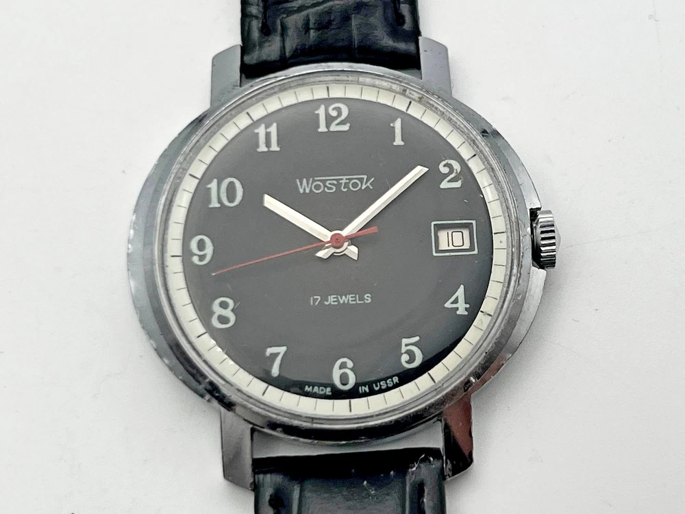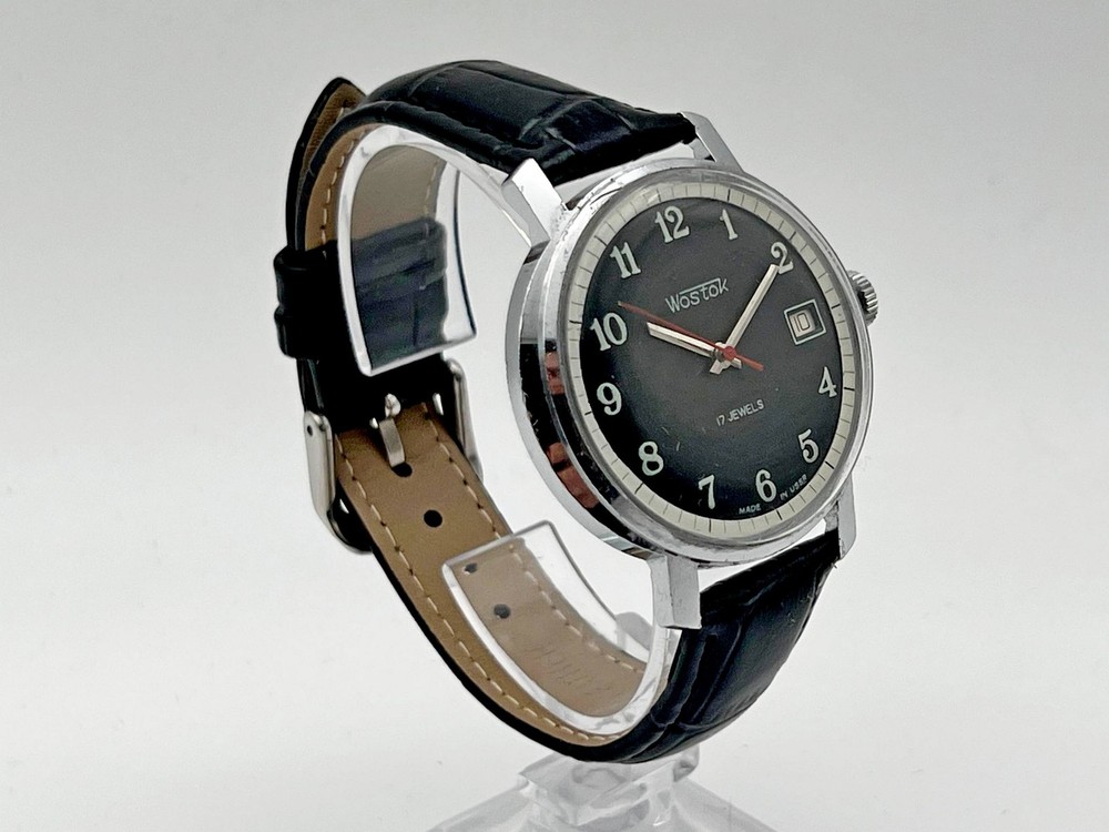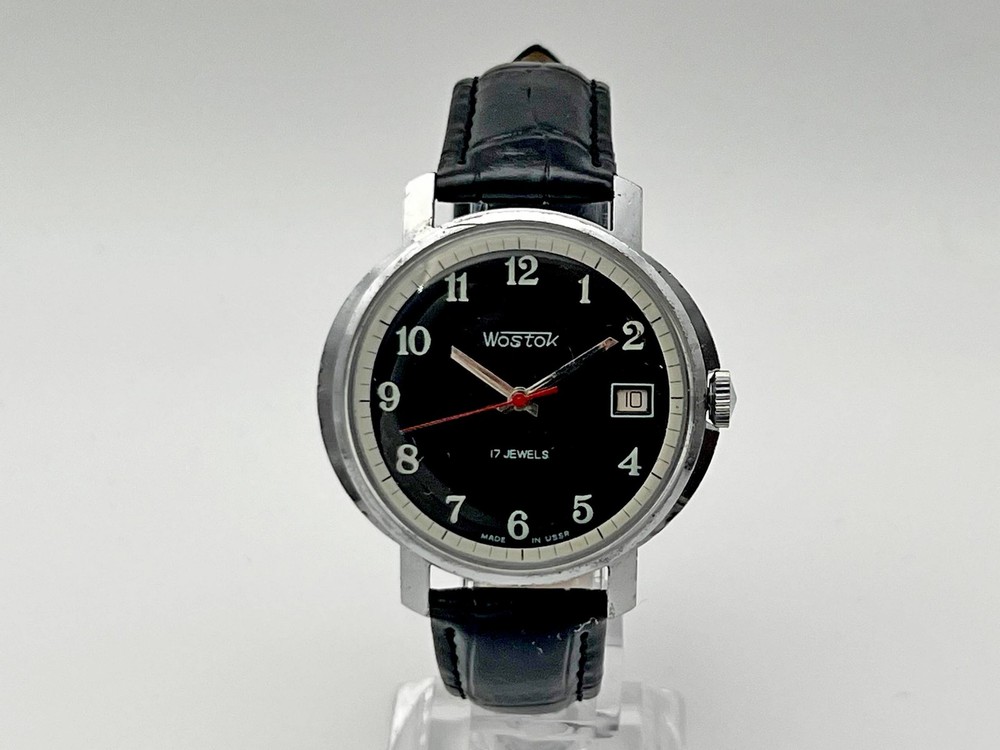 Wostok 2414 SU Vintage Mechanical Wristwatch 17 Jewels USSR Serviced Watch Rare Soviet Watch with Calendar, Black Dial, Black Leather Band. Produced by the Chistopol Watch Factory The watch is serviced by professional watchmaker. The service included complete disassembly, cleaning and subsequent lubrication of the mechanism. Keeps good time and runs well. Could be a great gift for someone you love or can be added to your collection. Contact me if any questions. I do offer combine shipping discount if you buy 2 items or more. I make shipments the next business day after the purchase. Buyer protection is in effect. Please watch the photos carefully as they are important part of description. Thanks for your interest. Have a look at some other lots at our store. đđ