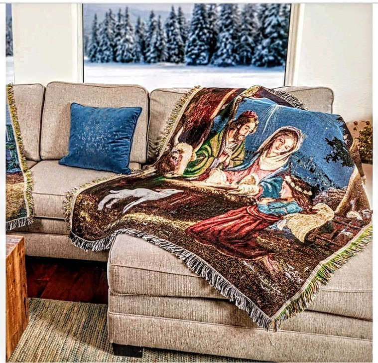 Nativity of Jesus Christ Woven Tapestry Blanket Material: Cotton Blend Size: Extra Large Dimensions: 50" inches x 65" inches New This is a beautiful Mosaic of the Nativity of Jesus Christ in a Woven Tapestry Blanket featuring the Nativity of Jesus Christ with Joseph and Mary Woven with a cotton blend threading throughout. This is not a painted image. Each thread is colored and woven to create the beautiful image of a bea. This blanket is recommended to be spot cleaned. Possibly Dry Cleaning also. Whatever you use to clean make certain it doesn't contain harsh chemicals. Should be a mild soap. This image can also be hung on the wall as a Room Decoration or for Devotional purposes like the Daily Rosary. Notice: We are closed on Sunday and Holy Days of obligation so please make your purchase after the Holy Day. Thank you friends and patrons.