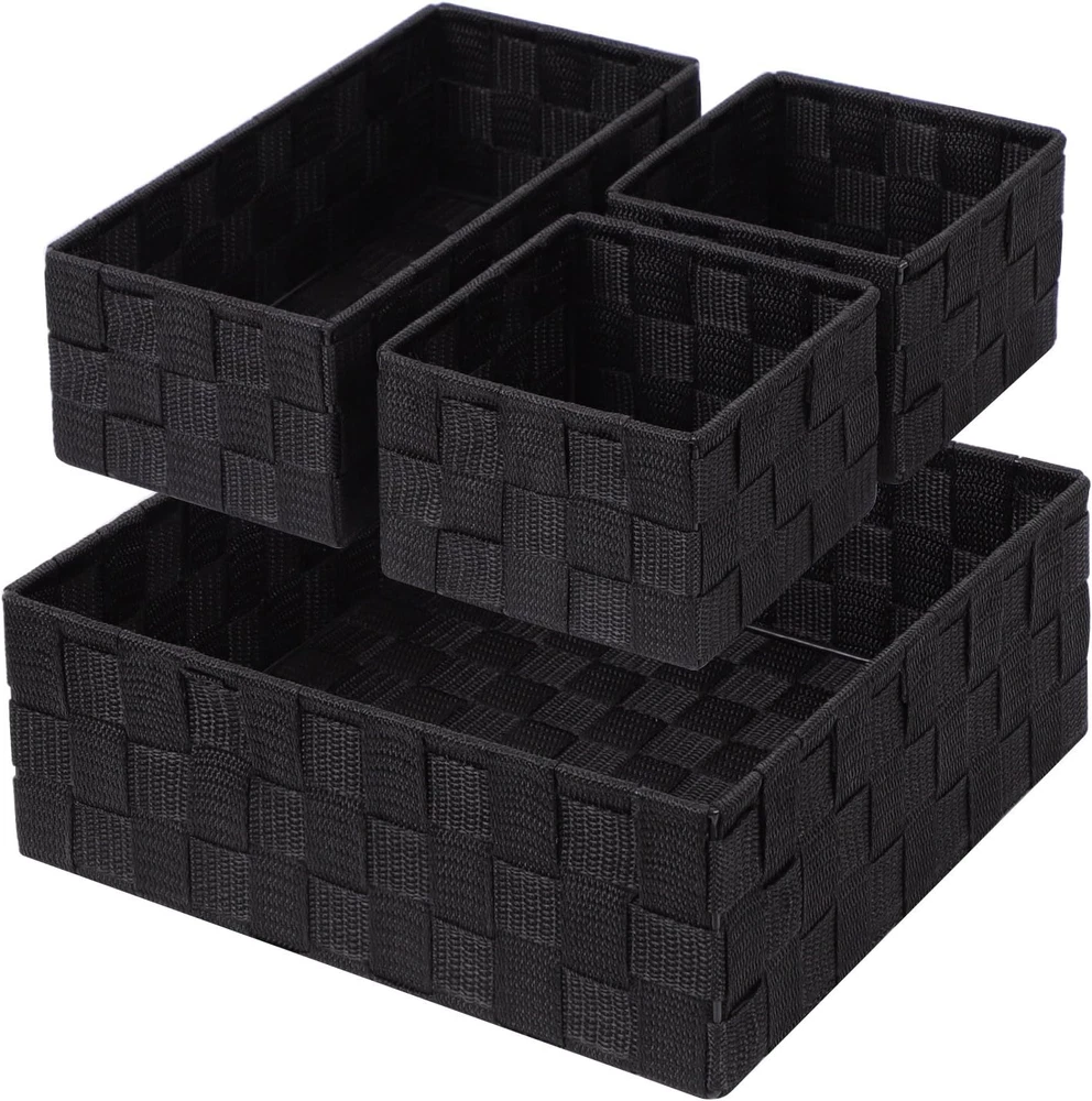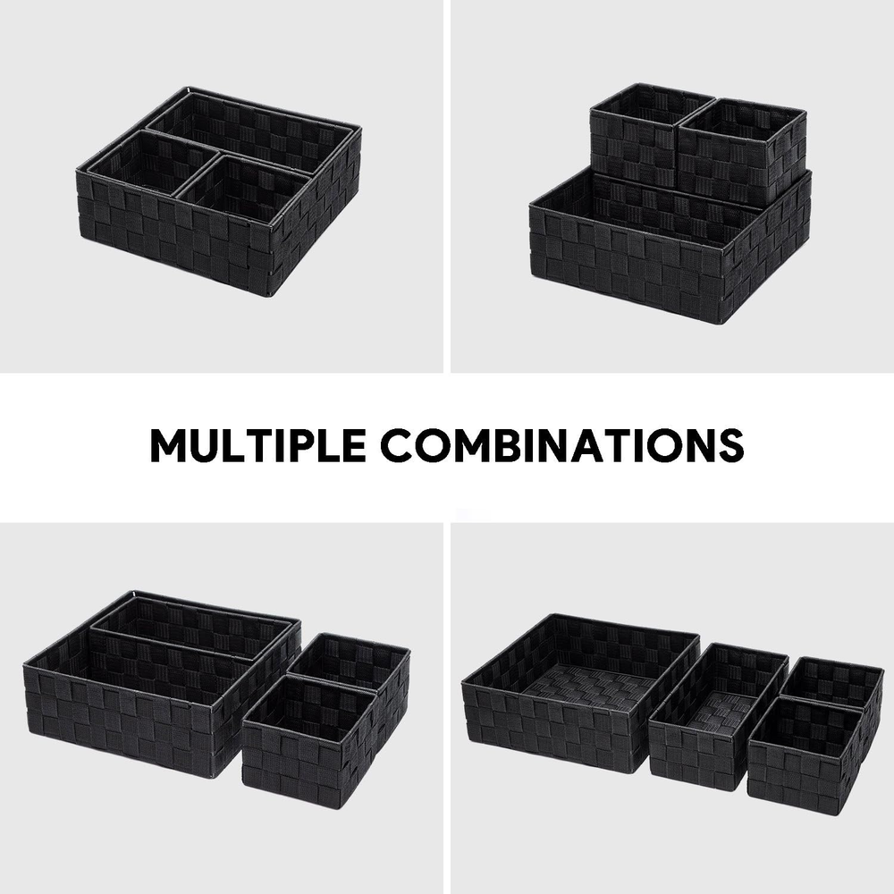 Woven strap A set of 4PCS: The woven basket includes 1 large and 3 small organizer boxes that are perfect in the drawer. Measure about(L×W×H):11×11×3.9inches,10×5×3.7inches, 5×5×3.7inches FIRM METAL FRAME:The frame of all woven organizer bins is inserted with steel wire, enough firm and not easy to be distorted like cloth drawer STURDY: The closet drawer is pure hand made from woven strap, 10 times more durable and long-lasting than cloth drawer MULTI-USE:These storage baskets for shelves can be used as makeup organizer,bathroom organizer,nursery organizer,office organizer,desk organizer,shelf organizer,kitchen organizer,good gift for back to school FIT ALL PEOPLE: The black organizer bins keep grocery and accessories organized and easily accessible for all kinds of people:student,baby,children,woman,man;for all purposes:toys, grocery,grocery,undergarments Product description Posprica small woven black baskets These storage baskets for shelves can be used as makeup organizer,bathroom organizer,nursery organizer,office organizer,desk organizer,shelf organizer,kitchen organizer. Includes 1 large and 3 small organizer boxes that are perfect in the drawer. Measure about(L×W×H):11×11×3.9inches, 10×5×3.7inches, 5×5×3.7inches. FIRM METAL FRAME The frame of all woven organizer bins is inserted with steel wire, enough firm and not easy to be distorted. STURDY The closet drawer is pure hand made from woven strap, 10 times more durable and long-lasting than cloth drawer. EASY TO CLEAN This basket is made of polypropylene strap, soft , durable and easy to wash.