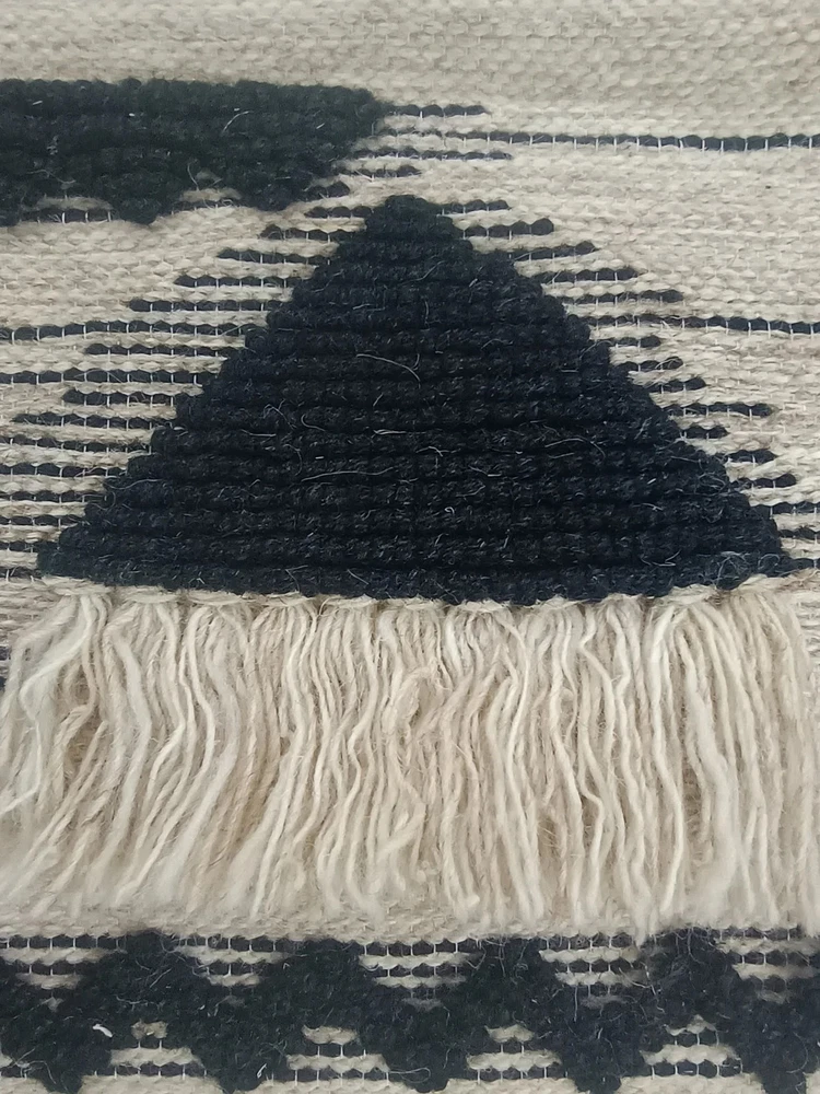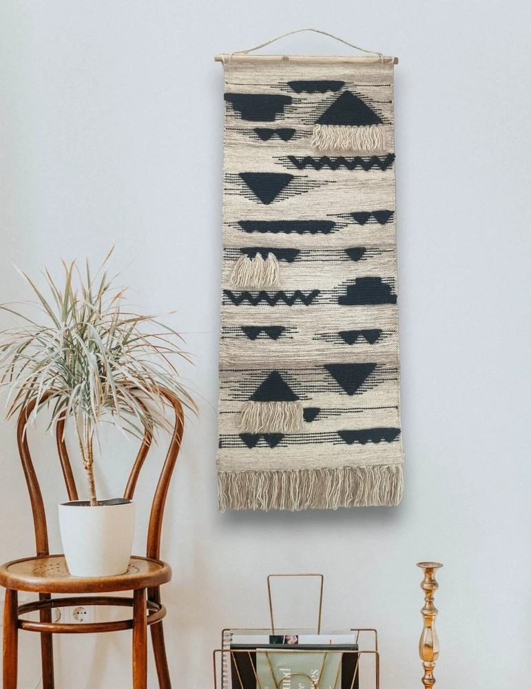 Read the full descriptioPPron Product Details Materials: Wool, Cotton, Jute, Handmade, Wooden Dowel, finished product Width: 21.5 inches Height: 55 inches The modern black & white abstract hand-woven tapestry looks best to decorate your living in Bohemian style . This large size tapestry is made of best quality yarn, soft wool and cotton which is centered on a wooden dowel for durability and finished with a cord for hanging. looks best for modern living with vintage touch , Boho living room and minimalist home decor. Sizes: 21.5 inches Width * 55 inches Height with 7.5 inches high hanging rope (please contact us directly if you need alteration in size, we can customize it as per your need) Colors: natural shades of beige, black and off white Care: The fringes can be carefully combed with your fingers or broad hair comb to get free from entangled Usage: This Hand-woven wall tapestry will be a perfect match for your bedroom, Boho living room, entryway, nursery, Dining Decor, Headboard or Handmade Gifts to your loved ones