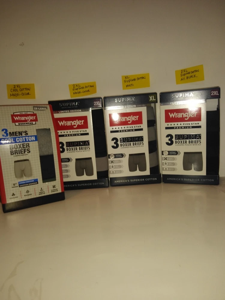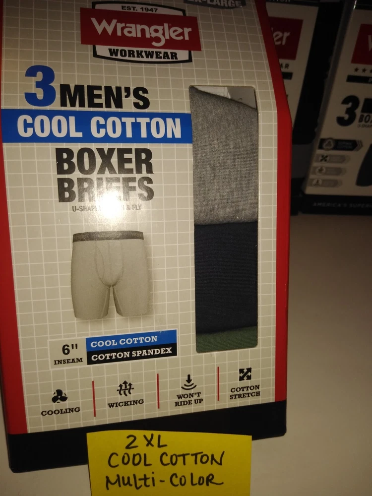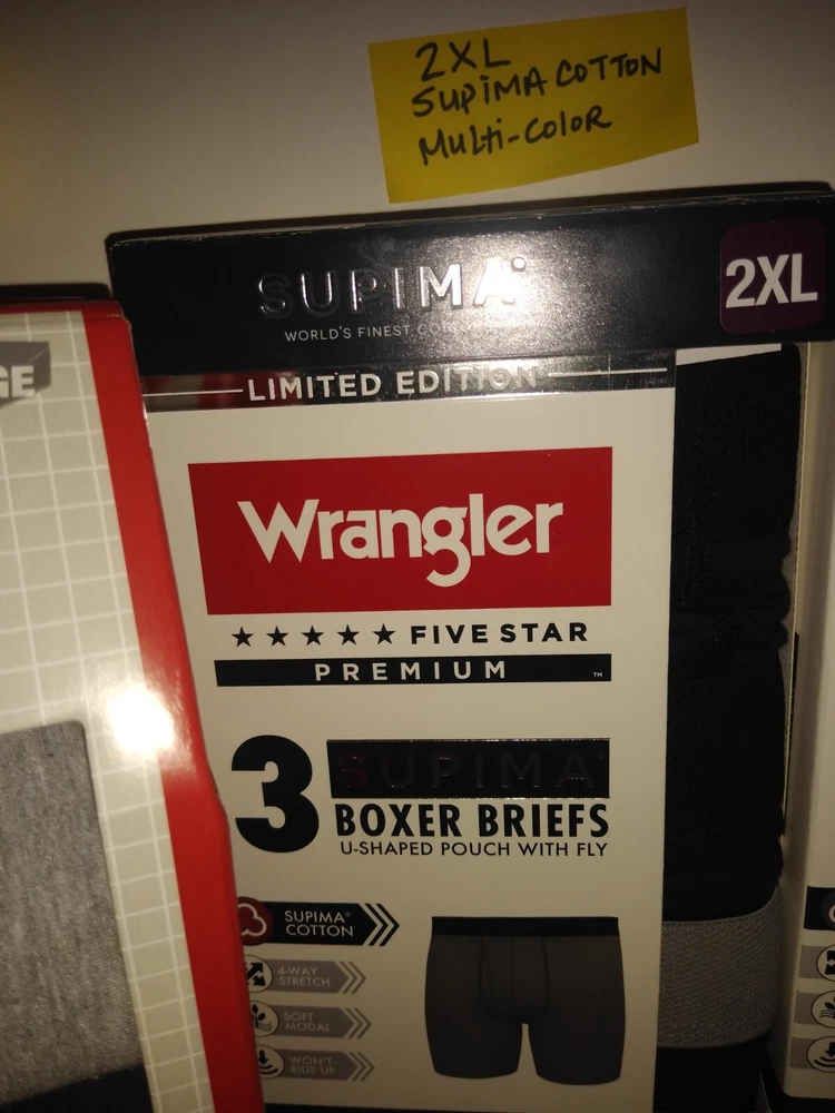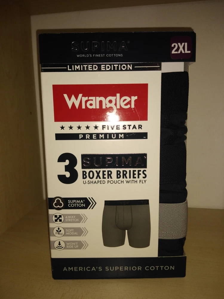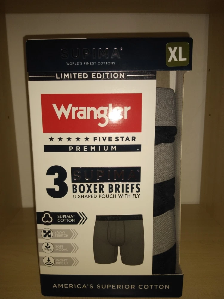 Wrangler Supima Boxer Briefs U Shaped Pouch with Fly 4 Way Stretch Functional Fly Tag Free Comfort 6" Inseam Soft Modal Limited Edition Elevate your underwear game with this Limited Edition three-piece set of Wrangler Five Star Premium Supima Boxer Briefs. Made of a comfortable blend of cotton, modal, and elastane, these boxers feature a solid pattern in black, blue, and grey, with a star theme that adds a touch of playfulness. The fabric type is Supima Cotton 4 Way Stretch, ensuring a comfortable and stretchy fit for all seasons. These boxers are perfect for men who appreciate quality and comfort. They are tagless, breathable, and suitable for all seasons. Choose XL or 2XL. The breathable cotton is a great fit for most men, while the stylish design and stretchy fabric make them a must-have addition to any wardrobe. Get your hands on these Wrangler boxers and enjoy the ultimate comfort and style.