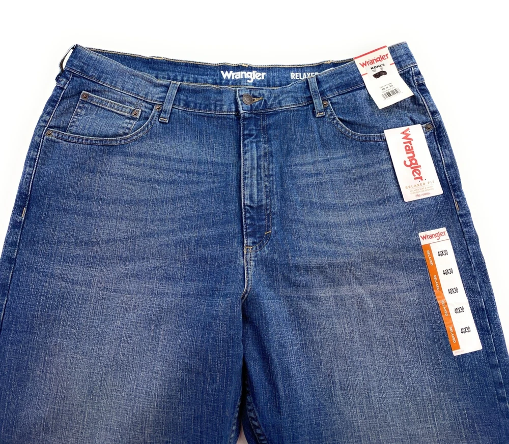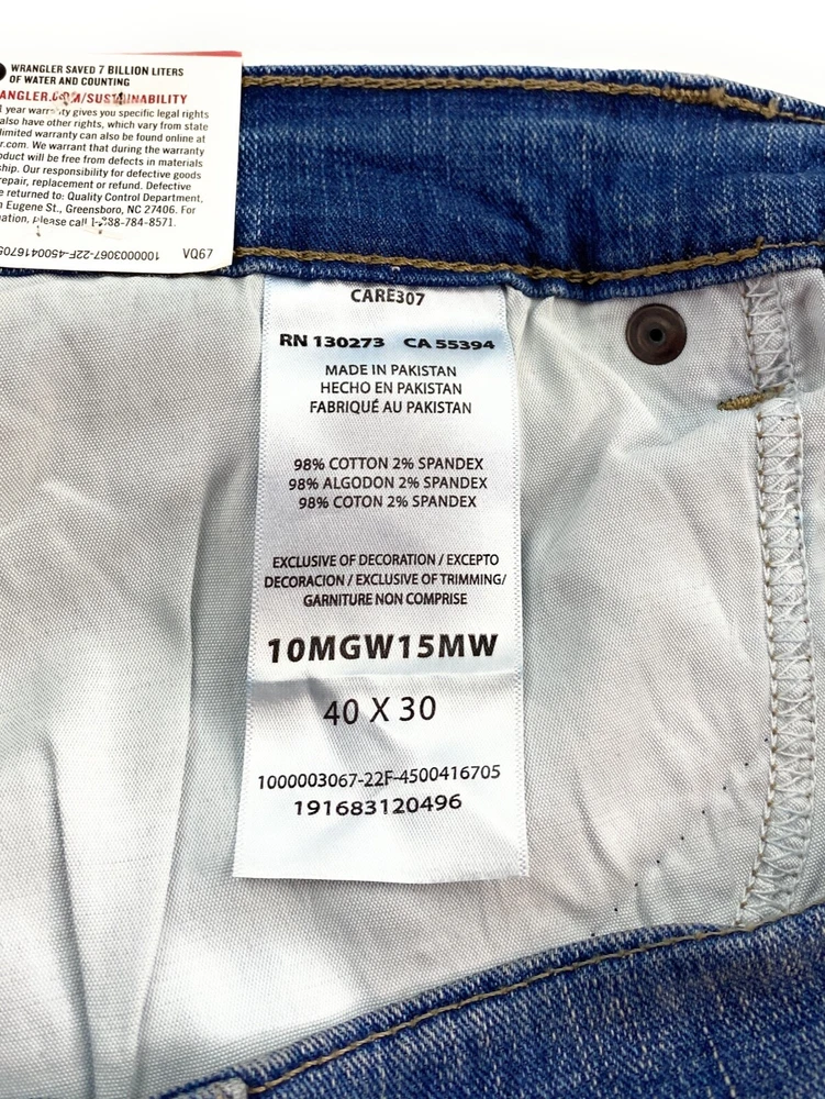 gtin13: 0191683120496 Rise: High (Greater than 12 in) Features: Lightweight, Slimming, Breathable, Easy Care, Stretch, Distressed, Pockets, Comfort Pattern: Solid Size: 40 Fit: Relaxed Material: Cotton, Cotton Blend Color: Blue Waist Size: 40 in Brand: Wrangler UPC: 0191683120496 Theme: Grunge, Preppy, Southwestern, USA, Hipster, Cowboy, Logo Type: Jeans Season: Spring, Winter, Fall, Summer Size Type: Regular Closure: Button, Zip GTIN: 0191683120496 Handmade: No Pocket Type: 5-Pocket Design, Coin Pocket Garment Care: Machine Washable MPN: 10MGW15MW Inseam: 30 in Accents: Button, Zipper, Logo Style: Straight Fabric Type: Denim Fabric Wash: Medium