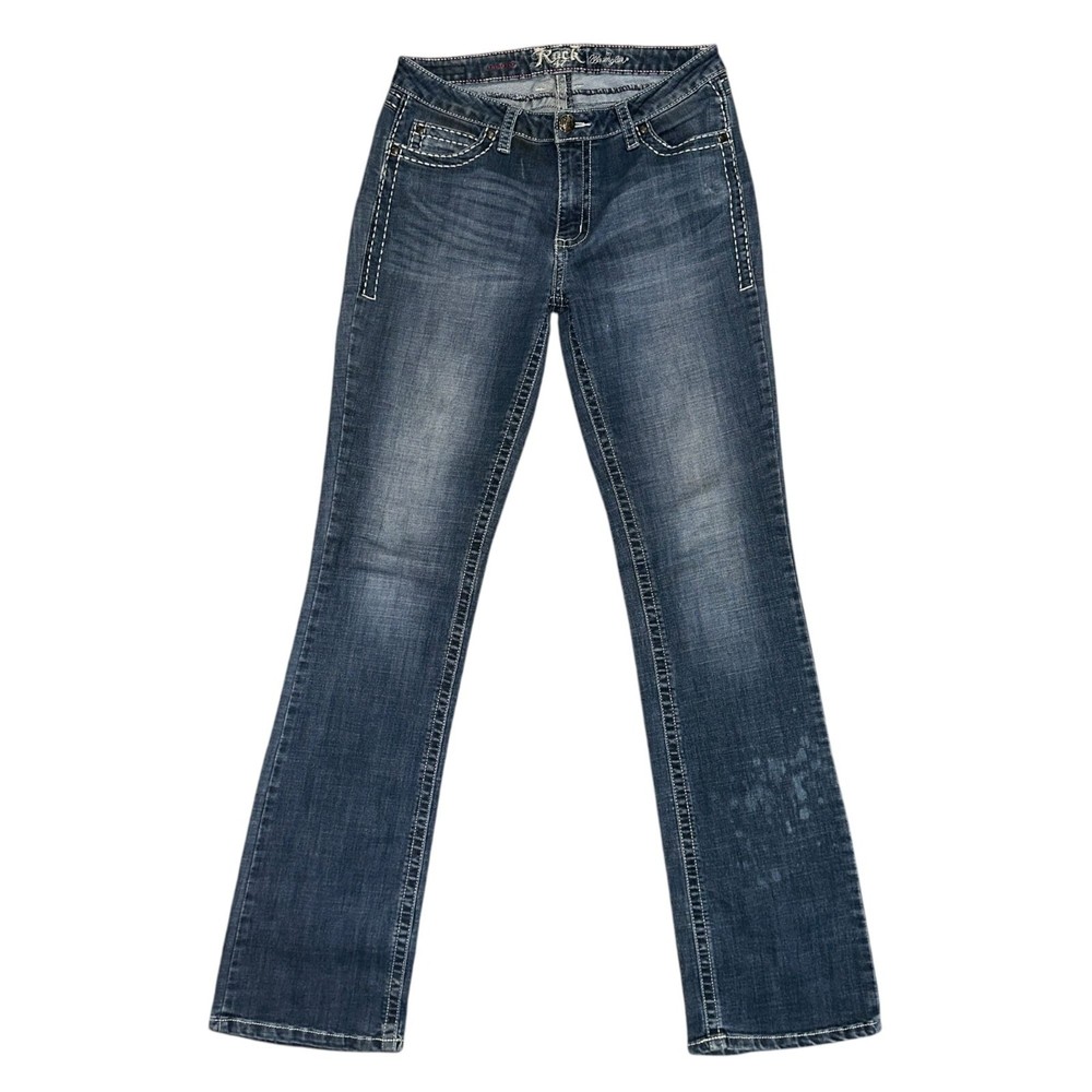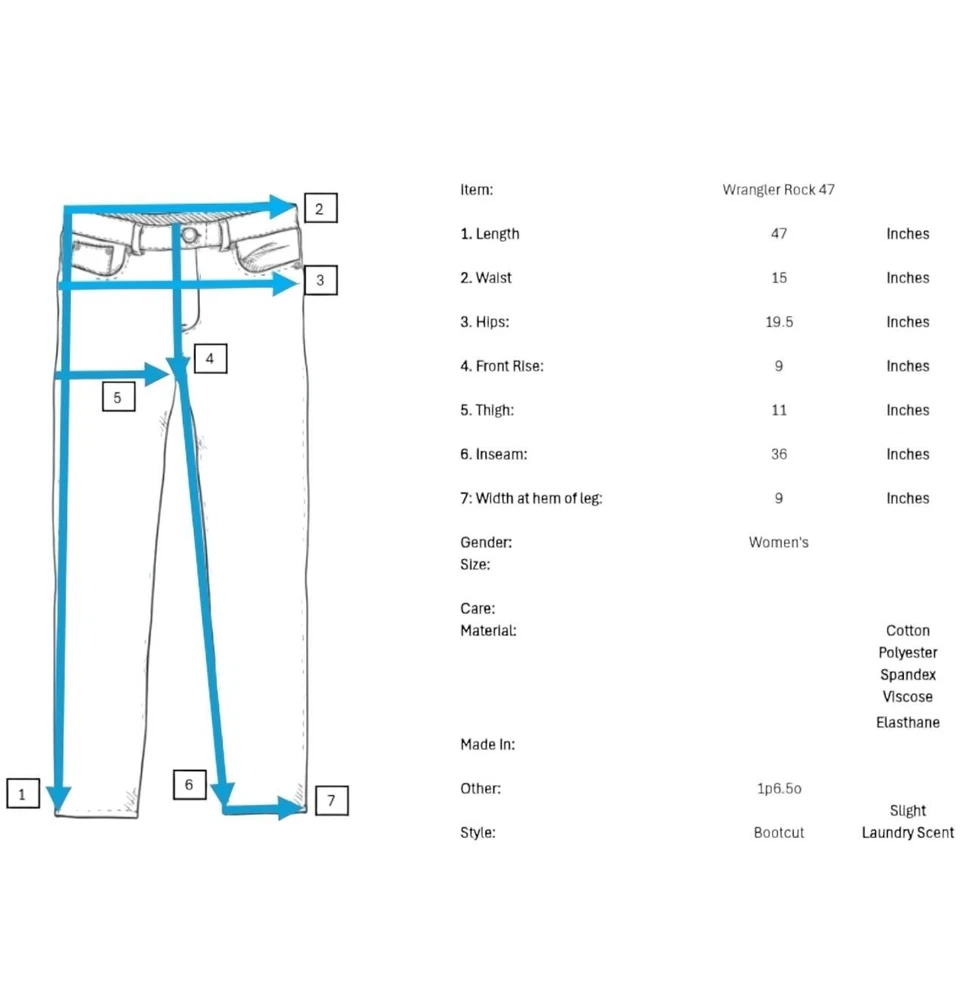 Features: • Brand: Wrangler • Type: Jeans, Bottoms • Style: Bootcut, Boot Cut • Line: Rock 47 • Front: Flat • Season: Spring, Summer, Fall, Winter • Pattern: Solid • Made in Tag is faded • Care: Tag is faded • Rise: Low Rise • Color: Blue, Silver, Cream • Wash: Medium • Features: Embroidered, Rhinestones, Embellished • Closure: Zipper Fly • Material: Denim, Tag is faded • Size: Junior's 9, Tag is faded, Check measurements prior to purchasing • Condition: Good, some fading and wear, Laundry scent • Other: Western, Cowboy, Cowgirl, Dance, Rodeo, Show Measurements are Approximate: Length: 47 in / 119 cm Waist: 15 in / 38 cm Hips: 19.5 in / 50 cm Front Rise: 9 in / 23 cm Thigh: 11 in / 28 cm Inseam: 36 in / 91 cm Width at hem of leg: 9 in / 23 cm Orders shipped within 1-2 business days. 01127010001