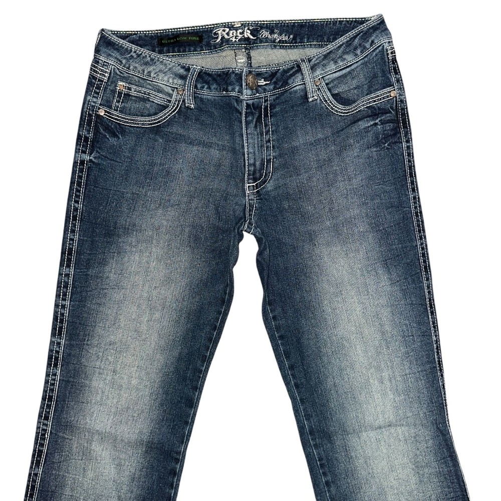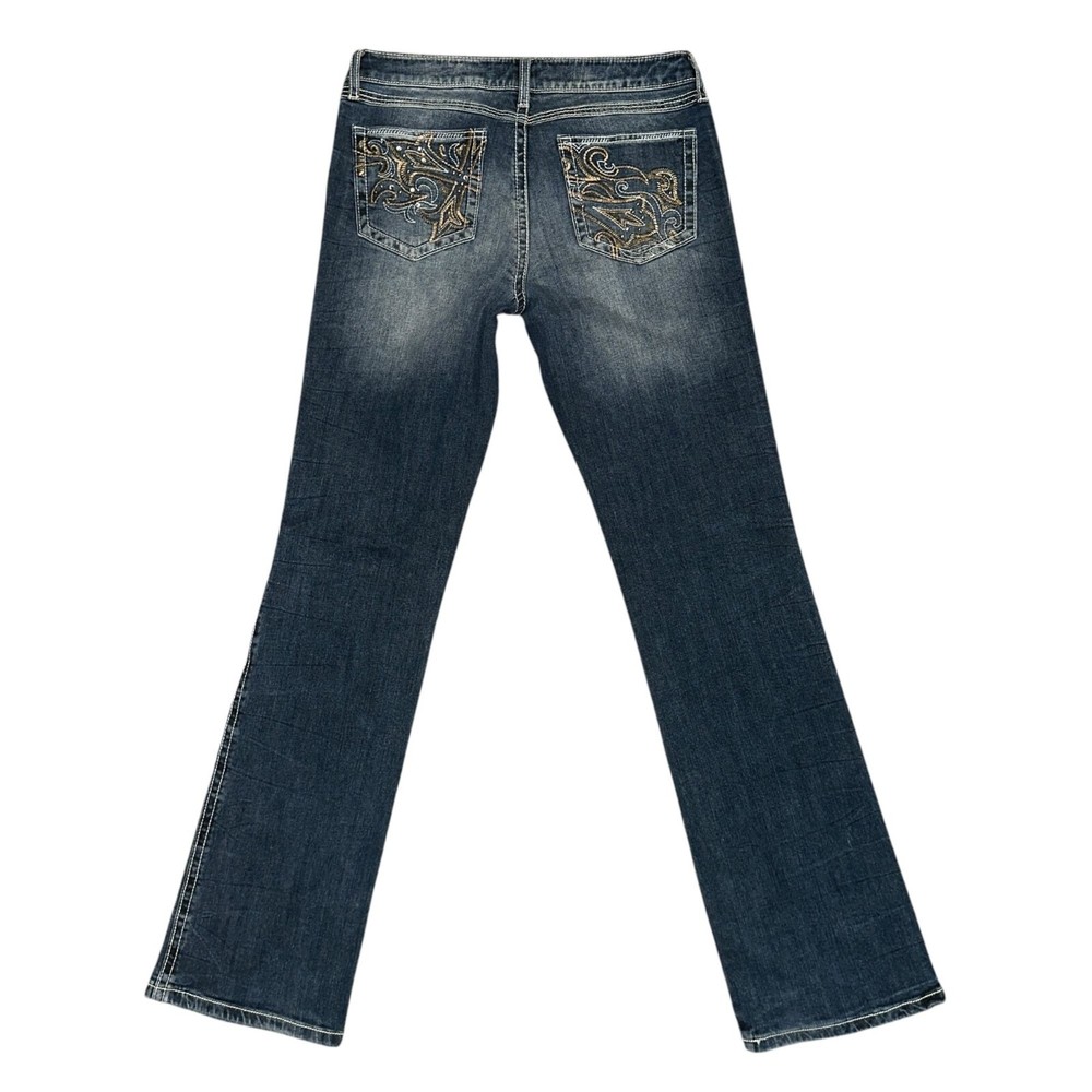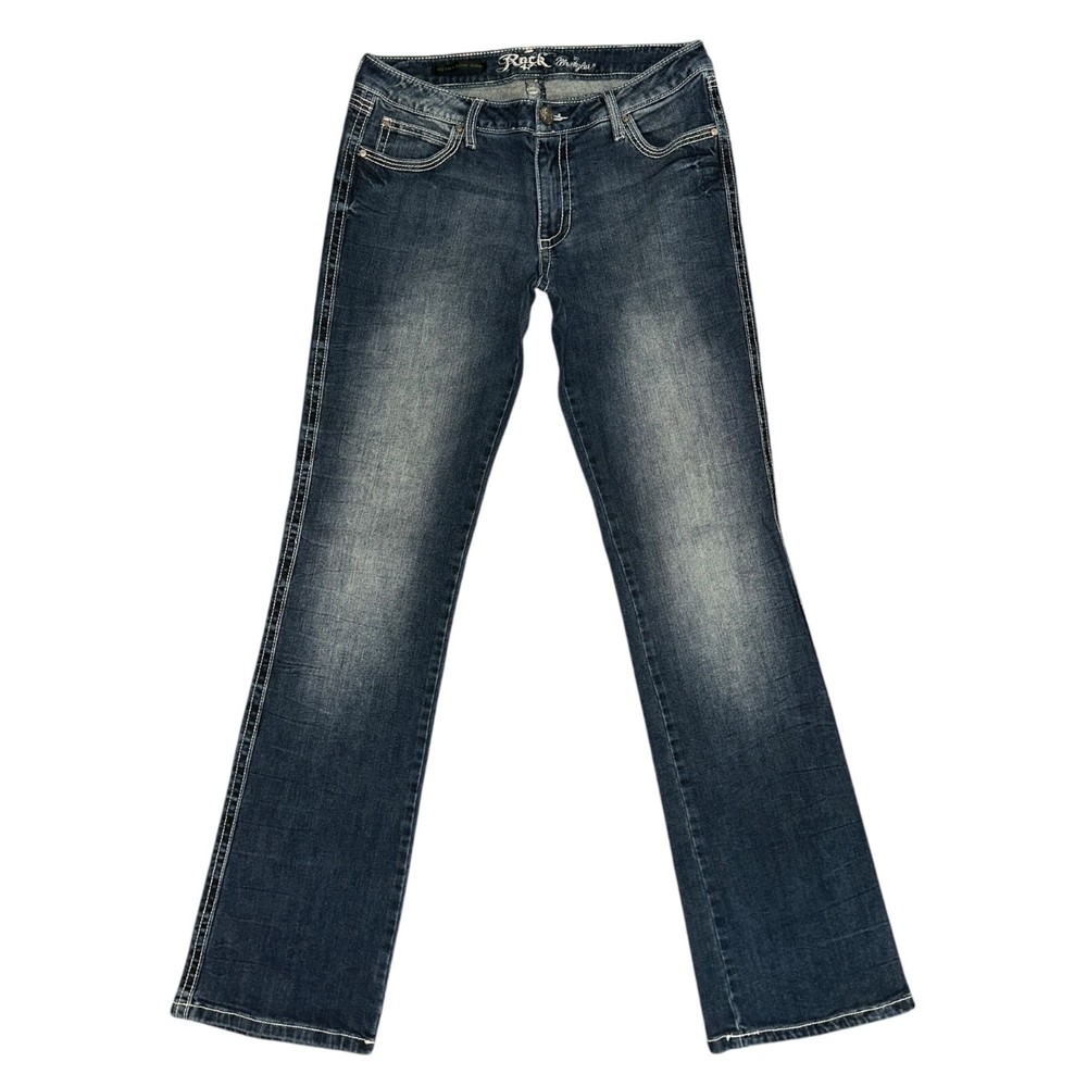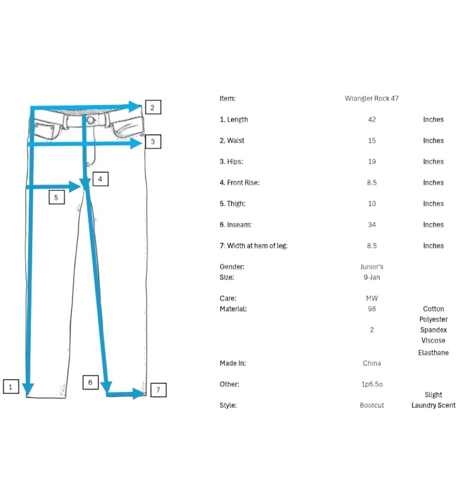 Features: • Brand: Wrangler • Type: Jeans, Bottoms • Style: Bootcut, Boot Cut • Line: Rock 47 • Front: Flat • Season: Spring, Summer, Fall, Winter • Pattern: Solid • Made in China • Care: Machine Wash • Rise: Ultra Low Rise • Color: Blue, Gold • Wash: Medium • Features: Embroidered, Studded • Closure: Zipper Fly • Material: Denim, 98% Cotton, 2% Spandex • Size: Junior's 9 • Condition: Good, some fading and wear, Laundry scent • Other: Western, Cowboy, Cowgirl, Dance, Rodeo, Show Measurements are Approximate: Length: 42 in / 107 cm Waist: 15 in / 38 cm Hips: 19 in / 48 cm Front Rise: 8.5 in / 22 cm Thigh: 10 in / 25 cm Inseam: 34 in / 86 cm Width at hem of leg: 8.5 in / 22 cm Orders shipped within 1-2 business days. 01127054901