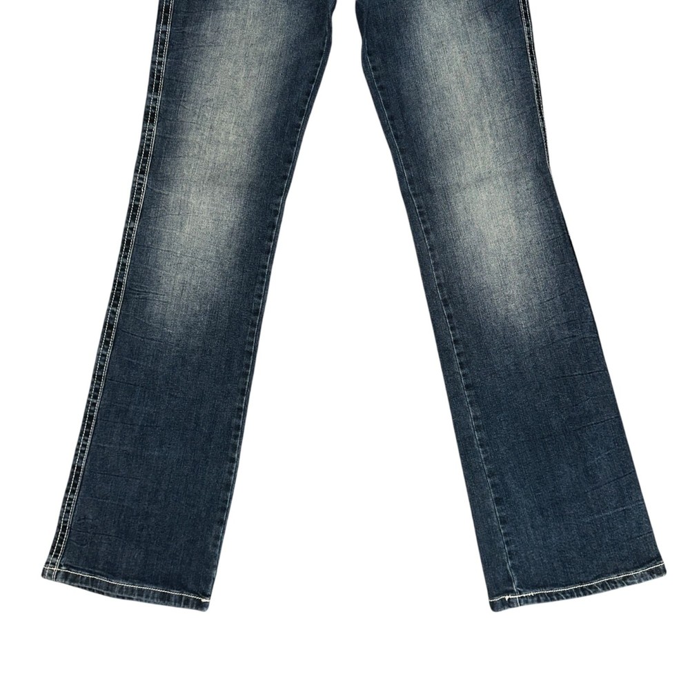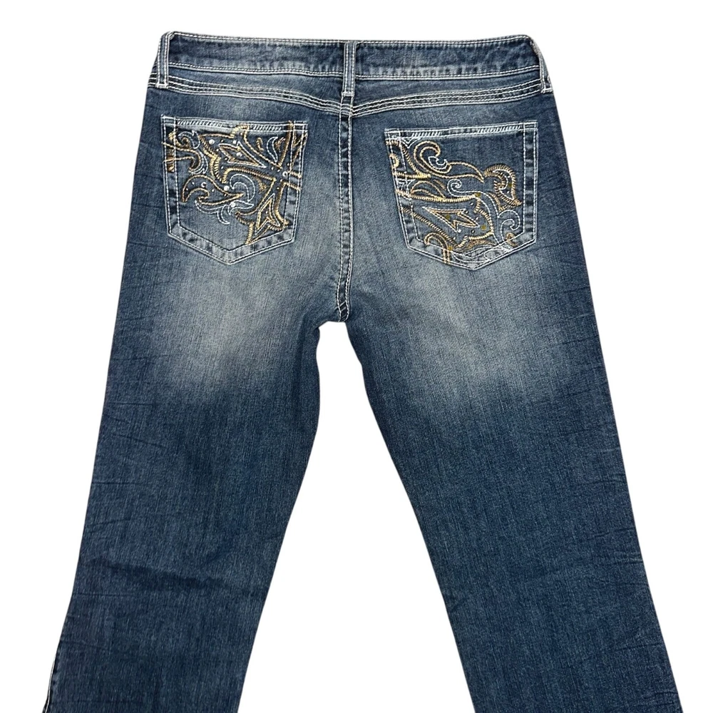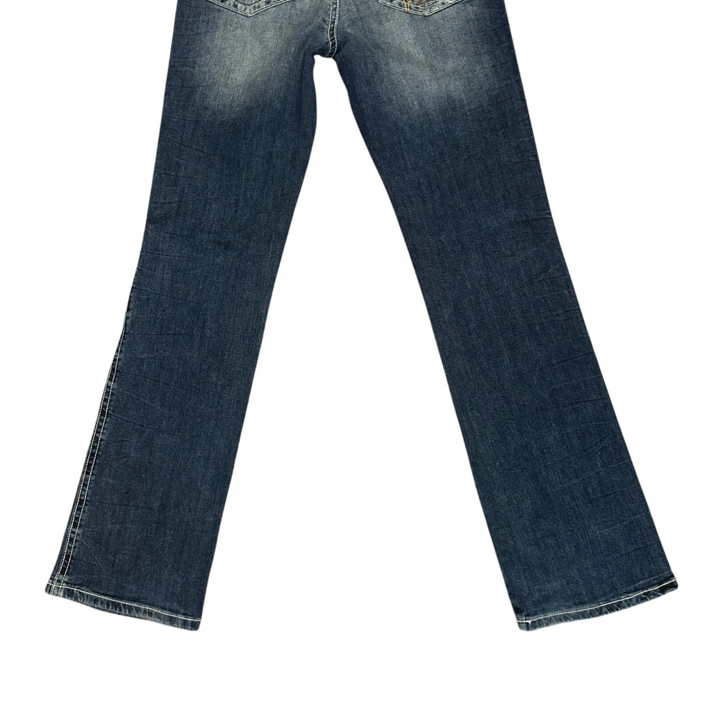 Features: • Brand: Wrangler • Type: Jeans, Bottoms • Style: Bootcut, Boot Cut • Line: Rock 47 • Front: Flat • Season: Spring, Summer, Fall, Winter • Pattern: Solid • Made in China • Care: Machine Wash • Rise: Ultra Low Rise • Color: Blue, Gold • Wash: Medium • Features: Embroidered, Studded • Closure: Zipper Fly • Material: Denim, 98% Cotton, 2% Spandex • Size: Junior's 9 • Condition: Good, some fading and wear, Laundry scent • Other: Western, Cowboy, Cowgirl, Dance, Rodeo, Show Measurements are Approximate: Length: 42 in / 107 cm Waist: 15 in / 38 cm Hips: 19 in / 48 cm Front Rise: 8.5 in / 22 cm Thigh: 10 in / 25 cm Inseam: 34 in / 86 cm Width at hem of leg: 8.5 in / 22 cm Orders shipped within 1-2 business days. 01127054901