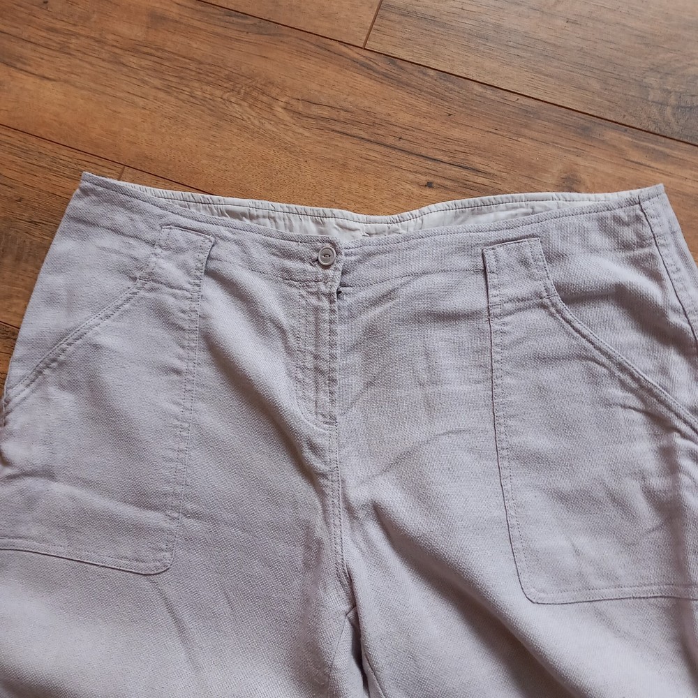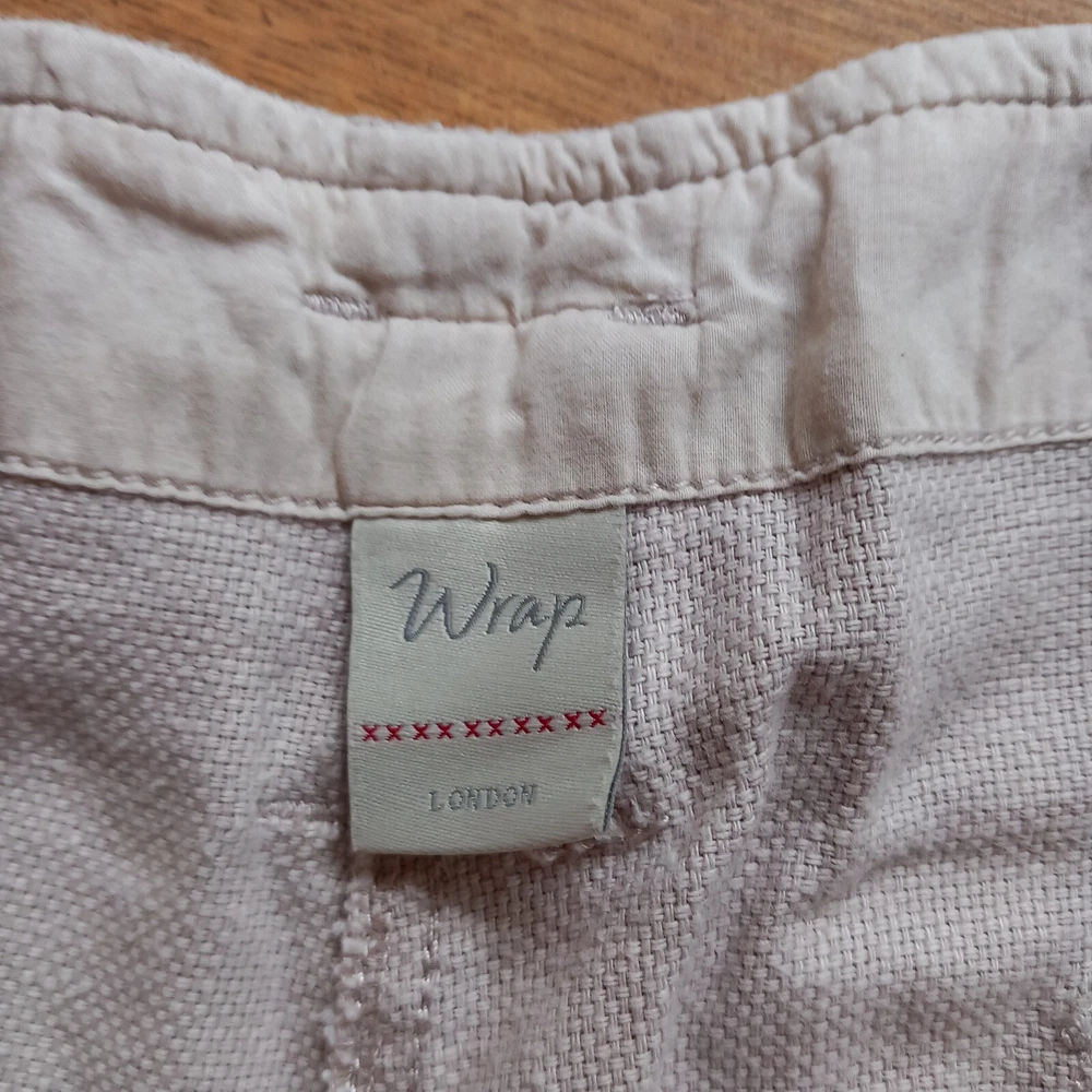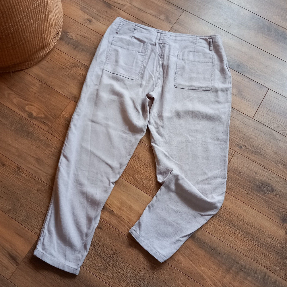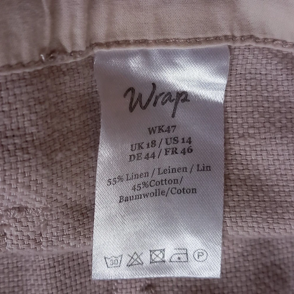 Gently used condition with no faults found. Stone beige colour neutral heavier linen cotton blend tapered trouser from WRAP London. Measures 19" across waistband, 11" rise, 23" across hip area approx, 30" inside leg. 55% linen 45% cotton.