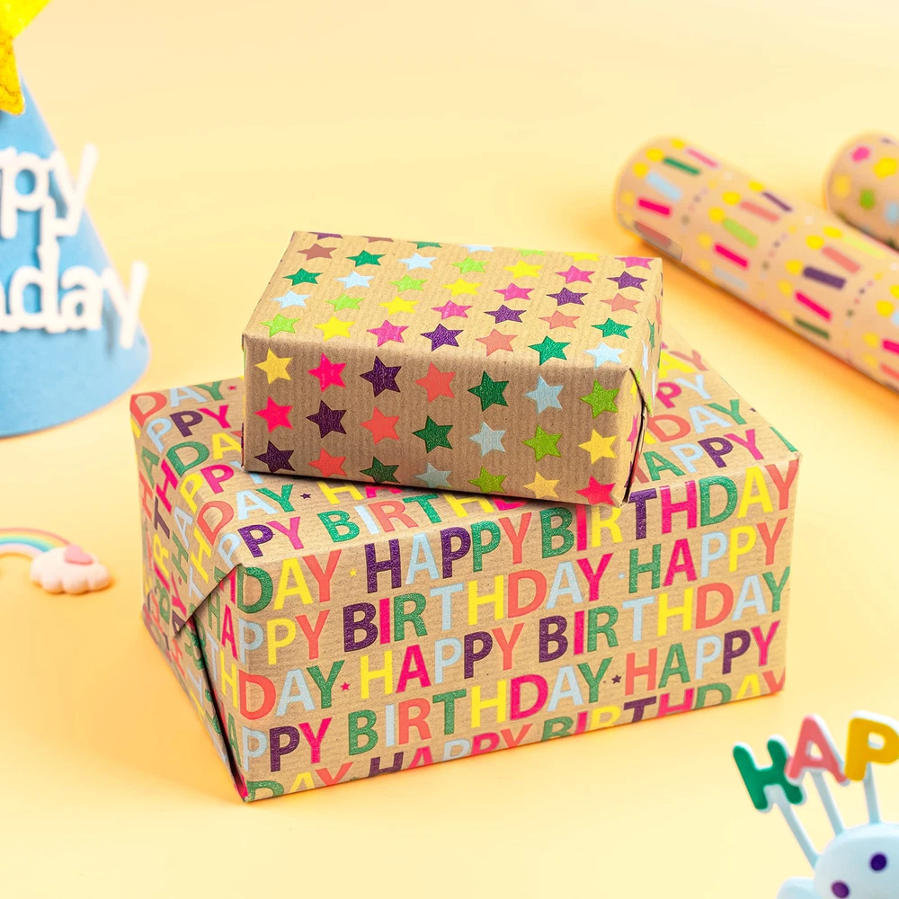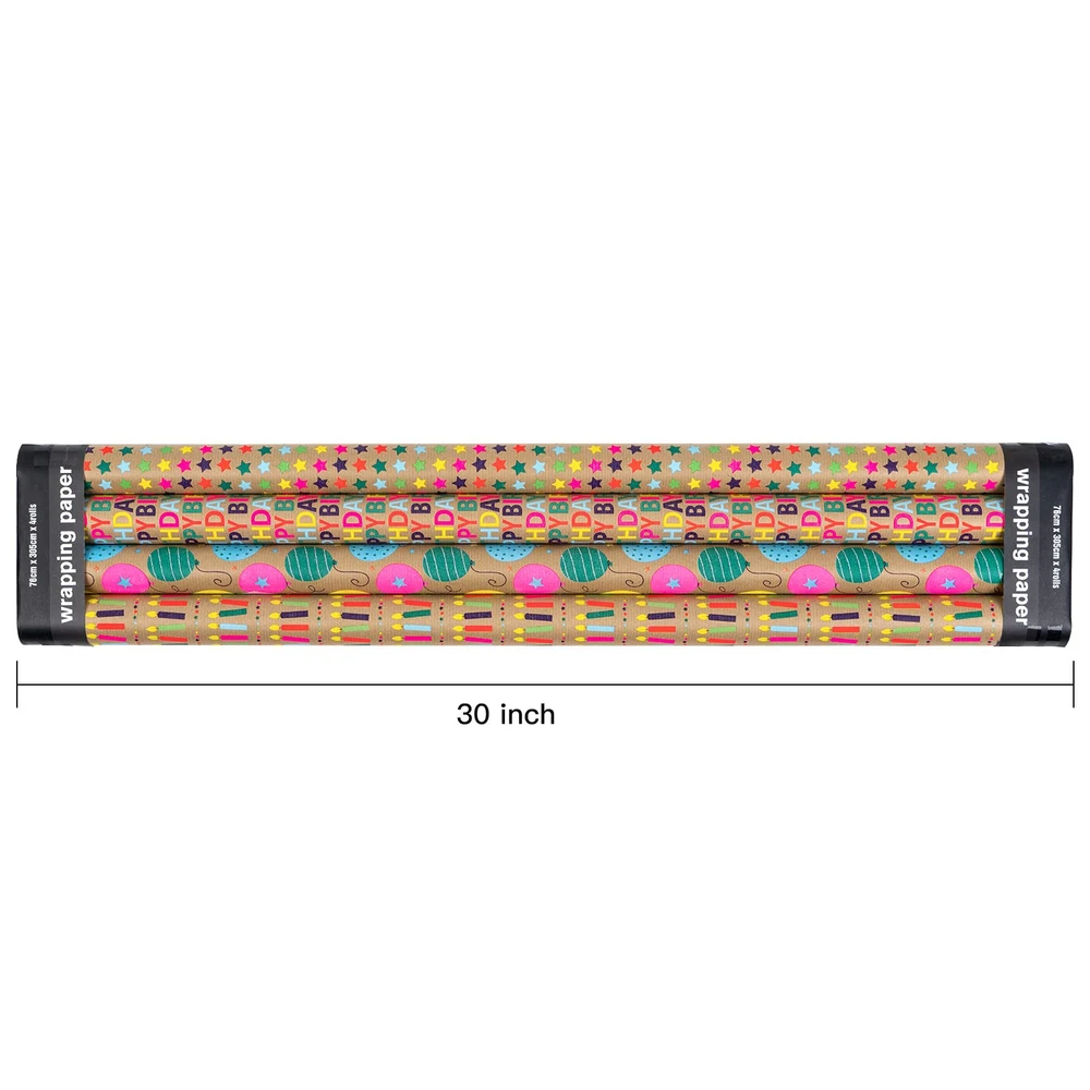 Size: Each roll is 30 inches x 10 feet, equal to 25 sq.ft, total of 4 rolls, can wrap many gifts Design: Kraft wrapping paper, 4 different designs, Candles, stars,Printed with the words Happy Birthday and Birthday Candles, add a colorful touch to any gift Material: Made from high-quality kraft paper, recyclable and environmentally friendly composition Features: There is a grid cutting line on the reverse side, which is convenient for cutting when wrapping gifts These wrapping paper is perfect for birthday, parties and can be used to add a splash of color to all of your gifts. Also great for Showers, Weddings, Events, and any of your other seasonal gifting needs