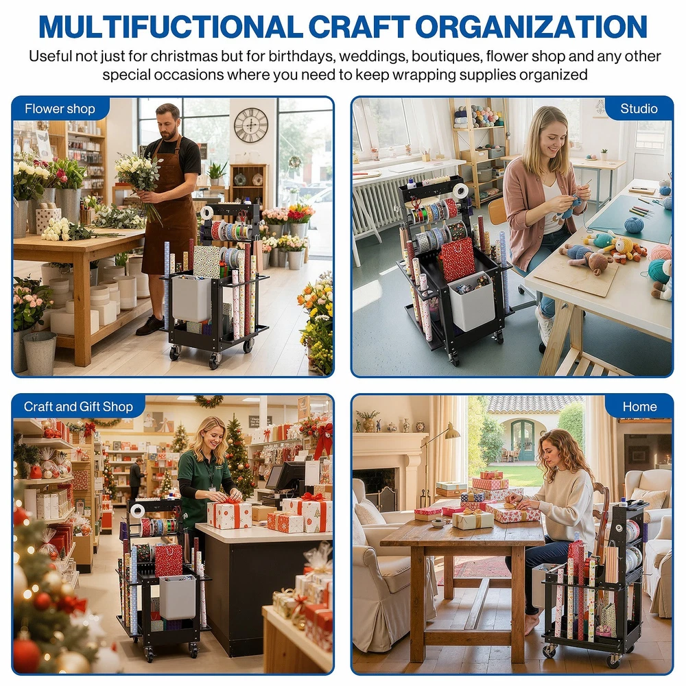 Pochar Wrapping Paper Storage Cart - Rolling Gift Wrap Station with Hooks Storage Ribbons and Gift Bags - Craft Wrapping Paper Organizer Holder with Tape Holder and Baskets for DIY Tools, Craft Supplies About this item: GIFT WRAPPING STATION: Tired of frantically looking for packaging tools when you need to wrap gifts? Pochar gift wrapping organizer cart can solve your problem. It neatly organized all gift wrapping tools in this gift wrapping organizer storage cart, equipped with a flat top for effortlessly wrapping presents. Keep your supplies within arm's reach and enjoy a tidy workspace with this rolling craft cart. AMPLE STORAGE FOR CRAFT SUPPLIES: This craft storage organizer features 2 row wrapping paper holder, can hold 14 rolls wrapping paper; and provides 3 spool in the middle, which can store ribbons, strings, tapes and hemp ropes, and more. The craft organizer holder provides 18 hooks and holes for hanging tools such as scissors, embroidery threads, packaging bags, and gift bags. EXTRA STORAGE SPACE: Our wrapping paper organizer storage cart is equipped with a storage compartment on the top, which can store small items such as markers, pigments and greeting cards. The ergonomic handrails at the back make it effortless for you to move the rolling craft cart. In addition, it provides a hanging trash can, allowing you to complete the gift wrapping task in one place. MOBILITY & DURABILITY: Move your craft cart effortlessly with its four 360° swivel wheels, two of which feature locking mechanisms for added stability. You can transport the craft supplies cart anywhere or secure the cart in place while you work. Made of 100% durable steel that ensuring the long-lasting in a high-traffic environment, ideal for schools, gift shop, shopping mall, boutiques, flower shop, and so on. EASY ASSEMBLY & WIDE APPLICATION: This DIY craft station can be assembled in just a few simple steps. Detailed videos and the customer service team in California will help you complete the assembly quickly. The practicality and durability of POCHAR Utility Storage Rolling Cart make it also suitable as a tool cart, cleaning cart, an office supplies storage cart and a multi-functional cart. This item is brand new . If you are interested interested in our open box discount visit our eBay store. All POCHAR products are sold with a one (1) year manufacturer warranty including replacement parts. Thank you for making eBay a great place to shop! Check our eBay Store Front for more product listings! POCHAR Sales | eBay Stores Thanks for shopping POCHAR! The actual color of the product may be different from the image you see. This is due to the fact that every computer monitor, laptop, tablet and phone screen has a different capability to display colors and that everyone sees these colors differently. We try to edit our photos to show all of our products as life-like as possible, but please understand the actual color may vary slightly from your monitor.