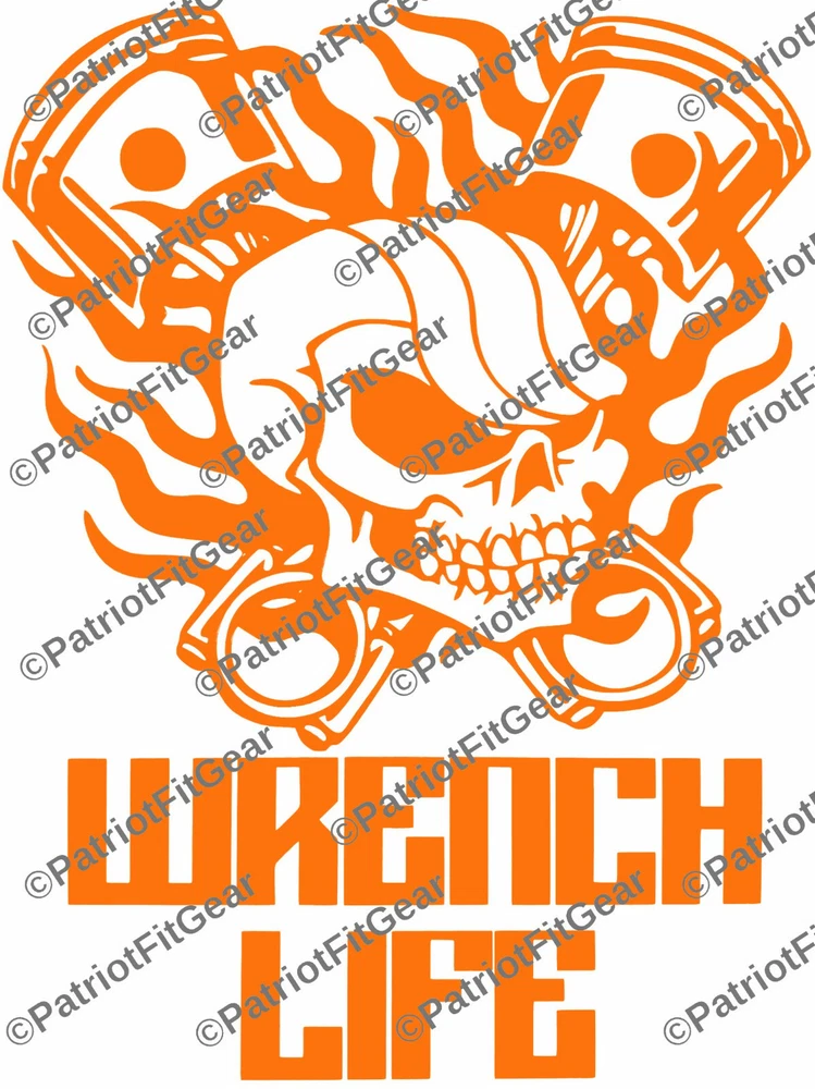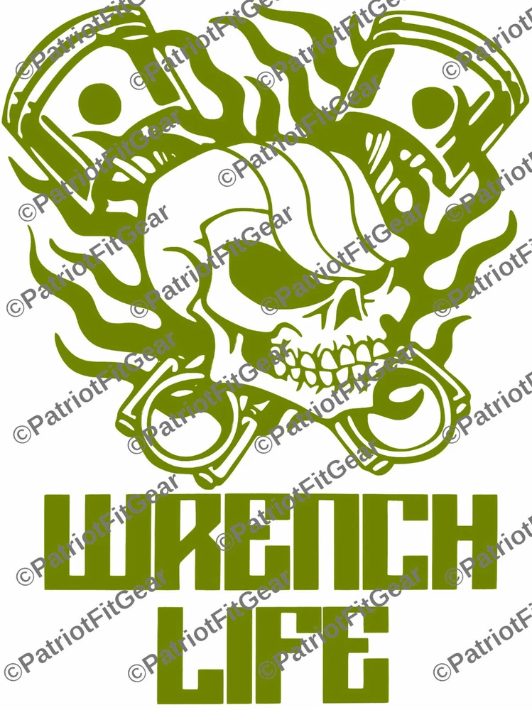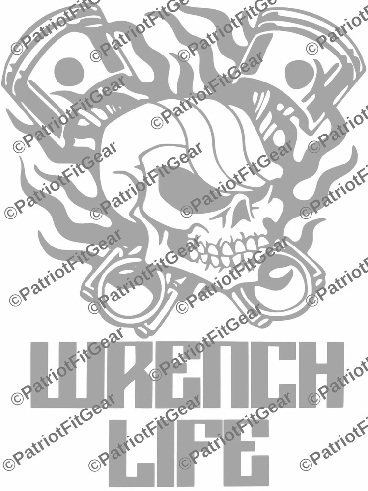 Wrench Life,Mechanic,Gear Head,Wrenching,Skull,Pistons,Stickers,Vinyl Decal PatriotFitGear SIZE IS Aprox 4.5"x6" If you need a different size please ask. Decal is Vinyl Cut so it will be one single color. The vinyl is 3MIL, resistant to Sun, Rain, Snow & Sleet. The decal will stick to any hard, smooth surface and are suitable for wet locations (Boat, Car, Car Window, Laptop, Instrument Cases, Snowboard Decks, School Lockers, Mirrors, etc.) An application (transfer tape) overlay allows for precise and easy placement. All decals are computer cut and are customizable. HOW TO APPLY STEP 1: CLEAN THAT AREA GOOD! First make sure you have a dry place and no wind to install your decal. Make sure to prep the area, this is the most important part of installing a decal! If you put your decal or sticker on a dirty surface, it will just pick that dirt and grime up like a lint roller does your shirt, those aren't so sticky after you use them are they! So let’s make sure the area is nice and clean so that it can adhere to where you are going to place it. You can use soap and water, rubbing alcohol, or any other fast drying cleaner. My favorite is rubbing alcohol since it dries by itself within seconds and leaves no residue behind. On that note, do NOT use anything like Windex or other household spray cleaners that leave a residue behind or oily substance, that defeats the purpose and will cause your decal/sticker not to adhere to the best of it capabilities. STEP 2: DECIDE AND PEEL ! After you have cleaned your car, you now need to decide where you want to center your decal in the area you cleaned. I use a measuring tape to measure from different spots on the car to make sure I have it exactly where I want it and that it will not turn out crooked. When I measure I use a piece of masking tape to mark the measurements, normally four for left/right/top/bottom. Then I have a somewhat boxed area to force me to place the decal where it should go. Be aware after you stick it, you might cannot undo it and use it again, since it can separate the design or text from each other. After you decide where you want it, go ahead and start to peel your decal back, if it doesn't stick to the transfer tape the first pull, replace the transfer tape and push it together with your fingers or use a credit card to press together. STEP 3: PLACE THAT DECAL! So you cleaned your area and also decided how and where you are going to place your new decal or sticker and you made sure your decal can peel apart easily. FOR SMALLER DECALS - Now fully peel the decal off the backing and hold it on the tips of the masking/transfer tape. Try not to touch the back of the decal itself since it could leave dirt on your decals back side. You should have each hand holding the furthest corners from each other and keep it tight so that the decal does not fold in on itself. Place one end of the decal down and then smooth it out to the other end till the decal is fully placed. FOR BIGGER DECALS - Do not fully remove the backing on your decal. You will want to remove about 1/3 of the backing and start by applying that 1/3 of the decal to the car. Then slowly pull more of the backing off while at the same time apply the decal to the car until you have fully installed the decal. Either work left to right or right to left, which ever you feel best doing. Don't forget you can always buy a $1 spray bottle at your dollar store, put ONE small drop of soap in it and fill with water and shake. Then LIGHTLY (I MEAN LIGHTLY) spray the area and then apply the decal. This is only suggest for bigger decals or decals that you need to be in a precise area. STEP 3: THE HARDEST PART! Waiting... yes this is the hardest part, because most people are so impatient that they can't wait and they mess up the decal by removing the transfer tape too early! The best way to allow your decal to dry is out in the sun, having it in the shade or in a cool place will only make it take longer. If you used a mist of soapy water when installing your decal and do not let the sun dry it, then it will take a very long time before it adheres correctly, since nothing is there to remove the water and dry the decal to the surface. Do not try and rush this buy using a heat gun, you can melt the transfer tape and vinyl and when you peel it, it could cause the decal to stretch with the transfer tape. Again the best way is the sun. Finally just give the decal 30 minutes before you remove the transfer tape, go inside and eat lunch. By the time you’re done you should be able to go back outside and finish your decal and be in a good mood from that great lunch and nice cold sweet tea! If your decal is still not sticking, make sure you got it in the sun and it is warm outside, and just give it a bit longer. After ~30 minutes to dry, remove transfer paper.