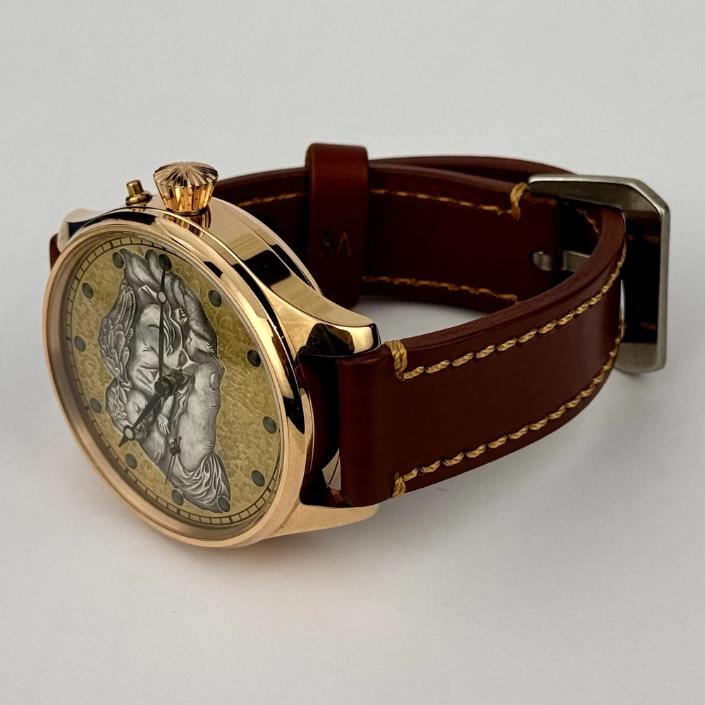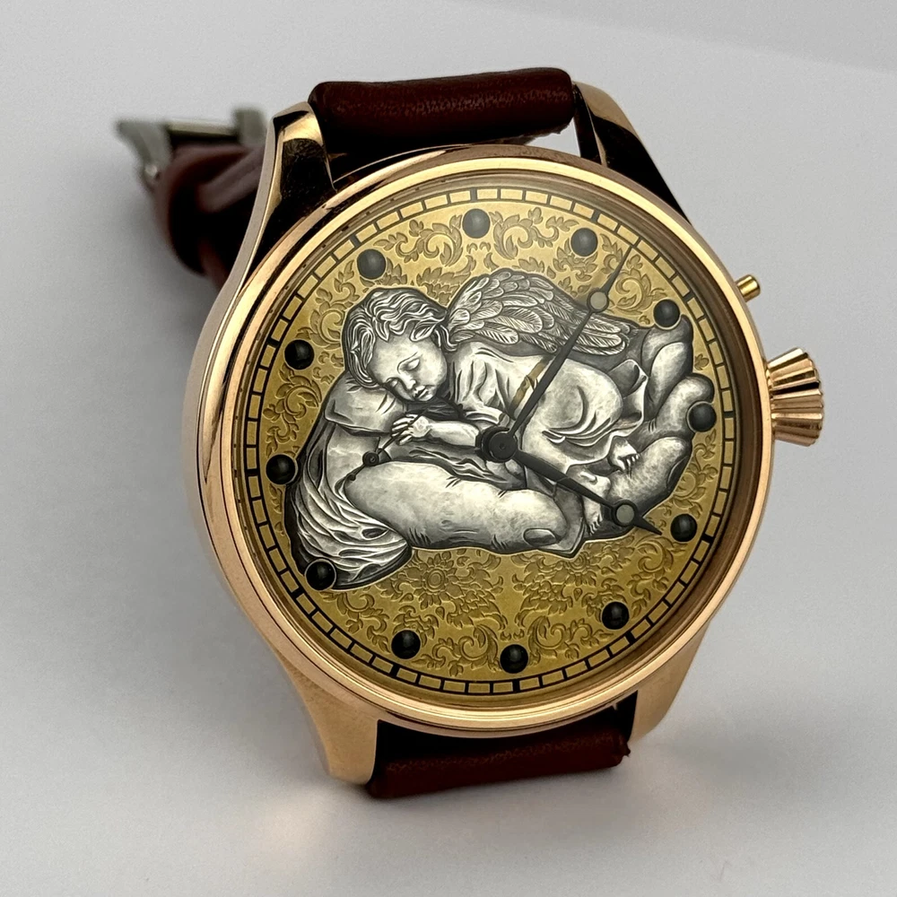 Exclusive "Marriage" watch - a masterpiece of watchmaking art where vintage movement gets new life in a modern case. Each piece is hand-assembled with attention to detail. These aren't just watches, but history reborn through skillful fusion of different eras. WE CAN CREATE UNIQUE CUSTOM WATCHES FROM SCRATCH ACCORDING TO YOUR DESIGN IN A SINGLE PIECE. Message us! Want to participate in creating your unique skeleton watch design? Share your ideas and after careful work, we'll present you with your unique design. The Little Angel watch is a symbol of protection and hope. This timepiece carries deep meaning—it serves as a reminder that we are all children in the hands of our Heavenly Father. The stainless steel case is coated with rose gold-colored titanium nitride, symbolizing warmth and divine grace. The hand-engraved dial is adorned with gold plating, silver, and blackening, creating a refined, three-dimensional design. It is also embellished with enamel and luminescent material, making the dot indexes glow in the dark. Hands made using a punched stamp and are also coated with luminescent material. This accessory is more than just a watch—it is a reminder of divine protection, faith, and the light that guides us even in the darkest times. CASE : Stainless steel with gold PVD coating (titanium nitride); STRAP : Included, brown band, 22mm, genuine leather; SIZE : Diameter: 47.6mm; Thickness: 15.6mm; CRYSTAL : Mineral glass front and back; SHIPPING : Within 2 business days after payment; PAYMENT : According to eBay rules; RETURN POLICY: If you are not completely satisfied with your purchase, return the item within 30 days of receiving your watch for an exchange or refund. Buyers with zero rating require prior approval. At the heart of all our watches are vintage movements manufactured since the 1890s, averaging around 100 years old. All movements installed in watches have been restored by our experienced craftsmen. Complete servicing and careful restoration give them new life. Antimagnetic steel case protects this masterpiece. The designer dial is adorned with cold jeweled enamel, each hand perfectly fitted by a master. SPECIFCATIONS: Mineral crystals (sapphire installation possible); Handcrafted genuine leather strap; Custom dial design available; All dials are on feet. ADDITIONAL SERVICES: 1) Replacement of mineral crystal with sapphire one: Starting from $60 for front crystal (from 38mm); Starting from $40 for back crystal (from 37mm). Crystal diameter varies for each watch, please inquire via private message for exact cost. 2) Custom engraving available on case back. Clarify the price in the message. 3) You'll receive the watch in an exclusive branded wooden box - perfect for a WOW effect gift (without extra charges)! About us: Extensive experience in creating skeleton watches since 2011. Each design is crafted by masters of their craft, investing experience, knowledge, and soul. IMPORTANT CARE RECOMMENDATIONS: Not water-resistant, keep away from moisture; Avoid bumping or dropping the watch; Wind carefully without excessive force; Set time clockwise only; Keep away from magnets; Service every 2-3 years; Acceptable daily rate variation ±3 minutes.