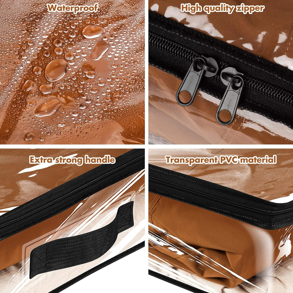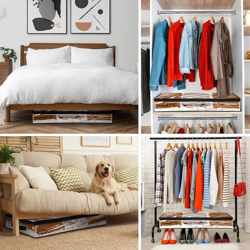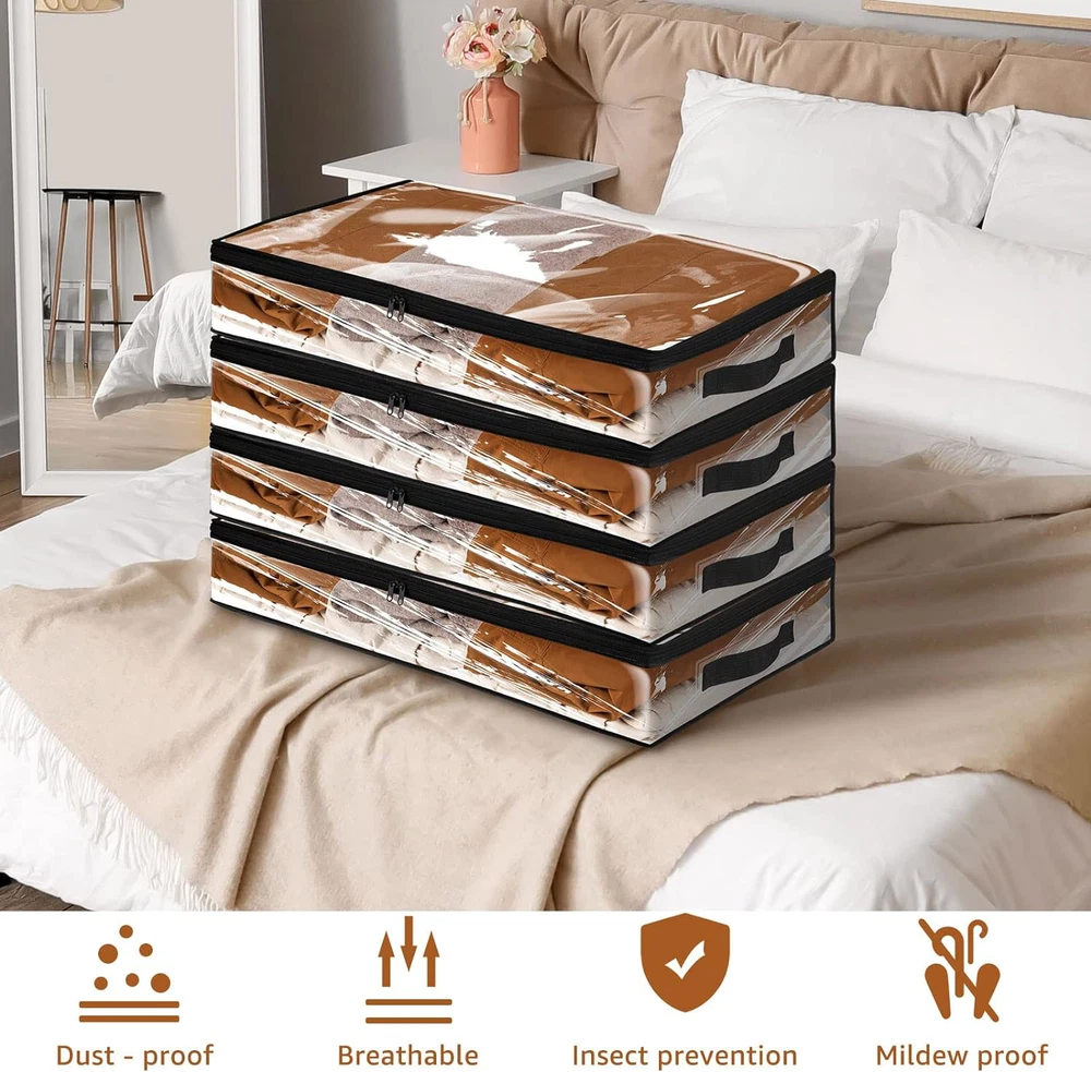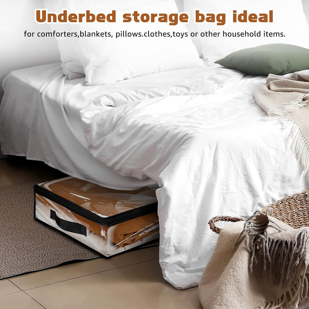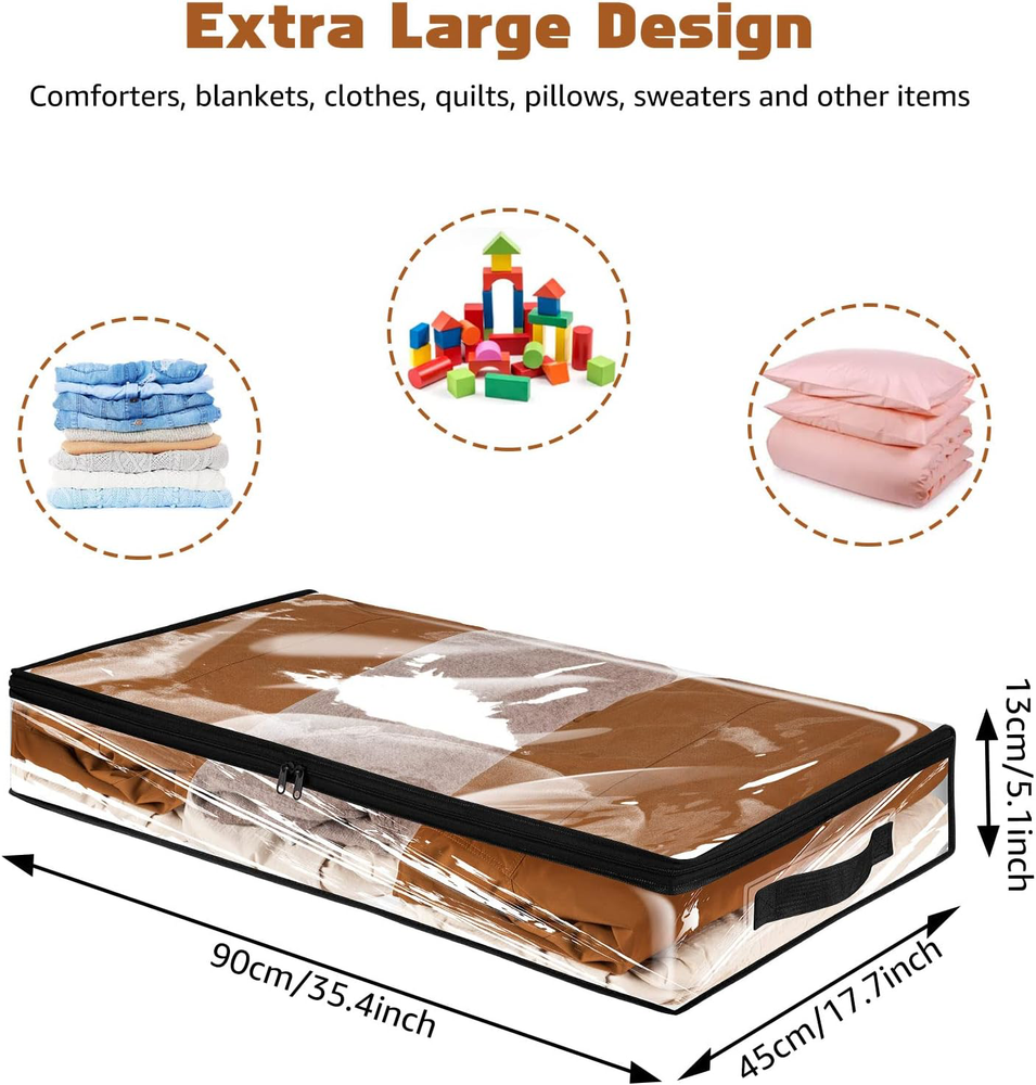 Wsryx 4 Pack Clear Under The Bed Storage Boxes with Lids, Foldable Large Sofa ???Fully Clear Design???The underbed storage bag is made from heavy-duty PVC material. White polyester webbing with a fully transparent box body with an easy to slide nylon zipper and a transparent visible design that makes the storage bags easy to identify all your stored items without opening the package. ???Large Space???- 4 pack clear under bed storage container. Size: 90 x 45 x 13 / 35.4 x 17.7 x 5.1 inches with large capacity, fits perfectly under bed for storing your off season clothes, comforters, duvets, shoes, toys etc. ???Reinforced Handle & Zipper???Long storage box with 2 handles so you can easily pull the bag out. With two-way zipper, it is more convenient to open and close when lying flat. ???Improve Space Utilization??? This underbed storage bag height designed for most underbed space, the underbed storage bags works well for storing items like blankets, linens, pillows, plush toys, comforts, bedding, seasonal clothes, shoes, holiday decorations, wrapping papers and etc. ???The Best Customer Service???If any problem with the storage bag, please fell free to contact with us and we will make a refund or change a new one without any problems.