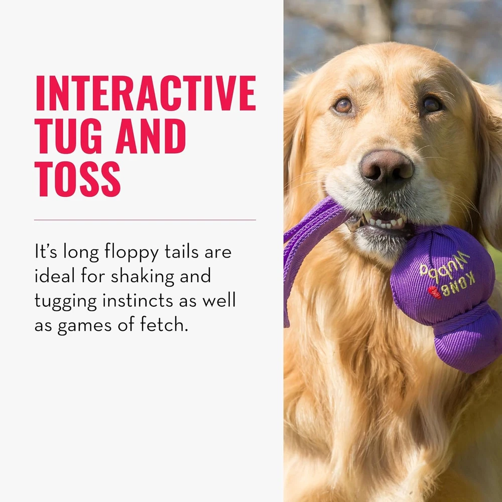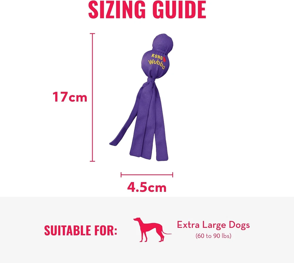Tug Toy for Dogs: The KONG Wubba is a fun, interactive tug-and-toss toy perfect for casual games of tug of war and fetch Reinforced Fabric Toy for Playtime: This tug of war dog toy is designed with a durable reinforced nylon exterior and unique ball shapes Interactive Toy for Dogs: Ideal for interactive or solo play, this dog toy features long floppy tails for shaking and tugging instincts Outdoor & Indoor Dog Toy: KONG Wubba dog toy is designed with a squeaker for added engagement and reinforced fabric for long-lasting fun KONG: Innovating since 1976 to enrich the lives of pets with the highest quality pet toys and treats; all toys are designed and tested in Golden, CO, and are covered by KONG's Satisfaction Guarantee KONG Wubba is a fun, interactive toss and tug toy. Durable reinforced nylon fabric covers two rubber balls - a tennis ball on top and a squeaker ball beneath. Available in assorted colors.