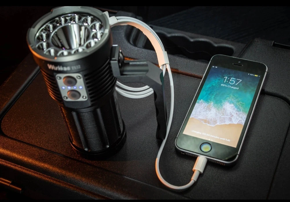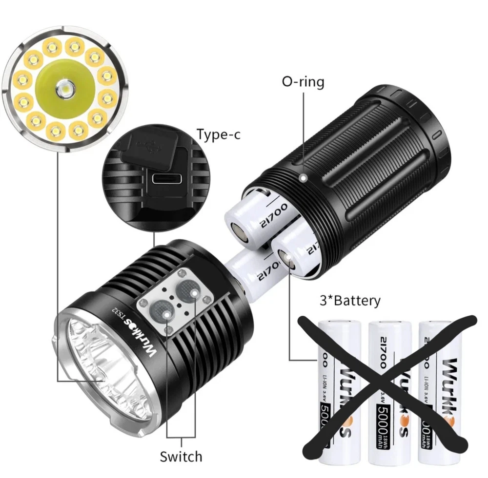 New Wurkkos TS32 Flashlight comes in original packaging. Comes with x1 Flashlight, x2 Spare O rings, x1 handle, x1 charging cable, x1 manual. (BATTERIES NOT INCLUDED) Message me about including batteries if needed for a small additional fee More specifications in the last photo Next day shipping from Minnesota. TS32 delivers a maximum output of, 13000 lumens with a maximum range of 590 meters . TS32 Come with 12 pieces around Floodlight High CRI LEDs and 1 pieces Middle spotlight LED , has double side switches to controls each beam,It also provides an improved, user friendly interface and simple one-hand operation. It is powered by triple 21700 Li-ion rechargeable battery and it is rechargeable via USB-C as well as Reverse charging for optimum convenience. The flashlight features two mode groups: Group 1 with stepped modes and Group 2 with a stepless ramping mode. Specifications Emitter: (High CRI) 12* LH351D 5000k +1* Luminus SFT40 Reflector: Smooth reflector Driver: FET circuit(floodlight)+Buck constant current circuit(Spotlight) Beam angle:spotlight 7°, floodlight 78° Operating voltage: 2.7V – 4.2V Battery options: 3* 21700 Li-Ion battery Dimension: 132.4mm (length) x 62.4mm (head diameter) Weight: 435 ±1 grams (without battery) Flashlight body: Aerospace grade 6061 grade aluminum alloy, CNC manufactured to hard-anodized to military grade specification type III, anti-abrasive finish to get solid built body, anti-crash geometry and better heat exchange. Toughened mineral glass lens Water resistance i.a.w. IP68 Mode Memory: memorizes the last brightness level used in the general modes (except Strobe) Reverse polarity protection to protect against improper battery installation. Advanced Temperature Regulation (ATR) technology: ATR will reduce the brightness level automatically when the driver temperature reaches 55℃ to prevent overheat