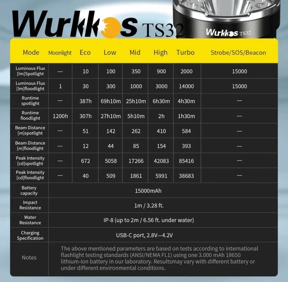 Item Weight: 435g Power Source: Battery Operating Time: 387 Hours on Eco Mode Battery Technology: x3 21700 Lithium Ion (Not Included) Item Length: 5.2 Inches / 132 mm Features: Handheld, Rechargeable, Waterproof Number of LEDs: x12 LH351D Floodlights / x1 SFT40 Spotlight Material: Aluminum IP Rating: IP68 Item Height: Head Diameter 2.4 Inches / 62 mm Lighting Technology: LED Lumens: 15000 Lumens Brand: Wurkkos Type: Flashlight Number of Lights: More Than 12 Model: Wurkkos TS32 Number of Batteries: 3 Operating Range: 586 Meters Color: Black