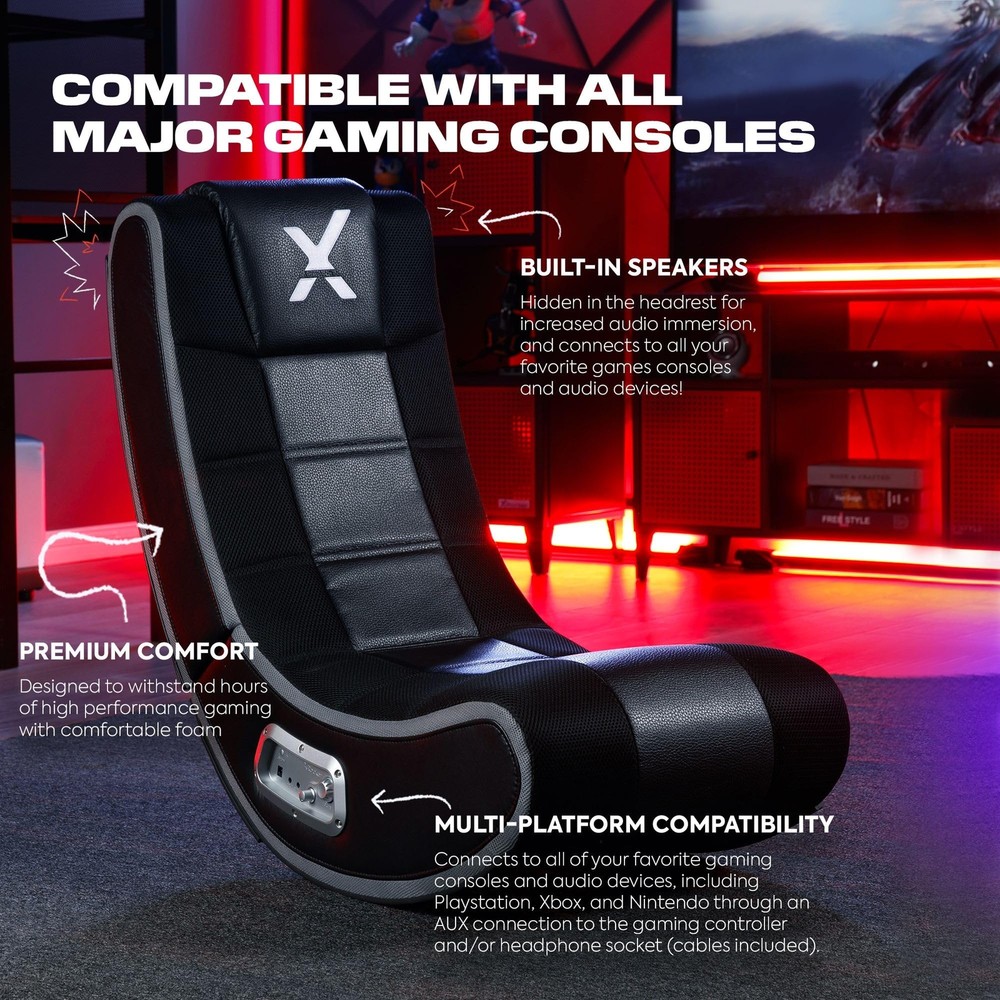 Upgrade your gaming setup with the X Rocker SE Audio Floor Rocker Gaming! Kids, teens, and adults alike, can now be fully immersed in video games, shows and movies with the chair’s impressive built-in audio system. This high-tech rocker-style chair has 2 speakers and a subwoofer that uses X Rocker’s innovative Audio Force Modulation Technology to boost sound quality and intensify your gaming experience! Best fit for mobile and console gaming, with intended display on TV or mobile. Compatible with all your favorite gaming consoles such as PS5, Xbox Series X/S, and Nintendo Switch through the 3.5mm port on the controller, as well as Xbox One and PlayStation 4 through a wired connection to the controller if port available, or through a wired connection to the TV. Even connect your wireless devices so you can enjoy video games, movies, music, and more! Play comfortably with its folding ergonomic design and lumbar with neck support for superior comfort. Conveniently play alongside friends with the built-in control panel which includes separate volume and bass controls, input/output jacks for connecting to your audio source and to other chairs for a multiplayer experience. Measuring 25 x 18 x 16, it can fold down to easily store away when not in use. Celebrating over 15 years of success in the industry, X Rocker is renowned for redefining home entertainment for gamers across the globe. Our mission is to make gaming accessible for the whole family. With X Rocker's huge product offering of gaming chairs, desks, and the world's first gaming beds; there's something for everyone to enhance their gaming lifestyle. As always, design and innovation are at the forefront of our vision as we continue to push the boundaries of gaming furniture in today's global market. 2.1 Bluetooth Chair with Lumbar Support: An ergonomic and wireless design that offers support, so you can game or watch movies without discomfort Perfect for Younger Players: The compact folding frame makes this chair the perfect entry-level gaming chair for younger players and smaller bedrooms Versatile Chair Usage: Stylish gaming chair perfect for living rooms, game rooms, dorm rooms, bedrooms, or wherever you game Console & Device Compatability: Compatible with almost all gaming consoles using a wired connection to the device or controller; Bluetooth connection for phones and smart devices By Gamers, For Gamers: X Rocker makes gaming accessible with innovative furniture that enhances the gameplay experience for the whole family