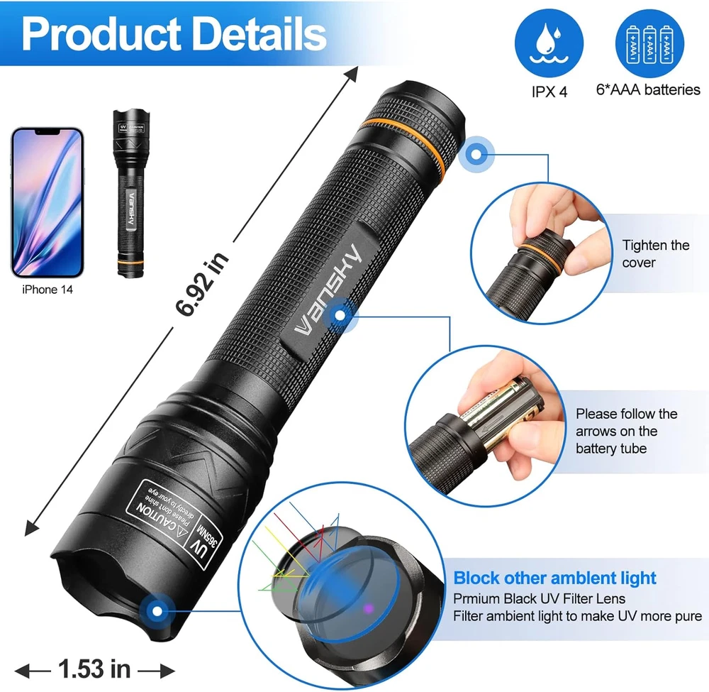 【Precisely Find Invisible Stains】Compared with the 395nm UV light flashlight, the 365nm black light flashlight can find more stains invisible to the naked eye more clearly and accurately. You no longer need to clean your carpets blindly, 365 nanometer black light flashlite could exactly detect dog/cat dry urine stains, food stains, bed bugs, and more invisible stains on your carpet, bathroom, furniture, or kitchen wall. NO MORE PAYING FOR PROFESSIONAL CLEANERS. Suit for home and Hotel room. 【Rock Hunter's Dream Flashlight】It is one of the must-have 365nm UV flashlights for rock hunters. Because 365nm ultraviolet light can bring out its best in rocks and stones that contain fluorescent minerals, perfect for rock hunting, looking for yooperlite rocks. Only under 365nm UV light does the yooperlite rock have a bright orange glisten, 395nm UV light does not. 365nm UV light flashlight makes the glowing rocks "pop" out making them easier to find. 【Multi-purpose Use】365nm UV blacklight flashlights can easily spot scorpions in dark environment; cat ringworm detection; authenticate currency, driver's licenses, official id cards, passports, invisible ink pens; cure resin and identify tomato hornworms that are harmful to the garden. NOTE:Works better in dark environments, due to UV light having a shorter wavelength, it will be dimmer than regular white light flashlights. Just like we are unable to see the presence of UV light with sunlight. 【Prmium Black UV Filter Lens】Upgraded 365nm Ultraviolet flashlight equipped with hard toughened black filter optical lens that can filter out foreign light from the environment, which makes the ultraviolet light purer and more powerful. Filtered 365nm UV is considered the gold standard sweet spot for UV users. 【Ready Out Of The Box】The pocket-sized black light flashlight can be carried anywhere. WHAT WILL YOU GET? Vansky 365nm UV Light Pet Urine & Stain Detector Blacklight Flashlight x 1, AAA Standard Alkaline Battery x 6 (Included), User Manual x 1. Product Description Pet Stain Detection Revealing dry dog and rodent stains and unfavourable spots that couldn't see with the naked eye. House/Hotel Cleanliness Inspection Check whether the house/hotel sheets and pillows are clean. Spot Hard-to-find Scorpions Helps you spot hard-to-find scorpions while camping, adventure or indoor. Uranium Glass Inspection Better inspection of uranium glass by using 365nm UV flashlight. 1 Pet Stain Detection 2 Cleanliness Inspection 3 Find Scorpions 4 Uranium Glass Inspection Specific Applications for 365nm UV Flashlight: Pet Urine Detection (Note: Only for dried urine stains in dark environments.) Rock Hunting/Looking for Yooperlite Rocks Spot Hard-to-find Scorpions Find Tomato Hornworms UV Resin Curing ID/Currency Verification Leak Detection What's in the box? 1 x 365nm UV Flashlight; 1 x User Guide; 6 x AAA Alkaline Battery ( NOTE: If 365nm UV light flashlight is not used for a long time, please take out the battery, otherwise the battery holder will be corroded by the battery. ) Frequently Asked Questions: Q : Why do we choose 365nm UV light flashlight instead of 395nm UV light flashlight? A : Compared with the 395nm UV light flashlight, the 365nm black light flashlight can find more stains invisible to the naked eye more clearly and accurately. Only under 365nm UV light does the yooperlite rock have a bright orange glisten, 395nm UV light does not. 365nm UV light flashlight makes the glowing rocks "pop" out making them easier to find. Q : Why is some cat urine undetectable by UV light flashlight? A : Because cat urine contains small amount of minerals or elements (mainly phosphorus) that fluoresce under ultraviolet light. However, some cats eat foods and water that are low in phosphorus, so they have low levels of phosphorus in their urine, so their urine may not be detectable with UV light flashlight. Batteries Installation Guide Please use new 6*AAA alkaline batteries; Confirm whether the batteries with polarity are installed correctly; ( NOTE: Sometimes if the flashlight doesn't work, it may be caused by the reverse installation of the positive and negative poles of the battery. ) And confirm whether the battery holder is placed in the correct position. ( Pleases follow the arrows on the battery tube. ) The video showcases the product in use. The video guides you through product setup. The video compares multiple products. The video shows the product being unpacked.