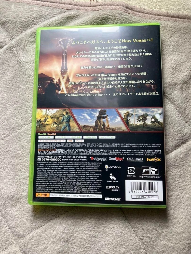 WELCOME TO 「Treasure Japan」 Product About Us Contact Us Featured categories Sale XBOX360 Fallout New Vegas Role-playing Video game software Japanese ver. USED Product Description CONDITION : This game is JAPANESE VERSION. To play,it requires JAPANESE game system. We cannot guarantee the backup battery. Shipping We only ship to ebay registered address. Shippig from Japan with Tracking Number & Insurance. We usually ship out your order within 1-5 working days after receiving your payment. We ship some items by Japan post or DHL or FedEx. Payments Please pay within 5 days after auction is finished. Please note that if payment is not confirmed within 5 days of placing your order, it will be cancelled. International Buyers - Please Note: Import duties, taxes, and charges are not included in the item price or shipping cost. These charges are the buyer's responsibility. Please check with your country's customs office to determine what these additional costs will be prior to bidding or buying. About our products All products in our shop are Japanese versions. Please confirm that the game console or game software you are using is in the Japan region before purchasing. Products not listed in the shop may be available for order. We also accept bulk orders, so please feel free to contact us.