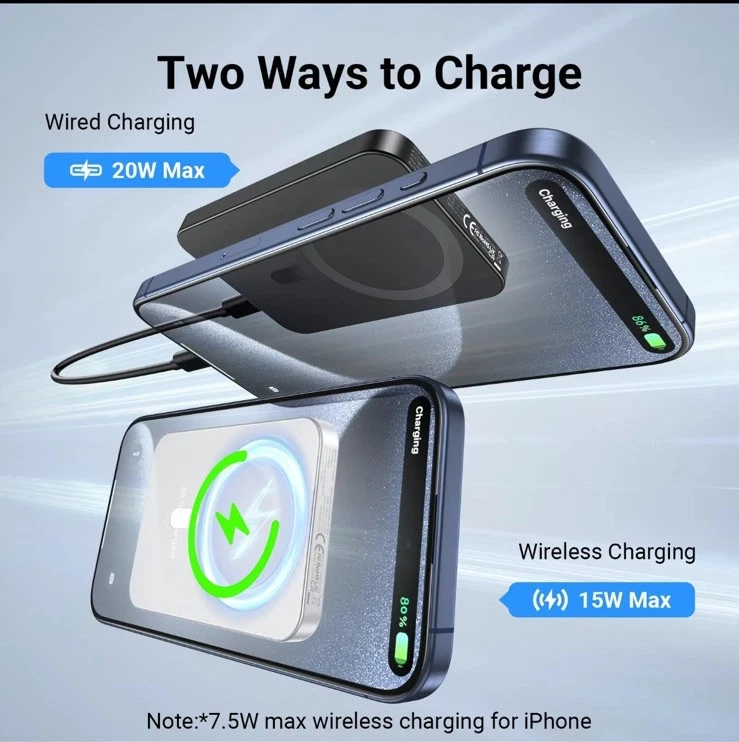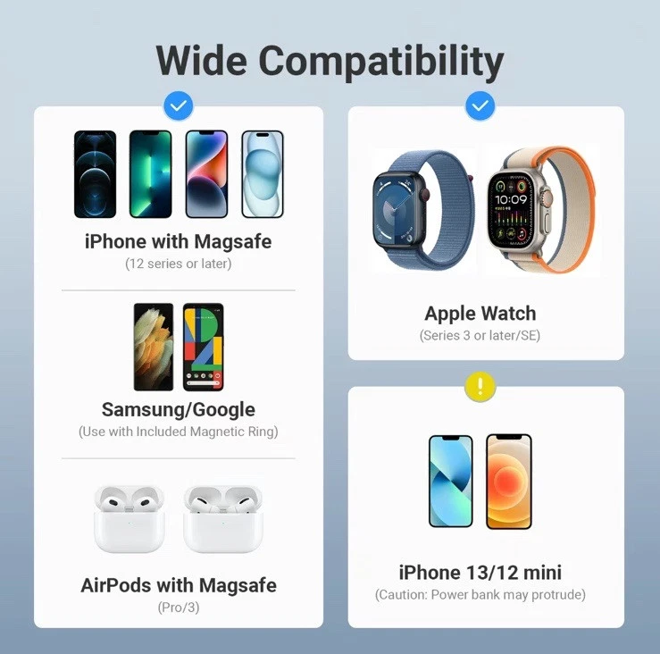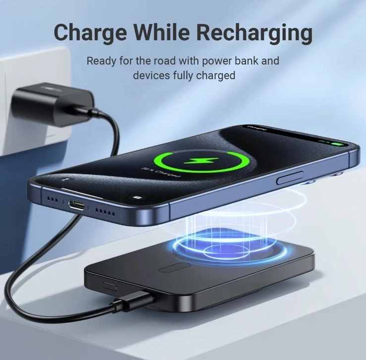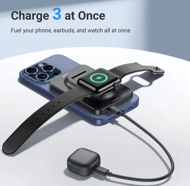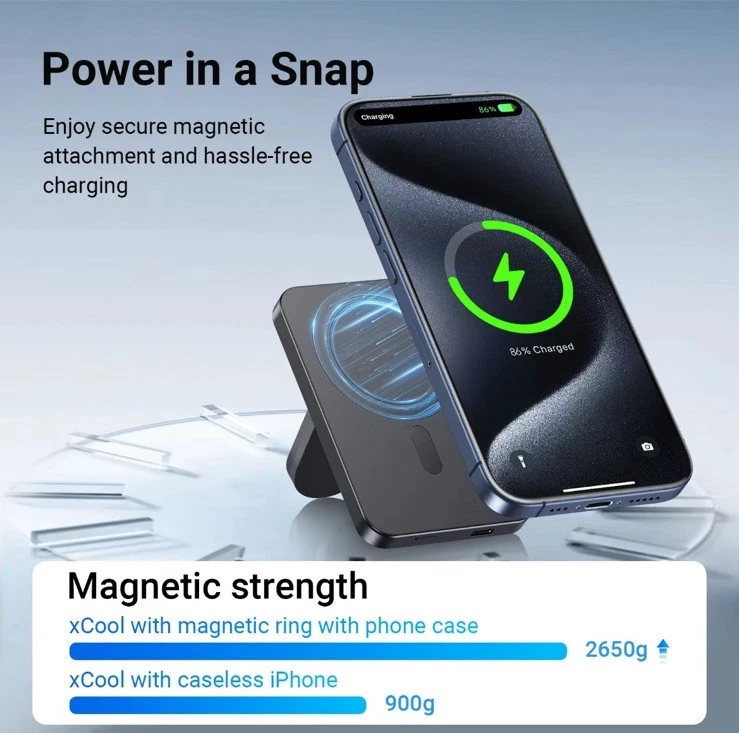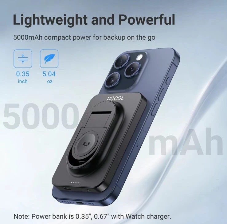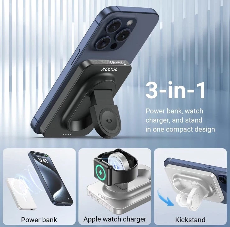 XCOOL SNAPSTAND MAGNETIC 3-n-1 wireless power bank is a slim and lightweight device designed for Apple devices. It features a kickstand, magnetic attachment, and wireless charging capability for Apple Watch. With a capacity of 5000mAh and 20w voltage, it is compatible with Apple iPhone 14 Pro Max, 14 Pro, 13 Pro Max, and 13 Pro models. The power bank has a sleek black finish and offers wireless and USB-C connectivity options.