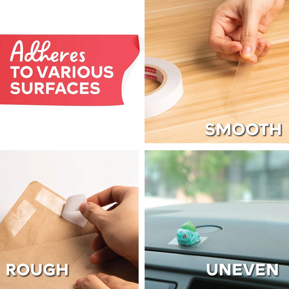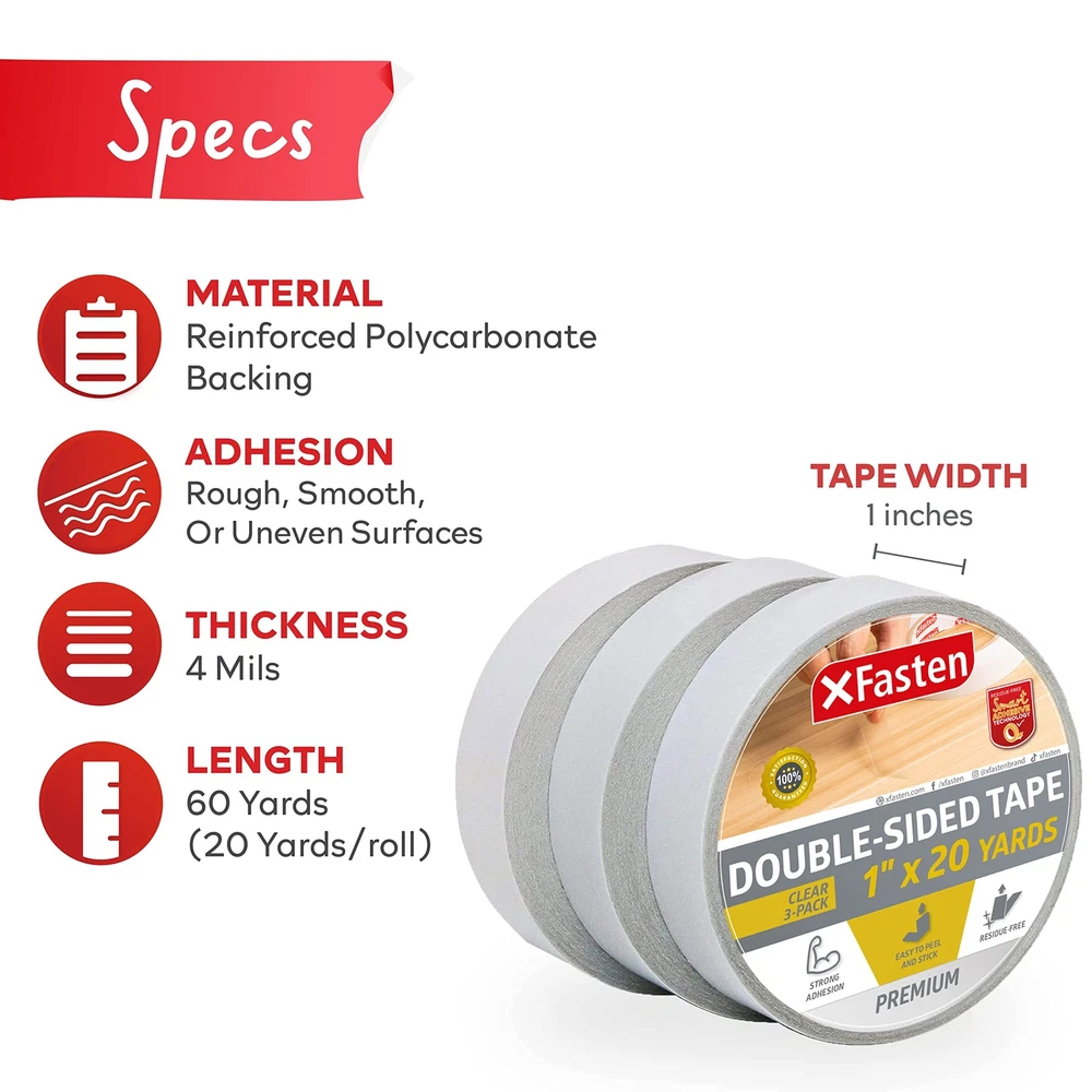 XFasten Double Sided Tape Clear, Removable, 1-Inch by 20-Yards, Pack of 3 Ide... Product Overview ABOUT THE XFASTEN CLEAR DOUBLE-SIDED TAPE The XFasten Clear Double Sided Tape is proud to have the best adhesive material that balances out adhesive bonding power and the ability to not damage surface finishes and to not leave any sticky residues. It adheres to almost all surfaces, making this double sided tape a must-have product for many households in America. Read more COMPATIBLE WITH WOOD CARPET PAPER MARBLE Read more WHERE CAN YOU USE THE XFASTEN CLEAR DOUBLE-SIDED TAPE? Woodworking and guitar makingCNC MachinesArts and Crafts Projects Pet Anti-Scratch Shield and Training Tape for Furniture and Leather SeatsPreventing carpets from slidingMounting light objects on wallsCloth and dress tape alternativeHeel protection for sandals and shoes without using socks OTHER USEFUL FEATURES High Tensile Strength Strong Adhesion Clear Adhesive Yellowing Resistant Easy to Install Read more KEY FEATURES ADHERES TO VARIOUS SURFACES The XFasten Clear Double-Sided Tape adheres to smooth, rough as well as uneven and corrugated surfaces - perfect for other industrial hobby activities and purposes that require stable adhesion. CRYSTAL CLEAR AND RESISTS YELLOWING The XFasten Clear Double-Sided is perfect for furniture applications as the color and texture beneath it can still be displayed clearly. It also resists curling, unnecessary splitting and shredding. Easy to pull out of the roll, cut and install. RESISTANT TO UV, HEAT, AND MOISTURE Resistant to UV, heat, and moisture, the XFasten Clear Double-Sided Tape is a reliable, all-rounder tape that is perfect for both indoor and outdoor applications. MULTIPURPOSE The XFasten Clear Double-Sided Tape is ideal for surface protection of leather seats, sofas and furniture from pet scratches, sealing, light repairing, and other adhesion applications. Read more XFasten Double-Sided Tape 1.5 x 15 Yards XFasten Easy Tear Double Sided Tape, 2" x 30 Yards XFasten Extra Sticky Double Sided Tape, 3/4" x 15 Yards (3-Pack) XFasten Double Sided Tape w/ Dispenser, 3/4" x 500" (8-Pack) XFasten Double Sided Strips 1.5" x 10" (50-Pack) XFasten Anti-Scratch Cat Training Tape, 2.5" x 15 Yards Color White White White Clear White Clear Item Weight 0.8 ounces 1.07 pounds 12.5 ounces 1.11 pounds 7.8 ounces 8.8 ounces Features Reliable Crystal Clear Transparent Double Sided Tape: Adheres to smooth, rough as well as uneven and corrugated surfaces- perfect for adhering transparent runners on floors, adhering laminated and transparent sheets on walls, CNC machine woodworking, guitar making and other industrial hobby activities that require stable adhesion. Ideal as a Gift Wrap Tape, Holding Carpets, and Woodworking EMPOWERS THE AVERAGE AMERICAN HOMEOWNER to come up with NEAT and PRO-LEVEL APPLICATIONS all thanks to its clear surface and mess-free installation. This double sided sticky tape offers medium duty adhesion and is removable making it ideal for DECORATING EVENTS ON TEMPORARY SPACES such as auditoriums, churches, conference rooms, classrooms, apartments and other locations where the tape needs to be removed later. Ideal for surface protection of leather seats, sofas and furniture from pet scratches, sealing, light repairing, and other adhesion applications. CRYSTAL CLEAR AND RESISTS YELLOWINGmaking it perfect for furniture applications as the color and texture beneath it can still be displayed clearly. Resists curling, unnecessary splitting and shredding. Easy to pull out of the roll, cut and install. Manageable and is resistant to UV, heat and moisturemaking this tape an all-rounder in both indoor and outdoor applications. Details Brand: ‎XFasten Color: ‎Yellow,Clear Material: ‎Polyethylene Terephthalate Number of Items: ‎3 Size: ‎1-Inch by 20-Yard Compatible Material: ‎Paper,Decorating,Furniture,Industrial,Leather Manufacturer: ‎XFasten Item Weight: ‎0.8 ounces Product Dimensions: ‎3 x 4.4 x 4.4 inches Item model number: ‎DSTC120P3 Is Discontinued By Manufacturer: ‎No Material Type: ‎Polyethylene Terephthalate Manufacturer Part Number: ‎DSTC120P3 Quality Products Have peace of mind knowing that your order will arrive original factory sealed packaging. That means that you'll have the full force of the manufacturer's warranty to protect your purchase. Fast and Free Shipping You're already purchasing the item. Why pay additional for shipping, especially slow shipping? We get your order shipped out and delivered to your doorstep as quickly as possible. Commitment We are committed to making sure that you leave this transaction satisfied. That means having access to real people that get your questions and concerns answered quickly. Give us a shot and we will make sure that you will look to us again!