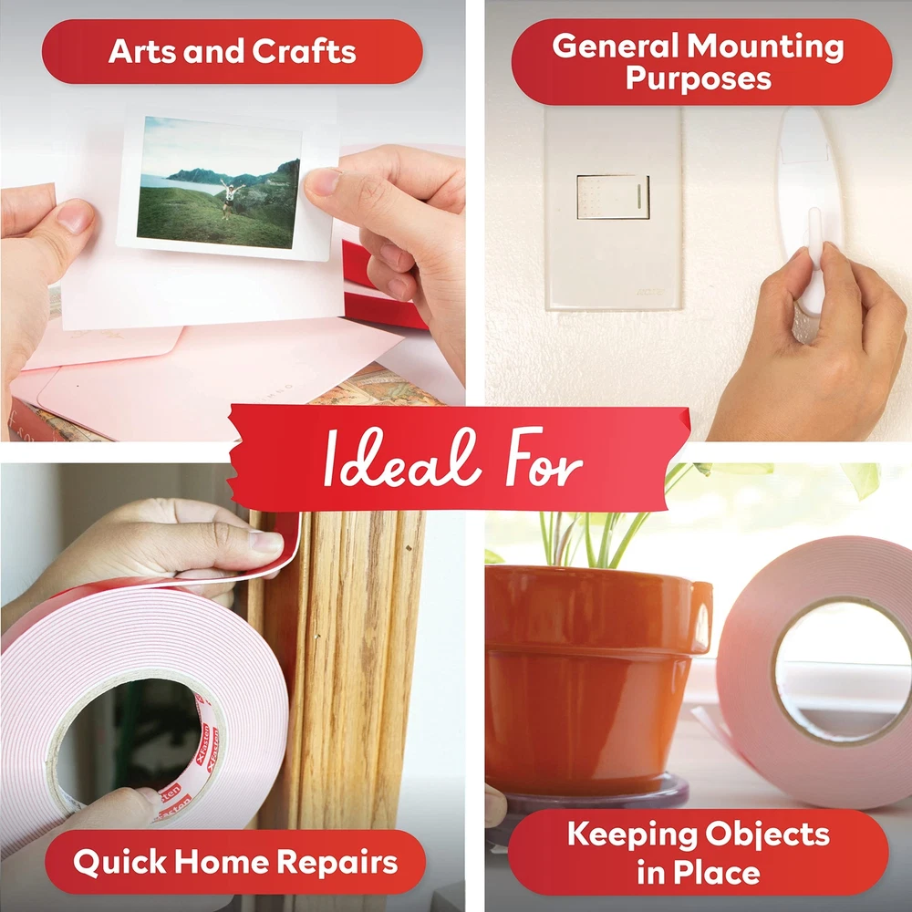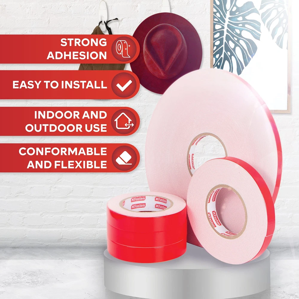 XFasten Double Sided Tape Foam Mounting Tape, 3/4-Inch x 350-Inch Product Overview ABOUT THE XFASTEN DOUBLE-SIDED FOAM MOUNTING TAPE The XFasten Double Sided Foam Mounting Tape is an efficient exterior and interior mounting tape that can mount objects up to 3 pounds together per square inch of tape in a long term basis. It works on both even and uneven surfaces. Where it shines is on exterior use where it performs better compared to other leading brands on textured, rough, and uneven surfaces. Read more COMPATIBLE WITH TEXTURED DRYWALL CONCRETE WOOD CARTON Read more WHERE CAN YOU USE THE XFASTEN DOUBLE-SIDED ACRYLIC MOUNTING TAPE? Perfect for layering on greeting cards, DIYs and other arts and crafts projects. It adds an extra dimension to greeting cards, taking your art into a whole new level.Mounting photos and poster on the wall. Mounting bathroom accessories and home decors. Mounting light objects such as nameplates and exterior signage on bricks, concrete and other rough surfaces. Can be used as a noise cancellation device in between doors to prevent loud banging noise when the door is closed. OTHER USEFUL FEATURES Residue-Free Strong Adhesion High Durability High Weight Holding Capacity Read more KEY FEATURES PERFECT SOLUTION TO MOUNT OBJECTS ON WALLS The XFasten Double-Sided Foam Mounting Tape is a versatile replacement for bolts and screws on even and uneven surfaces for interior or exterior use. WORKS ON VARIOUS SURFACES With its unparalleled versatility, the XFasten Double-Sided Foam Mounting Tape fares well on uneven, irregular or highly textured surfaces such as cement, brick and concrete.. IDEAL FOR CRAFTERS If you love arts and crafts, the XFasten Double-Sided Foam Mounting Tape is for you. It works well for layering rubber stamp projects, cards, invitations and other arts and crafts projects. EASY TO INSTALL The XFasten Double-Sided Foam Mounting Tape is an instant and mess-free tape due to its easy-to-peel backing and high sheer resistant adhesive. Read more XFasten Double-Sided Acrylic Mounting Tape, 1" x 450" XFasten Double-Sided Foam Mounting Tape, 1" x 150" XFasten Double-Sided Foam Mounting Tape, 1/2" x 36 Yards XFasten Double-Sided Mounting Dots 1" (Pack of 80) XFasten Double-Sided Mounting Squares 1 " (Pack of 80) XFasten Double-Sided Tape, 1.5" x 15 Yards Color Clear White White White White White Material Type Acrylic Adhesive Compressible and Conformable Urethane Foam Compressible and Conformable Urethane Foam Compressible Foam Material Compressible Foam Material Poly-carbonate Film Tape Item Weight 10.4 ounces 1.6 ounces 4 ounces 0.8 ounces 0.64 ounces 0.8 ounces Features Versatile replacement for bolts and screws on even and uneven surfaces for interior or exterior use. Ideal for mounting accessories, photos, paintings, frames and decors in the kitchen or bathroom. Works well for layering rubber stamp projects, cards, invitations and other arts and crafts projects. Fares well on uneven, irregular or highly textured surfaces such as cement, brick and concrete. Instant and mess-free bond due to its easy-to-peel backing and high sheer resistant adhesive. Details Manufacturer: XFasten Brand: XFasten Item Weight: 1.76 ounces Product Dimensions: 350 x 0.75 x 0.75 inches Item model number: OP-6163 Is Discontinued By Manufacturer: No Material Type: Foam,Rubber Number of Items: 1 Manufacturer Part Number: FMT350 Quality Products Have peace of mind knowing that your order will arrive original factory sealed packaging. That means that you'll have the full force of the manufacturer's warranty to protect your purchase. Fast and Free Shipping You're already purchasing the item. Why pay additional for shipping, especially slow shipping? We get your order shipped out and delivered to your doorstep as quickly as possible. Commitment We are committed to making sure that you leave this transaction satisfied. That means having access to real people that get your questions and concerns answered quickly. Give us a shot and we will make sure that you will look to us again!