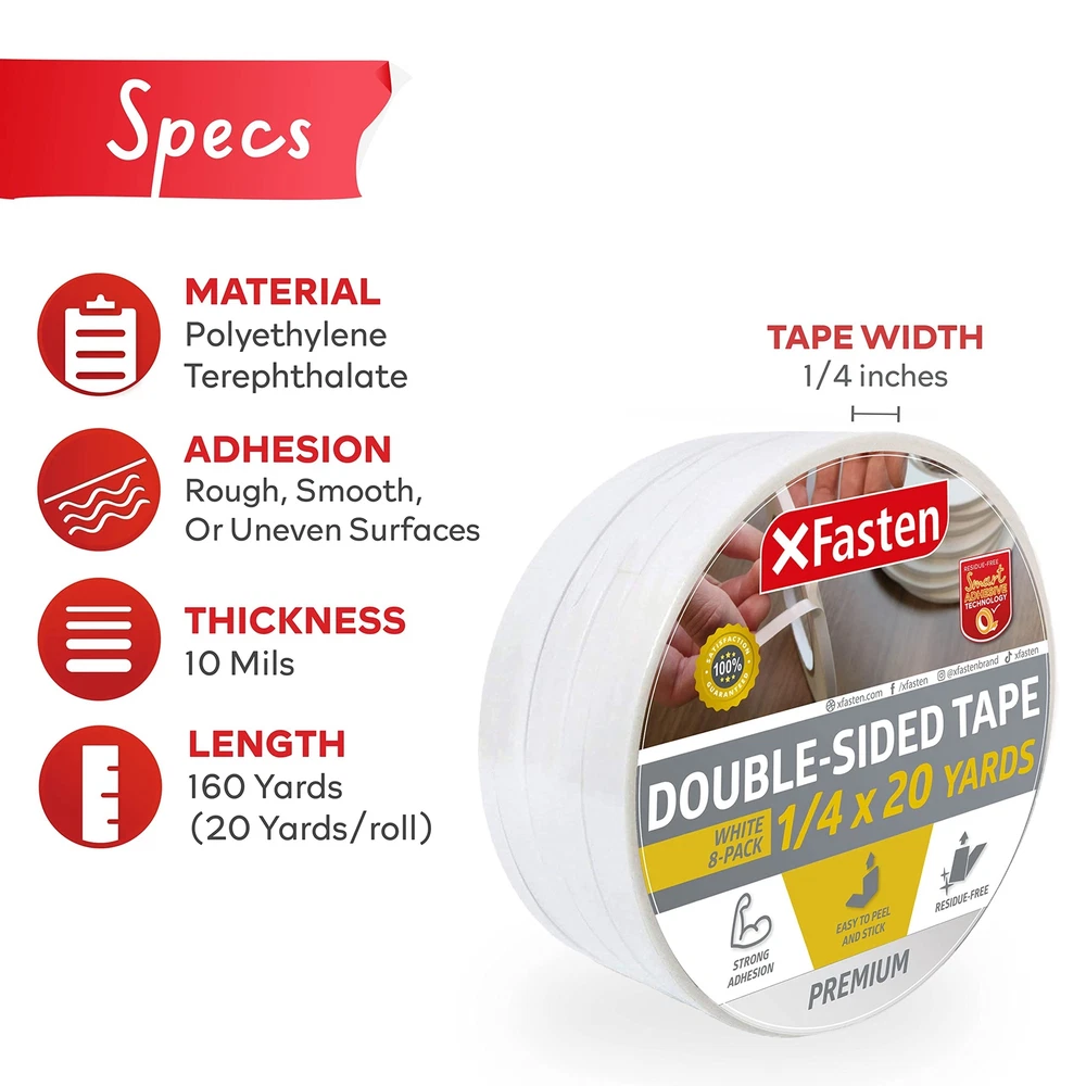 XFasten Double Sided Tape, Removable, 1/4-Inch by 20-Yards, Pack of 8 Ideal a... Product Overview Size: 1/4-Inch x 20-Yards (8-Pack) Read more The XFasten White Double-Sided Tape adheres to smooth, rough as well as uneven, and corrugated surfaces - perfect for other industrial hobby activities and purposes that require stable adhesion. It has the perfect balance of strength and gentleness to even the most delicate surfaces. The XFasten White Double-Sided is UV resistant, humidity, heat, moisture and extreme temperatures. All-rounder tape that is perfect for both indoor and outdoor applications. The XFasten White Double-Sided Tape is ideal for surface protection of leather seats, sofas, and furniture from pet scratches, sealing, light repairing, and other adhesion applications. The XFasten White Double-Sided Tape sports a durable nylon-cotton cloth inside layer sandwiched with a strong adhesive on both sides.Best of all, it doesn't leave any residues behind. Read more Versatility and Multi Purpose Be mindful of different surfaces - There are different double sided tape for different applications and surfaces, so make sure to check if your adhesive is compatible with the surface you will adhere to. The XFasten Double Sided Tape is compatible with most surface materials. Take your environment into consideration - Consider the type of environment where you will be using the double sided tape. You should know if the place has a low temperature or hot and wet conditions. Most of XFasten’s Double Sided Tapes are temperature- resistant. Ensure that the area is clean - Before installation, you have to make sure that the surface is free of lint, dirt, and dust because it can significantly lessen the bonding strength of the adhesive. Read more XFasten Double Sided Tape XFasten Double Sided Tape XFasten Double Sided Tape XFasten Double Sided Tape XFasten Double Sided Tape XFasten Double Sided Tape Size 2" x 30 Yards 1.5" x 15 Yards 1/2" x 20 Yards 1/4" x 20 Yards 2" x 15 Yards 3/4" x 15 Yards Usage Ideal for surface protection from pet scratches,sealing, repairing, and other mounting applications Ideal for surface protection from pet scratches,sealing, repairing, and other mounting applications Ideal for surface protection from pet scratches,sealing, repairing, and other mounting applications Ideal for surface protection from pet scratches,sealing, repairing, and other mounting applications Ideal for surface protection from pet scratches,sealing, repairing, and other mounting applications Ideal for surface protection from pet scratches,sealing, repairing, and other mounting applications Material Type Fabric Nylon-Cotton Reinforced Polycarbonate backing Reinforced Polycarbonate backing Double Sided Fabric Adhesive Strips Double Sided Fabric Adhesive Strips Residue-Free ✓ ✓ ✓ ✓ ✓ ✓ Double-Sided ✓ ✓ ✓ ✓ ✓ ✓ Color White White White White Cream White Cream White Quantity Single Pack Single Pack 6 pack 8 pack Single 3 pack Features Durable Double Sided Tape: Adheres to smooth, rough as well as uneven surfaces- perfect for CNC machine wood working, guitar making and other industrial hobby activities that require stable adhesion. Comes in a pack of 8, giving you the best value for your money. Ideal as a Gift Wrap Tape, Holding Carpets, and Woodworking Adhesive is extremely strong but is still easy to remove, cut and peel by hand. Ideal for surface protection of leather seats, sofas and furniture from pet scratches, sealing, light repairing, and other adhesion applications. Will not leave a sticky residue when removed and will not chip-off surface paint finishing. Weather-resistant double sided duct tape: resists moisture, humidity, UV, and extreme temperatures. Details Brand: ‎XFasten Color: ‎White Material: ‎Poly-carbonate Film Tape Number of Items: ‎8 Size: ‎1/4-Inch x 20-Yards (8-Pack) Compatible Material: ‎Wood,furniture,industrial,leather Manufacturer: ‎XFasten Item Weight: ‎0.9 ounces Product Dimensions: ‎4.72 x 4.72 x 1.89 inches Item model number: ‎DST1420P8 Is Discontinued By Manufacturer: ‎No Material Type: ‎Poly-carbonate Film Tape Manufacturer Part Number: ‎DST1420P8 Quality Products Have peace of mind knowing that your order will arrive original factory sealed packaging. That means that you'll have the full force of the manufacturer's warranty to protect your purchase. Fast and Free Shipping You're already purchasing the item. Why pay additional for shipping, especially slow shipping? We get your order shipped out and delivered to your doorstep as quickly as possible. Commitment We are committed to making sure that you leave this transaction satisfied. That means having access to real people that get your questions and concerns answered quickly. Give us a shot and we will make sure that you will look to us again!